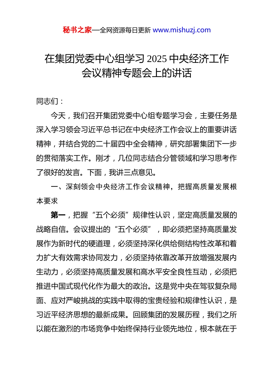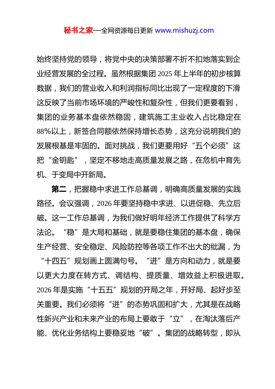 秘书之家—全网资源每日更新 www.mishuzj.com在集团党委中心组学习 2025 中央经济工作会议精神专题会上的讲话 同志们:今天,我们召开集团党委中心组专题学习会,主要任务是深入学习领会习近平总书记在中央经济工作会议上的重要讲话精神,并结合党的二十届四中全会精神,研究部署集团下一步的贯彻落实工作。刚才,几位同志结合分管领域和学习思考作了很好的发言。下面,我讲三点意见。一、深刻领会中央经济工作会议精神,把握高质量发展根本要求第一,把握“五个必须”规律性认识,坚定高质量发展的战略自信。会议提出的“五个必须”,即必须把坚持高质量发展作为新时代的硬道理,必须坚持深化供给侧结构性改革和着力扩大有效需求协同发力,必须坚持依靠改革开放增强发展内生动力,必须坚持高质量发展和高水平安全良性互动,必须把推进中国式现代化作为最大的政治。这是党中央在驾驭复杂局面、应对严峻挑战的实践中取得的宝贵经验和规律性认识,是习近平经济思想的最新成果。回顾集团的发展历程,我们之所以能在激烈的市场竞争中始终保持行业领先地位,根本就在于秘书之家—全网资源每日更新 www.mishuzj.com始终坚持党的领导,将党中央的决策部署不折不扣地落实到企业经营发展的全过程。虽然根据集团 2025 年上半年的初步核算数据,我们的营业收入和利润指标同比出现了一定程度的下滑这反映了当前市场环境的严峻性和复杂性,但我们更要看到,集团的业务基本盘依然稳固,建筑施工主业收入占比稳定在88%以上,新签合同额依然保持增长态势,这充分说明我们的发展根基是牢固的。面对挑战,我们更要用好“五个必须”这把“金钥匙”,坚定不移地走高质量发展之路,在危机中育先机、于变局中开新局。第二,把握稳中求进工作总基调,明确高质量发展的实践路径。会议强调,2026 年要坚持稳中求进、以进促稳、先立后破。这一工作总基调,为我们做好明年经济工作提供了科学方法论。“稳”是大局和基础,就是要稳住集团的基本盘,确保生产经营、安全稳定、风险防控等各项工作不出大的纰漏,为“十四五”规划画上圆满句号。“进”是方向和动力,就是要以更大力度在转方式、调结构、提质量、增效益上积极进取。2026 年是实施“十五五”规划的开局之年,开好局、起好步至关重要。我们必须将“进”的态势巩固和扩大,尤其是在战略性新兴产业和未来产业的布局上要敢于“立”,在淘汰落后产能、优化业务结构上要稳妥地“破”。集团的战略转型,即从秘书之家—全网资源每日更新 www.mishuzj.com“工程承包商”向“建筑全生命周期服务商”的转变就是我们最大的“进”与“立”。全集团上下必须统一思想,围绕这一核心战略,谋划好“十五五”期间的发展蓝图,形成可操作、可量化、可落地的路线图和施工图。第三,把握发展新质生产力核心要义,找准高质量发展的核心动能。党的二十届四中全会明确提出要发展新质生产力,本次中央经济工作会议再次强调了其重要性。新质生产力,对我们建筑行业而言,核心就是以科技创新为主导,摆脱传统要素驱动的增长模式,实现产业的深度变革。这与集团长期坚持的科技创新战略高度契合。我们必须认识到,未来的竞争是科技的竞争,是创新能力的竞争。集团近年来持续加大研发投入,2025 年上半年研发投入已达 30.93 亿元,占营业收入比重接近3%,这为我们培育新质生产力奠定了坚实基础。我们推动的工业化、数字化、智能化、绿色化“四化融合”,自主研发的 50余款建筑机器人方阵以及在绿色建材、智能建造等领域的持续攻关都是我们发展新质生产力的具体实践。下一步,要将发展新质生产力作为“十五五”科技创新的首要任务,继续加大投入,力争在关键核心技术上取得更大突破,将科技创新这个“关键变量”转化为企业高质量发展的“最大增量”。二、找准会议精神与主责主业的结合点,服务国家战略全秘书之家—全网资源每日更新 www.mishuzj.com局学习贯彻中央经济工作会议精神,关键在于结合集团实际将其转化为推动企业发展的具体行动。我们必须胸怀“国之大者”,在服务国家和 XX 市发展大局中找准定位、展现担当。第一,聚焦扩大有效投资,在服务“投资止跌回...