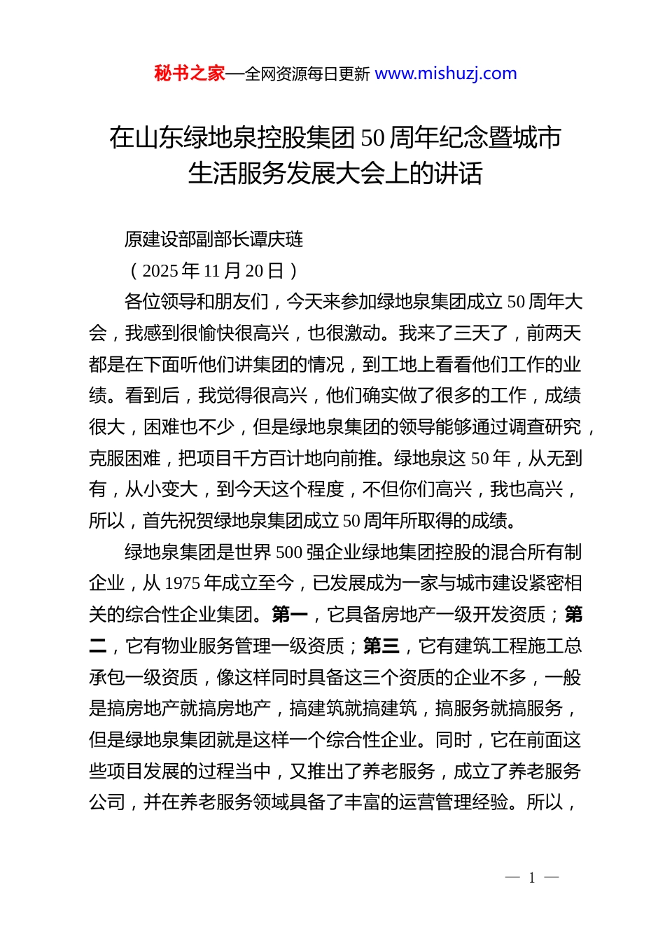 秘书之家—全网资源每日更新 www.mishuzj.com在山东绿地泉控股集团 50 周年纪念暨城市生活服务发展大会上的讲话原建设部副部长谭庆琏(2025 年 11 月 20 日)各位领导和朋友们,今天来参加绿地泉集团成立 50 周年大会,我感到很愉快很高兴,也很激动。我来了三天了,前两天都是在下面听他们讲集团的情况,到工地上看看他们工作的业绩。看到后,我觉得很高兴,他们确实做了很多的工作,成绩很大,困难也不少,但是绿地泉集团的领导能够通过调查研究,克服困难,把项目千方百计地向前推。绿地泉这 50 年,从无到有,从小变大,到今天这个程度,不但你们高兴,我也高兴,所以,首先祝贺绿地泉集团成立 50 周年所取得的成绩。绿地泉集团是世界 500 强企业绿地集团控股的混合所有制企业,从 1975 年成立至今,已发展成为一家与城市建设紧密相关的综合性企业集团。第一,它具备房地产一级开发资质;第二,它有物业服务管理一级资质;第三,它有建筑工程施工总承包一级资质,像这样同时具备这三个资质的企业不多,一般是搞房地产就搞房地产,搞建筑就搞建筑,搞服务就搞服务,但是绿地泉集团就是这样一个综合性企业。同时,它在前面这些项目发展的过程当中,又推出了养老服务,成立了养老服务公司,并在养老服务领域具备了丰富的运营管理经验。所以,— 1 —秘书之家—全网资源每日更新 www.mishuzj.com像绿地泉集团这样的企业,在我们社会上,在各个城市也很少有。我看了他们 50 年的成绩,到现场看了他们的美好生活服务中心,看了养老服务中心,我觉得都是很好的。绿地泉发展 50年了,刘岷董事长的眼光很长远,他讲的八个字非常好:永不满足、思变图强,这说明他的工作没有做完,还得继续下去,他这个精神是很不容易的。回看绿地泉集团走过的坎坷路程,刘岷董事长带领大家去克服困难,解决困难,继续前进是很不容易的。你看他现在穿得很好身姿很挺直,脸上带笑容,实际上他心里的苦楚都在他心里,不往外讲。他受了苦,解决了困难,前进了,到现在他不满足,还要继续干下去,要继续发展,这个精神值得我们学习。我们当过领导的人都知道,当领导不容易,很难的,所以刘岷董事长能坚持到现在,还有继续奋发图强的精神,我们应该表示鼓励。绿地泉集团从成立到现在 50 年了,它是 1975 年从济南市民用建筑统一建设办公室起步的,从无到有,从弱至强,现已发展成深耕齐鲁八城的现代化企业集团。50 年期间,累计开发建筑面积超 1800 万平方米,建设了一批精品住宅和高端商业项目,建设了 50 多所中小学和幼儿园,改造了 60 多公里城市道路,近几年来更是布局了 20 余家康养服务机构,所以,绿地泉这 50 年是踏踏实实走过来的。在这 50 年的发展过程中,绿地泉建设了一些有名的项目,比如,燕子山小区、佛山苑小区、— 2 —秘书之家—全网资源每日更新 www.mishuzj.com泉景•四季花园、绿地•海泊天沅、泰安绿地公馆、青岛绿地•凤栖澜玥等,特别是燕子山小区和佛山苑小区是全国有名的小区,荣获了联合国人居奖、国家优质工程银质奖、鲁班奖等多项荣誉,成为全国住宅建设及综合开发的典范。2009 年绿地泉集团转企改制,创新实行“一企两制”,成为山东省事业单位改制的典范。改制 16 年来,在绿地集团带领下,绿地泉集团累计实现营业收入 700 亿元,上交税金 80 亿元,为山东城市建设与经济高质量发展作出了积极贡献。成绩很大,但是刘岷董事长现在还是不满意,一方面,他要把现在的事情做好,另一方面,未来新的事情还要做好,比如集团重点项目稼轩文旅城。昨天,我们去看了稼轩文旅城现场,整体规划面积近一万亩,位于济南市新旧动能转换区,像雄安新区一样的地方,正在建设中。刘岷董事长的心思就是,要把山东在管的项目做好,同时要不断完善,而且现在除了在做房地产开发以外,还做康养工程,说明我们刘岷董事长和绿地泉集团看得比较远,能够把房地产开发、服务和康养事业结合在一起,不但要把已经成熟的工作做好,而且要开发新的业务工作。昨天我们去看了康养中心,真是不错,面积大概有5000 平方米,床位有 300 多个,康养服务和设...
