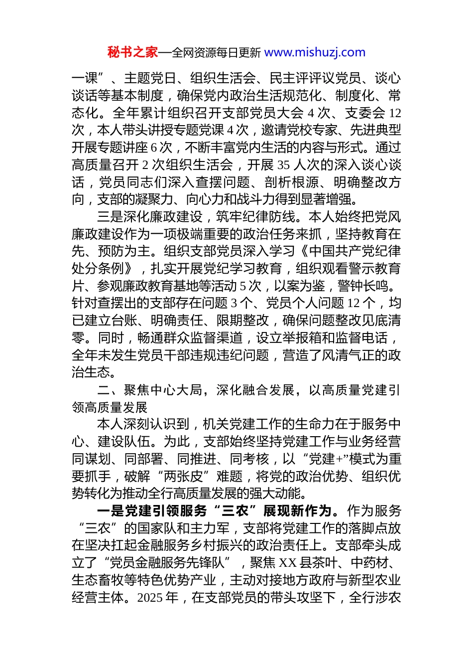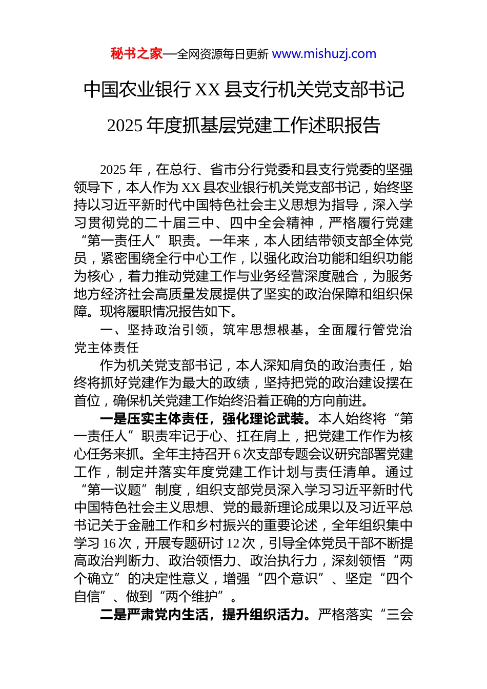 秘书之家—全网资源每日更新 www.mishuzj.com中国农业银行 XX 县支行机关党支部书记2025 年度抓基层党建工作述职报告2025 年,在总行、省市分行党委和县支行党委的坚强领导下,本人作为 XX 县农业银行机关党支部书记,始终坚持以习近平新时代中国特色社会主义思想为指导,深入学习贯彻党的二十届三中、四中全会精神,严格履行党建“第一责任人”职责。一年来,本人团结带领支部全体党员,紧密围绕全行中心工作,以强化政治功能和组织功能为核心,着力推动党建工作与业务经营深度融合,为服务地方经济社会高质量发展提供了坚实的政治保障和组织保障。现将履职情况报告如下。一、坚持政治引领,筑牢思想根基,全面履行管党治党主体责任作为机关党支部书记,本人深知肩负的政治责任,始终将抓好党建作为最大的政绩,坚持把党的政治建设摆在首位,确保机关党建工作始终沿着正确的方向前进。一是压实主体责任,强化理论武装。本人始终将“第一责任人”职责牢记于心、扛在肩上,把党建工作作为核心任务来抓。全年主持召开 6 次支部专题会议研究部署党建工作,制定并落实年度党建工作计划与责任清单。通过“第一议题”制度,组织支部党员深入学习习近平新时代中国特色社会主义思想、党的最新理论成果以及习近平总书记关于金融工作和乡村振兴的重要论述,全年组织集中学习 16 次,开展专题研讨 12 次,引导全体党员干部不断提高政治判断力、政治领悟力、政治执行力,深刻领悟“两个确立”的决定性意义,增强“四个意识”、坚定“四个自信”、做到“两个维护”。二是严肃党内生活,提升组织活力。严格落实“三会秘书之家—全网资源每日更新 www.mishuzj.com一课”、主题党日、组织生活会、民主评评议党员、谈心谈话等基本制度,确保党内政治生活规范化、制度化、常态化。全年累计组织召开支部党员大会 4 次、支委会 12次,本人带头讲授专题党课 4 次,邀请党校专家、先进典型开展专题讲座 6 次,不断丰富党内生活的内容与形式。通过高质量召开 2 次组织生活会,开展 35 人次的深入谈心谈话,党员同志们深入查摆问题、剖析根源、明确整改方向,支部的凝聚力、向心力和战斗力得到显著增强。三是深化廉政建设,筑牢纪律防线。本人始终把党风廉政建设作为一项极端重要的政治任务来抓,坚持教育在先、预防为主。组织支部党员深入学习《中国共产党纪律处分条例》,扎实开展党纪学习教育,组织观看警示教育片、参观廉政教育基地等活动 5 次,以案为鉴,警钟长鸣。针对查摆出的支部存在问题 3 个、党员个人问题 12 个,均已建立台账、明确责任、限期整改,确保问题整改见底清零。同时,畅通群众监督渠道,设立举报箱和监督电话,全年未发生党员干部违规违纪问题,营造了风清气正的政治生态。二、聚焦中心大局,深化融合发展,以高质量党建引领高质量发展本人深刻认识到,机关党建工作的生命力在于服务中心、建设队伍。为此,支部始终坚持党建工作与业务经营同谋划、同部署、同推进、同考核,以“党建+”模式为重要抓手,破解“两张皮”难题,将党的政治优势、组织优势转化为推动全行高质量发展的强大动能。一是党建引领服务“三农”展现新作为。作为服务“三农”的国家队和主力军,支部将党建工作的落脚点放在坚决扛起金融服务乡村振兴的政治责任上。支部牵头成立了“党员金融服务先锋队”,聚焦 XX 县茶叶、中药材、生态畜牧等特色优势产业,主动对接地方政府与新型农业经营主体。2025 年,在支部党员的带头攻坚下,全行涉农秘书之家—全网资源每日更新 www.mishuzj.com贷款投放额达到 12.5 亿元,较年初增长 15%,有力支持了地方特色产业发展壮大,为 XX 县巩固拓展脱贫攻坚成果、全面推进乡村振兴注入了强劲的金融活水。这一成绩的取得,正是支部将党建工作深度融入服务国家粮食安全和乡村振兴核心业务的生动体现。二是党建赋能业务经营实现新突破。支部坚持“围绕中心抓党建,抓好党建促发展”的理念,将党建工作融入业务发展的各环节、全过程。面对激烈的市场竞争环境,支部设立了“党员责任区”、“党员示范岗”,组织党员骨干成立营销突击队,在对公...