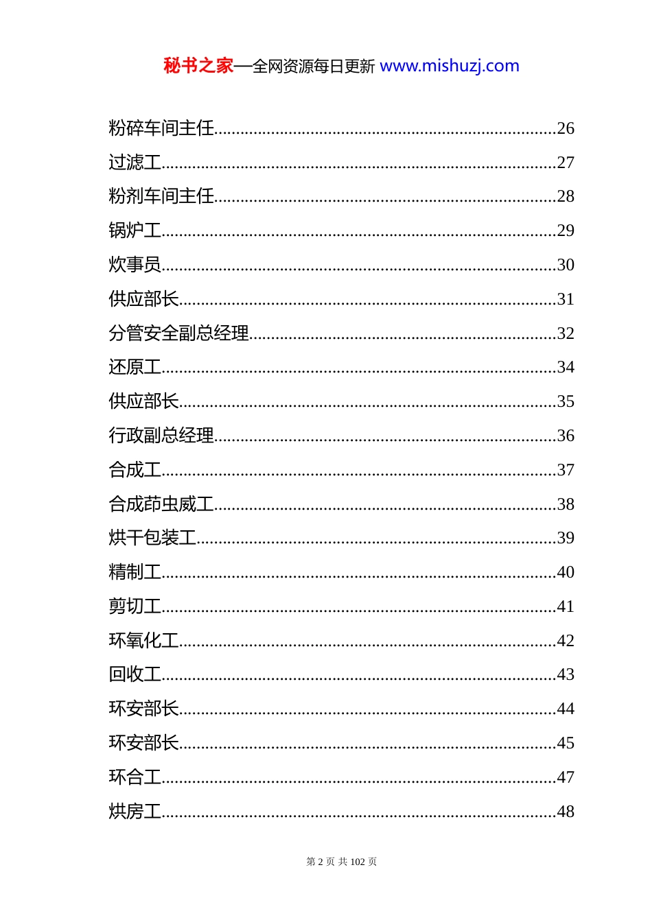 第 1 页 共 102 页秘书之家—全网资源每日更新 www.mishuzj.com目 录办公室主任 .................................................................................... 1 财务部长........................................................................................2保管员............................................................................................3财务会计........................................................................................5采购员............................................................................................6财务副总经理................................................................................7财务部长........................................................................................8叉车工............................................................................................9车间安全员..................................................................................10班组长..........................................................................................12办公室主任..................................................................................14安全员..........................................................................................16车间主任......................................................................................18电工..............................................................................................20二车间主任..................................................................................21成盐工..........................................................................................22粉碎工..........................................................................................24电焊工..........................................................................................25层层签订参考模板(多岗位汇编版)安全生产目标责任书2026第 2 页 共 102 页秘书之家—全网资源每日更新 www.mishuzj.com粉碎车间主任..............................................................................26过滤工..........................................................................................27粉剂车间主任..............................................................................28锅炉工..........................................................................................29炊事员..........................................................................................30供应部长......................................................................................31分管安全副总经理......................................................................32还原工..........................................................................................34供应部长......................................................................................35行政副总经理..............................................................................36合成工..........................................................................................37合成茚虫威工..............................................................................38烘干包装工..................................................................................39精制工..........................................................................................40剪切工.........................................................