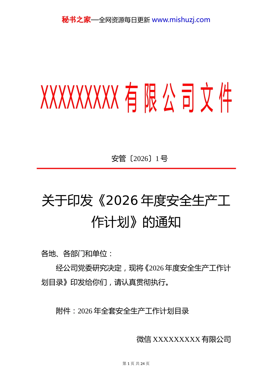 第 1 页 共 24 页秘书之家—全网资源每日更新 www.mishuzj.com2026 年度2026 年度全套安全生产工作计划参考模板第 1 页 共 24 页秘书之家—全网资源每日更新 www.mishuzj.comXXXXXXXXX 有 限 公 司 文 件安管〔2026〕1 号关于印发《2026 年度安全生产工作计划》的通知各地、各部门和单位:经公司党委研究决定,现将《2026 年度安全生产工作计划目录》印发给你们,请认真贯彻执行。附件:2026 年全套安全生产工作计划目录微信 XXXXXXXXX 有限公司第 2 页 共 24 页秘书之家—全网资源每日更新 www.mishuzj.com安全生产委员会办公室 2026 年 1 月 1 日附件:2026 年度全套安全生产工作计划目录序号年度计划内容备注1.安全生产工作总体计划2.安全教育培训计划3.安全生产费用使用计划4.公司应急预案演练计划5.安全检查计划6.消防年度工作计划7.职业危害防治计划和实施方案第 3 页 共 24 页秘书之家—全网资源每日更新 www.mishuzj.com一 2026 年安全生产工作总体计划一、指导思想以人为本,坚持“安全第一、预防为主、综合治理”的安全生产工作方针。以落实安全生产责任制、健全和完善各项安全生产规章制度,夯实安全管理基础为重点,大力加强安全生产机制建设,强化员工的技术培训与安全教育培训。二、工作目标杜绝死亡、重伤和特大、重大事故、控制一般安全事故发生,减少轻伤安全事故、一般事故。三、工作方针认真贯彻落实上级别领导部门安全生产工作意见,提高全员安全意识,完善安全生产责任制,强化现场管理,纠正习惯性违章行为,确保安全生产投入,查找并整改事故隐患,确保公司正常的安全生产秩序。四、主要工作:第 4 页 共 24 页秘书之家—全网资源每日更新 www.mishuzj.com1、加强对安全工作认识、落实责任,不断提高安全管理水平:(1)认真贯彻执行“安全第一、预防为主、综合治理”的安全生产工作方针,牢固树立安全生产“责任重于泰山”的思想观念,始终把安全生产工作放在心头,做到警钟长鸣,常抓不懈,消除事故隐患,防止事故发生。(2)认真贯彻落实《安全生产法》。认真贯彻落实安全生产的目标责任制管理,坚决贯彻落实层层签订安全目标责任书,落实到每个岗位、每个人。并实行“谁主管,谁负责;谁使用,谁负责;谁的岗位,谁负责;谁违章,谁负责”的管理原则,层层落实,加强监督,严格考核。加强安全目标责任制,落实部门主要负责人安全责任。(3)继续完善落实安全生产责任制,认真执行各项安全管理制度。加大检查监督力度,增强员工安全意识,把安全生产责任的落实始终贯穿于管理的每一个环节,实现安第 5 页 共 24 页秘书之家—全网资源每日更新 www.mishuzj.com全的全过程控制。2、加大安全教育力度,建设企业安全文化:强化安全教育在安全管理中的基础作用,提高全员安全意识和公司整体安全素质,大力培养具有较强安全意识、严谨工作作风、熟练生产技能的员工队伍。(1)坚持对新进公司员工三级安全教育,特殊工种人员保证 100%有效持证上岗。认真做好特殊工种的复审办证工作(2)加强员工的安全技术培训,使员工具有一定的安全技能和事故急救知识。免费资料关注公 众号:安全生产管理;坚持班前、班后会,及时掌握员工心理波动对安全工作造成的影响,做好预防。(3)认真组织好全国“安全生产月”活动,并以此为主线,开展丰富多彩的群众性安全宣传教育活动,营造浓郁的企业安全文化氛围,大力倡导以人为本的公司安全文化第 6 页 共 24 页秘书之家—全网资源每日更新 www.mishuzj.com理念。(4)各部门负责人和安全员每月必须主动参加安全会议或活动。会议或活动要以学习领会上级有关安全生产指示精神和相关的法律、法规为重点,结合公司的相关安全规定,积极开展安全宣传教育活动。(5)各部门每年至少要组织开展各工种安全技术操作规程培训及考试一次(新入职的员工坚持二次考核上岗制度,即每季度组织三个月内新入职员工安全测评,不合格人员重新进培训,合格后方可上岗)。(6)紧密配合安保科积极开展职工职业健康查体、岗位职业检测、防雷等检测活动,提高预防水平,杜绝或减...