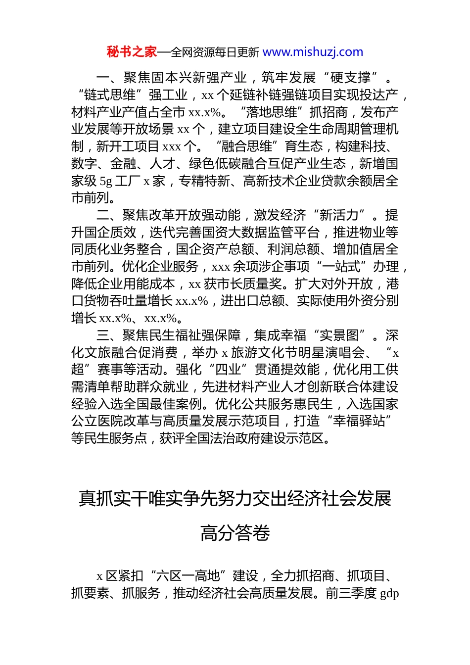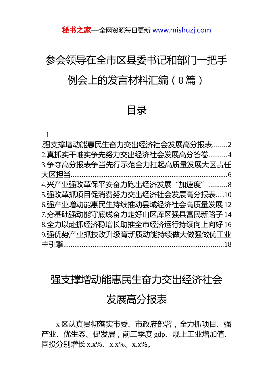 秘书之家—全网资源每日更新 www.mishuzj.com参会领导在全市区县委书记和部门一把手例会上的发言材料汇编(8 篇)目录1.强支撑增动能惠民生奋力交出经济社会发展高分报表........22.真抓实干唯实争先努力交出经济社会发展高分答卷..........43.争夺高分报表争当先行示范全力扛起高质量发展大区责任大区担当.....................................................................................64.兴产业强改革保平安奋力跑出经济发展“加速度”..........85.强改革抓项目促消费努力交出经济社会发展高分报表....106.强产业增动能惠民生持续推动县域经济社会高质量发展 127.夯基础强动能守底线奋力走好山区库区强县富民新路子 148.全力以赴抓经济稳增长助推全市经济运行持续向上向好 169.强优势产业抓技改升级育新质动能持续做大做强做优工业主引擎.......................................................................................18强支撑增动能惠民生奋力交出经济社会发展高分报表x 区认真贯彻落实市委、市政府部署,全力抓项目、强产业、优生态、促发展,前三季度 gdp、规上工业增加值、固投分别增长 x.x%、x.x%、x.x%。秘书之家—全网资源每日更新 www.mishuzj.com一、聚焦固本兴新强产业,筑牢发展“硬支撑”。“链式思维”强工业,xx 个延链补链强链项目实现投达产,材料产业产值占全市 xx.x%。“落地思维”抓招商,发布产业发展等开放场景 xx 个,建立项目建设全生命周期管理机制,新开工项目 xxx 个。“融合思维”育生态,构建科技、数字、金融、人才、绿色低碳融合互促产业生态,新增国家级 5g 工厂 x 家,专精特新、高新技术企业贷款余额居全市前列。二、聚焦改革开放强动能,激发经济“新活力”。提升国企质效,迭代完善国资大数据监管平台,推进物业等同质化业务整合,国企资产总额、利润总额、增加值居全市前列。优化企业服务,xxx 余项涉企事项“一站式”办理,降低企业用能成本,xx 获市长质量奖。扩大对外开放,港口货物吞吐量增长 xx.x%,进出口总额、实际使用外资分别增长 xx.x%、xx.x%。三、聚焦民生福祉强保障,集成幸福“实景图”。深化文旅融合促消费,举办 x 旅游文化节明星演唱会、“x超”赛事等活动。强化“四业”贯通提效能,优化用工供需清单帮助群众就业,先进材料产业人才创新联合体建设经验入选全国最佳案例。优化公共服务惠民生,入选国家公立医院改革与高质量发展示范项目,打造“幸福驿站”等民生服务点,获评全国法治政府建设示范区。真抓实干唯实争先努力交出经济社会发展高分答卷x 区紧扣“六区一高地”建设,全力抓招商、抓项目、抓要素、抓服务,推动经济社会高质量发展。前三季度 gdp秘书之家—全网资源每日更新 www.mishuzj.com增长 x.x%,规上工业增加值增长 x.x%,社零增长 x.x%。一、产业发展呈现新态势。拓展产业空间,提速开发 x平方公里建桥园区拓展区,加快建设 xx 万平方米标准厂房,焕新提升 xx 商圈。加快招大引强,签约项目 xxx 个,xx 商贸签约落地,a 股上市企业遥望科技、怡亚通入驻,天猫 xx总部落地运营。推动聚链成群,xx 科技竣工投产,xx 项目基本完工,xx 等 xxx 个项目顺利推进。二、改革创新取得新突破。加力培育改革成果,入选全国全市典型案例 xx 个,“大综合一体化”行政执法改革获司法部肯定。加速构筑创新优势,新入库科技型企业增长 xx.x%,x 家企业获市科技进步一等奖,研发投入强度、综合创新指数居全市前列,入选科技部典型案例 x 个。加快推进数智赋能,工程智管入选 ai+综合场景清单,x 个场景入选“应用场景领跑者”榜单,数字 xx 基本能力建设取得积极进展。三、城市提升展现新面貌。加快城市有机更新,高标准规划建设“未来社区·活力新城”,建成 x.xx 公里环商圈步道,城市更新获《新闻联播》单条刊播。推动城市形象出新,举办半程马拉松、第 xx 届中国(xx)火锅美食文化节等赛事节会,游客接待量增长 xx%。致力生活品质焕新,成立 xx 基金,引进 xx 即将营业,xx 医院建成投用。争夺高分报表争当先行示范全力...
