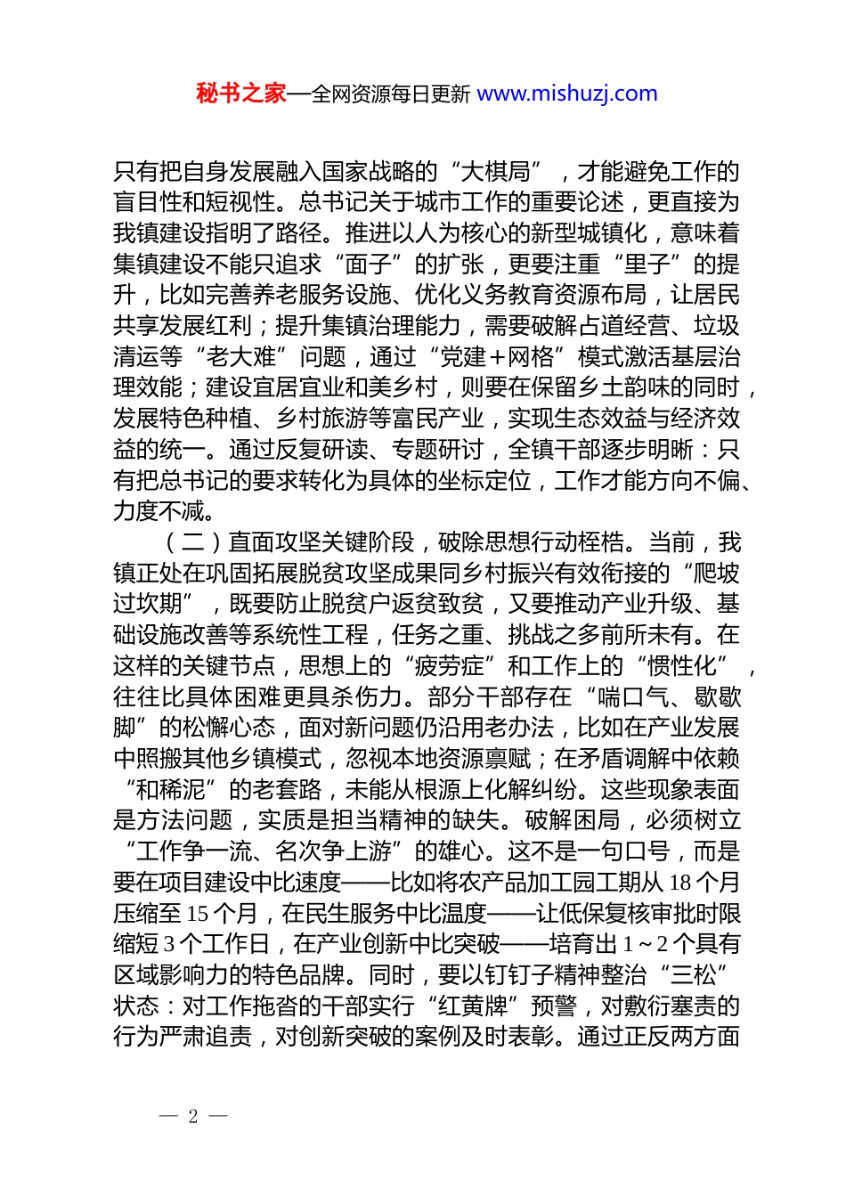 秘书之家—全网资源每日更新 www.mishuzj.com在 2025 年镇党委理论学习中心组集中学习暨当前重点工作安排部署会议上的讲话同志们:今天,我们召开全镇干部大会,主要有两个目的:一是组织一次集中学习,深入领会习近平总书记的重要讲话精神,用先进思想理论武装头脑、统一认识;二是全面分析当前我镇发展面临的形势和任务,对下一阶段的重点工作进行再动员、再部署、再压实。刚才,我们共同学习了习近平总书记在中央城市工作会议上的重要讲话精神,以及《求是》杂志上发表的《坚定不移推进高水平对外开放》这篇重要文章。希望同志们能够深刻领会,结合我镇实际,认真思考,抓好贯彻落实。下面,我讲三点意见。一、深化思想认识,以理论清醒确保行动坚定理论是行动的先导,思想是前进的旗帜。当前,全省上下正在深入开展“三抓三促”行动,其核心要义就是抓学习促提升、抓执行促落实、抓效能促发展。我们今天组织集中学习,就是要将“抓学习促提升”摆在首位,引导全镇广大干部职工在学深悟透中提高政治站位,在常学常新中增强能力本领。(一)深学细悟精神要义,找准基层发展坐标。习近平总书记的重要文章,以宏阔的视野勾勒出国家发展的时代蓝图,字里行间蕴含着对全局工作的战略指引,为基层工作提供了根本遵循。作为乡镇一级,虽身处治理末梢,但必须跳出“一亩三分地”的思维局限,以“国之大者”的站位解读政策内涵。高水平对外开放是构建新发展格局的重要引擎,这要求我们深刻思考我镇在区域经济网络中的独特价值——是作为农产品供应基地衔接城市市场,还是依托区位优势打造区域物流节点?— 1 —秘书之家—全网资源每日更新 www.mishuzj.com只有把自身发展融入国家战略的“大棋局”,才能避免工作的盲目性和短视性。总书记关于城市工作的重要论述,更直接为我镇建设指明了路径。推进以人为核心的新型城镇化,意味着集镇建设不能只追求“面子”的扩张,更要注重“里子”的提升,比如完善养老服务设施、优化义务教育资源布局,让居民共享发展红利;提升集镇治理能力,需要破解占道经营、垃圾清运等“老大难”问题,通过“党建+网格”模式激活基层治理效能;建设宜居宜业和美乡村,则要在保留乡土韵味的同时,发展特色种植、乡村旅游等富民产业,实现生态效益与经济效益的统一。通过反复研读、专题研讨,全镇干部逐步明晰:只有把总书记的要求转化为具体的坐标定位,工作才能方向不偏、力度不减。(二)直面攻坚关键阶段,破除思想行动桎梏。当前,我镇正处在巩固拓展脱贫攻坚成果同乡村振兴有效衔接的“爬坡过坎期”,既要防止脱贫户返贫致贫,又要推动产业升级、基础设施改善等系统性工程,任务之重、挑战之多前所未有。在这样的关键节点,思想上的“疲劳症”和工作上的“惯性化”,往往比具体困难更具杀伤力。部分干部存在“喘口气、歇歇脚”的松懈心态,面对新问题仍沿用老办法,比如在产业发展中照搬其他乡镇模式,忽视本地资源禀赋;在矛盾调解中依赖“和稀泥”的老套路,未能从根源上化解纠纷。这些现象表面是方法问题,实质是担当精神的缺失。破解困局,必须树立“工作争一流、名次争上游”的雄心。这不是一句口号,而是要在项目建设中比速度——比如将农产品加工园工期从 18 个月压缩至 15 个月,在民生服务中比温度——让低保复核审批时限缩短 3 个工作日,在产业创新中比突破——培育出 1~2 个具有区域影响力的特色品牌。同时,要以钉钉子精神整治“三松”状态:对工作拖沓的干部实行“红黄牌”预警,对敷衍塞责的行为严肃追责,对创新突破的案例及时表彰。通过正反两方面— 2 —秘书之家—全网资源每日更新 www.mishuzj.com的激励约束,让“等不起、慢不得、坐不住”成为全镇干部的行动自觉,确保在乡村振兴的赛道上不掉队、能争先。(三)转化学习实践成果,凝聚干事创业合力。此次集中学习不是终点,而是将思想共识转化为发展动能的新起点。全镇上下要建立“学思用贯通、知信行统一”的闭环机制,把学习成果具象化为三项能力:一是谋划工作的系统性思维,比如在编制年度规划时,既要算清经济账,也要算好生态账、民生账,将巩固脱贫成果的监...