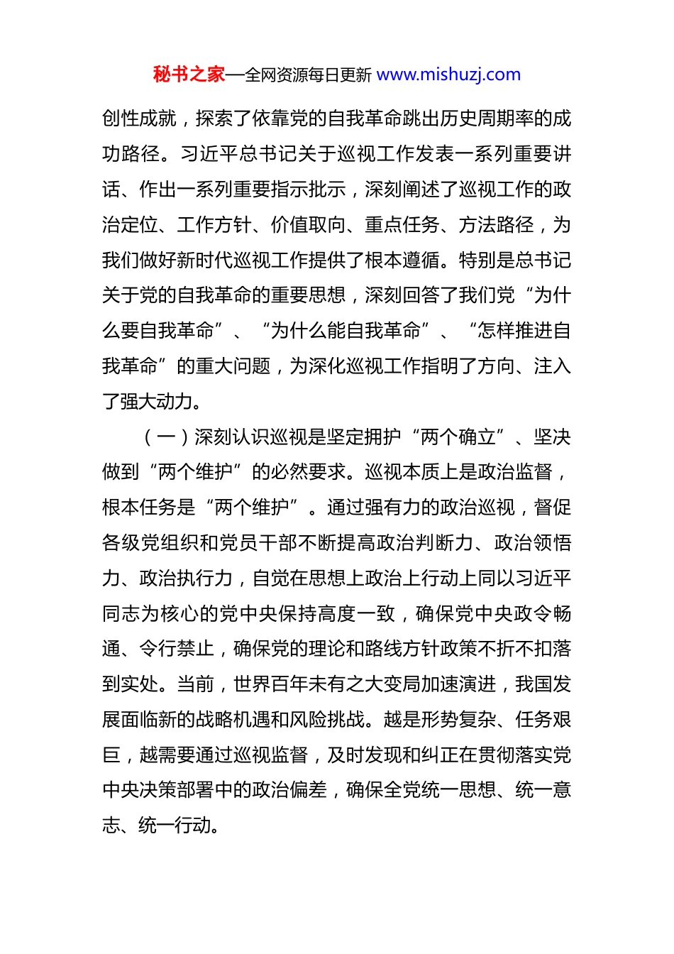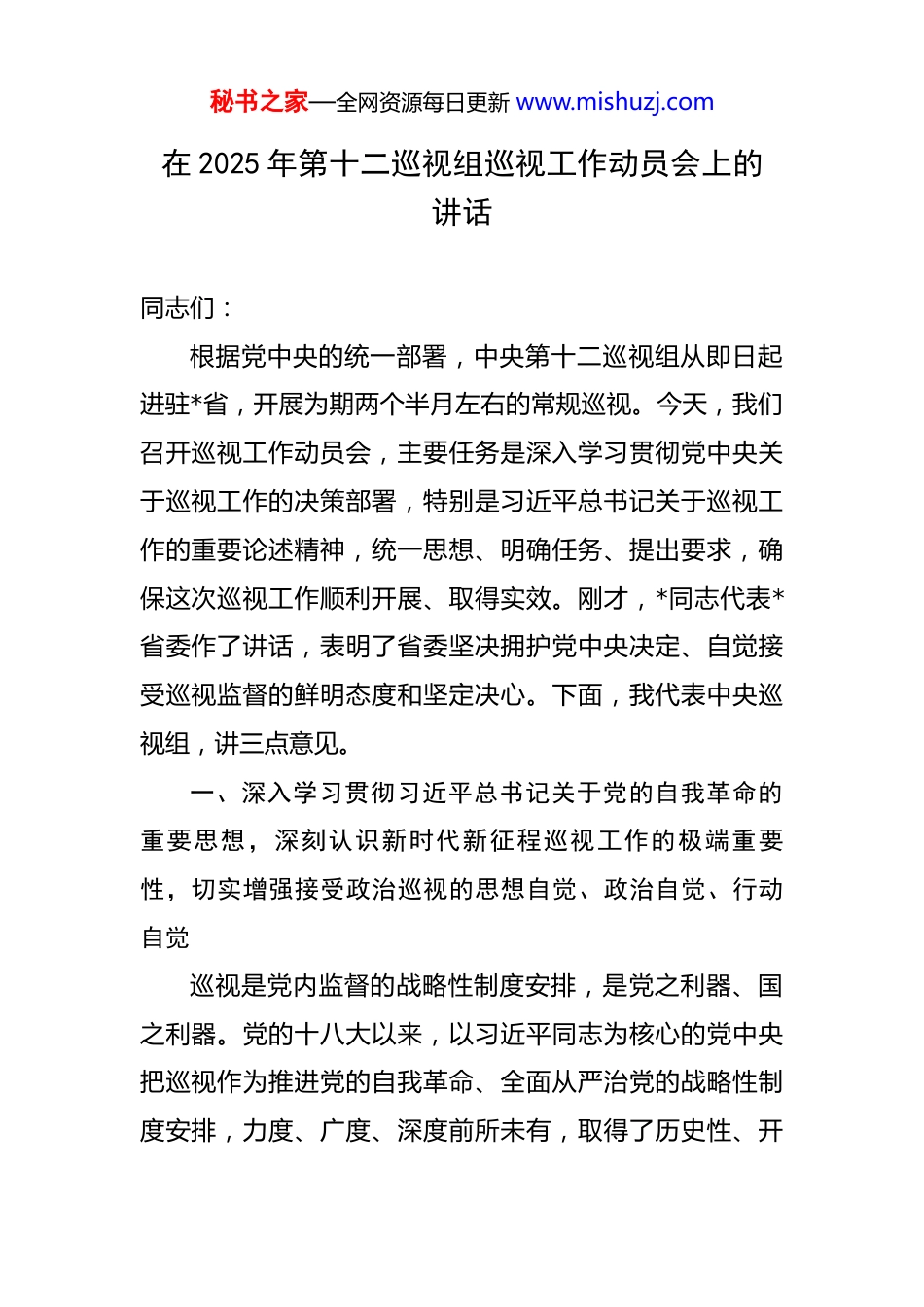 秘书之家—全网资源每日更新 www.mishuzj.com在 2025 年第十二巡视组巡视工作动员会上的讲话 同志们:根据党中央的统一部署,中央第十二巡视组从即日起进驻*省,开展为期两个半月左右的常规巡视。今天,我们召开巡视工作动员会,主要任务是深入学习贯彻党中央关于巡视工作的决策部署,特别是习近平总书记关于巡视工作的重要论述精神,统一思想、明确任务、提出要求,确保这次巡视工作顺利开展、取得实效。刚才,*同志代表*省委作了讲话,表明了省委坚决拥护党中央决定、自觉接受巡视监督的鲜明态度和坚定决心。下面,我代表中央巡视组,讲三点意见。一、深入学习贯彻习近平总书记关于党的自我革命的重要思想,深刻认识新时代新征程巡视工作的极端重要性,切实增强接受政治巡视的思想自觉、政治自觉、行动自觉巡视是党内监督的战略性制度安排,是党之利器、国之利器。党的十八大以来,以习近平同志为核心的党中央把巡视作为推进党的自我革命、全面从严治党的战略性制度安排,力度、广度、深度前所未有,取得了历史性、开秘书之家—全网资源每日更新 www.mishuzj.com创性成就,探索了依靠党的自我革命跳出历史周期率的成功路径。习近平总书记关于巡视工作发表一系列重要讲话、作出一系列重要指示批示,深刻阐述了巡视工作的政治定位、工作方针、价值取向、重点任务、方法路径,为我们做好新时代巡视工作提供了根本遵循。特别是总书记关于党的自我革命的重要思想,深刻回答了我们党“为什么要自我革命”、“为什么能自我革命”、“怎样推进自我革命”的重大问题,为深化巡视工作指明了方向、注入了强大动力。(一)深刻认识巡视是坚定拥护“两个确立”、坚决做到“两个维护”的必然要求。巡视本质上是政治监督,根本任务是“两个维护”。通过强有力的政治巡视,督促各级党组织和党员干部不断提高政治判断力、政治领悟力、政治执行力,自觉在思想上政治上行动上同以习近平同志为核心的党中央保持高度一致,确保党中央政令畅通、令行禁止,确保党的理论和路线方针政策不折不扣落到实处。当前,世界百年未有之大变局加速演进,我国发展面临新的战略机遇和风险挑战。越是形势复杂、任务艰巨,越需要通过巡视监督,及时发现和纠正在贯彻落实党中央决策部署中的政治偏差,确保全党统一思想、统一意志、统一行动。秘书之家—全网资源每日更新 www.mishuzj.com(二)深刻认识巡视是推进党的自我革命、深化全面从严治党的有力举措。全面从严治党永远在路上,党的自我革命永远在路上。巡视作为党内监督的“利剑”,具有发现问题、形成震慑的独特优势。通过深入查找管党治党方面存在的突出问题,特别是政治问题和经济问题交织的腐败问题,推动解决人民群众反映强烈的突出问题,督促各级党组织切实履行好全面从严治党主体责任,把严的基调、严的措施、严的氛围长期坚持下去,不断清除侵蚀党的健康肌体的病毒,提高党的执政能力和领导水平,确保党永远不变质、不变色、不变味。(三)深刻认识巡视是推动高质量发展、推进中国式现代化的坚强保障。高质量发展是全面建设社会主义现代化国家的首要任务。巡视工作必须自觉围绕中心、服务大局。*作为西部重要省份,在新时代西部大开发上闯新路、在乡村振兴上开新局、在实施数字经济战略上抢新机、在生态文明建设上出新绩(“四新”要求),肩负着党中央赋予的重大使命。这次巡视,就是要聚焦*的功能定位和战略部署,深入检查省委和各级党组织贯彻落实党中央决策部署、完整准确全面贯彻新发展理念、服务和融入新发展格局的实际成效,着力发现和推动解决制约高质量发展的深层次矛盾和体制机制障碍,为*在中国式现代化建设中走秘书之家—全网资源每日更新 www.mishuzj.com在前列、勇闯新路提供有力监督保障。*省委和各级党组织、广大党员干部,一定要站在党和国家事业发展全局的高度,深刻认识这次巡视的重大政治意义和实践意义,把接受中央巡视作为一次全面的“政治体检”、一次严肃的“政治淬炼”、一次有力的“政治推动”,切实增强接受监督的自觉性和坚定性,以高度的政治责任感和历史使命感配合好中央巡视组的工作。二、准确把握政治巡视定位和...