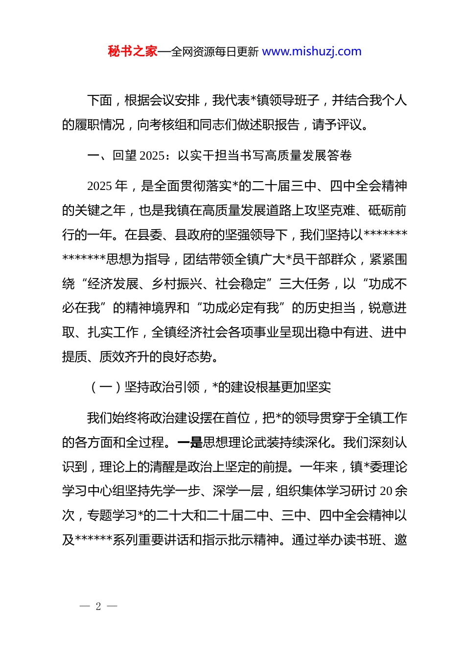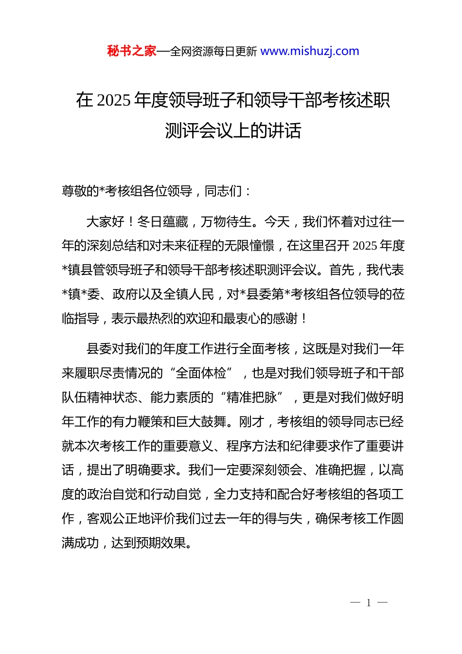 秘书之家—全网资源每日更新 www.mishuzj.com在 2025 年度领导班子和领导干部考核述职测评会议上的讲话尊敬的*考核组各位领导,同志们:大家好!冬日蕴藏,万物待生。今天,我们怀着对过往一年的深刻总结和对未来征程的无限憧憬,在这里召开 2025 年度*镇县管领导班子和领导干部考核述职测评会议。首先,我代表*镇*委、政府以及全镇人民,对*县委第*考核组各位领导的莅临指导,表示最热烈的欢迎和最衷心的感谢!县委对我们的年度工作进行全面考核,这既是对我们一年来履职尽责情况的“全面体检”,也是对我们领导班子和干部队伍精神状态、能力素质的“精准把脉”,更是对我们做好明年工作的有力鞭策和巨大鼓舞。刚才,考核组的领导同志已经就本次考核工作的重要意义、程序方法和纪律要求作了重要讲话,提出了明确要求。我们一定要深刻领会、准确把握,以高度的政治自觉和行动自觉,全力支持和配合好考核组的各项工作,客观公正地评价我们过去一年的得与失,确保考核工作圆满成功,达到预期效果。— 1 —秘书之家—全网资源每日更新 www.mishuzj.com下面,根据会议安排,我代表*镇领导班子,并结合我个人的履职情况,向考核组和同志们做述职报告,请予评议。一、回望 2025:以实干担当书写高质量发展答卷2025 年,是全面贯彻落实*的二十届三中、四中全会精神的关键之年,也是我镇在高质量发展道路上攻坚克难、砥砺前行的一年。在县委、县政府的坚强领导下,我们坚持以**************思想为指导,团结带领全镇广大*员干部群众,紧紧围绕“经济发展、乡村振兴、社会稳定”三大任务,以“功成不必在我”的精神境界和“功成必定有我”的历史担当,锐意进取、扎实工作,全镇经济社会各项事业呈现出稳中有进、进中提质、质效齐升的良好态势。(一)坚持政治引领,*的建设根基更加坚实我们始终将政治建设摆在首位,把*的领导贯穿于全镇工作的各方面和全过程。一是思想理论武装持续深化。我们深刻认识到,理论上的清醒是政治上坚定的前提。一年来,镇*委理论学习中心组坚持先学一步、深学一层,组织集体学习研讨 20 余次,专题学习*的二十大和二十届二中、三中、四中全会精神以及******系列重要讲话和指示批示精神。通过举办读书班、邀— 2 —秘书之家—全网资源每日更新 www.mishuzj.com请专家授课、开展“书记讲*课”等多种形式,我们带动全镇*员干部累计开展各类学习宣讲活动 150 余场次,覆盖*员群众超过 6000 人次,推动*的创新理论“飞入寻常百姓家”,广大*员干部的“四个意识”不断增强,“四个自信”更加坚定,“两个维护”的政治自觉融入血脉、见诸行动。二是基层组织堡垒更加坚强。我们牢固树立大抓基层的鲜明导向,全面实施“dj引领、固本强基”工程。投入专项资金 80 余万元,对*个村级组织活动场所进行了标准化改造提升,打造了“*村*群服务中心”等一批功能齐全、服务高效的 dj 示范点。严格落实“三会一课”、主题*日、组织生活会等制度,严肃*内政治生活。我们还特别注重在乡村振兴、项目建设、基层治理一线发展*员、锻炼干部,全年新发展*员 28 名,其中 35 岁以下青年*员占比超过 60%,为*组织注入了新鲜血液。通过一系列举措,基层*组织的政治功能和组织功能显著增强,成为推动发展、服务群众、凝聚人心的坚强战斗堡垒。三是*风廉政建设纵深推进。我们深刻认识到,清正廉洁是共产*人的政治本色。镇*委坚决扛起全面从严治*主体责任,我作为*委书记认真履行“第一责任人”职责,班子成员严格落实“一岗双责”。我们坚持严的基调不动摇,组织全镇*员干部观看警示教育片 12 场,通报典型案例,开展廉政谈话提醒 200 余人次,让纪律和规矩真正成为— 3 —秘书之家—全网资源每日更新 www.mishuzj.com带电的“高压线”。镇纪委聚焦群众身边的“微腐败”和不正之风,加大监督执纪问责力度,全年共受理信访举报线索 15 件,立案审查 5 件,给予 dj 政务处分 5 人,挽回经济损失 12.3 万元。通过不懈努力,不敢腐的震慑持续发力,不能腐的笼子越扎越紧,不想腐的自觉显著增强,全镇政治生态更加风清气正、健康向上。(二)聚焦高质...