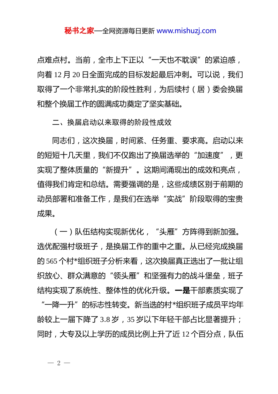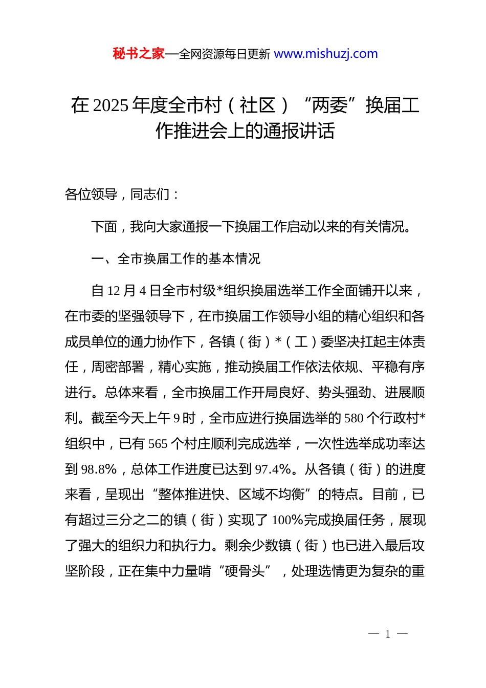 秘书之家—全网资源每日更新 www.mishuzj.com在 2025 年度全市村(社区)“两委”换届工作推进会上的通报讲话各位领导,同志们:下面,我向大家通报一下换届工作启动以来的有关情况。一、全市换届工作的基本情况自 12 月 4 日全市村级*组织换届选举工作全面铺开以来,在市委的坚强领导下,在市换届工作领导小组的精心组织和各成员单位的通力协作下,各镇(街)*(工)委坚决扛起主体责任,周密部署,精心实施,推动换届工作依法依规、平稳有序进行。总体来看,全市换届工作开局良好、势头强劲、进展顺利。截至今天上午 9 时,全市应进行换届选举的 580 个行政村*组织中,已有 565 个村庄顺利完成选举,一次性选举成功率达到 98.8%,总体工作进度已达到 97.4%。从各镇(街)的进度来看,呈现出“整体推进快、区域不均衡”的特点。目前,已有超过三分之二的镇(街)实现了 100%完成换届任务,展现了强大的组织力和执行力。剩余少数镇(街)也已进入最后攻坚阶段,正在集中力量啃“硬骨头”,处理选情更为复杂的重— 1 —秘书之家—全网资源每日更新 www.mishuzj.com点难点村。当前,全市上下正以“一天也不耽误”的紧迫感,向着 12 月 20 日全面完成的目标发起最后冲刺。可以说,我们取得了一个非常扎实的阶段性胜利,为后续村(居)委会换届和整个换届工作的圆满成功奠定了坚实基础。二、换届启动以来取得的阶段性成效同志们,这次换届,时间紧、任务重、要求高。启动以来的短短十几天里,我们不仅跑出了换届选举的“加速度”,更实现了整体质量的“新提升”。这期间涌现出的成效和亮点,值得我们肯定和总结。需要强调的是,这些成绩区别于前期的动员部署和准备工作,是我们在选举“实战”阶段取得的宝贵成果。(一)队伍结构实现新优化,“头雁”方阵得到新加强。选优配强村级班子,是换届工作的重中之重。从已经完成换届的 565 个村*组织班子分析来看,这次换届真正选出了一批让组织放心、群众满意的“领头雁”和坚强有力的战斗堡垒,班子结构实现了系统性、整体性的优化升级。一是干部素质实现了“一降一升”的标志性转变。新当选的村*组织班子成员平均年龄较上一届下降了 3.8 岁,35 岁以下年轻干部占比显著提升;同时,大专及以上学历的成员比例上升了近 12 个百分点,队伍— 2 —秘书之家—全网资源每日更新 www.mishuzj.com年轻化、知识化趋势非常明显。这批高素质人才的涌入,为未来五年乡村振兴注入了最宝贵的智力资源和创新活力。二是“能人”治村格局得到进一步巩固。一大批有思想、有闯劲、有担当的致富带富能手、返乡创业青年、退役军人、大学毕业生等优秀人才,通过法定程序进入了村*组织班子。他们不仅有服务群众的热情,更有带领群众发展的本领,群众基础好、认可度高。例如,*镇*村新当选的*组织书记,就是一位在外成功创业后回乡的青年企业家,他的当选极大地提振了全村*员群众干事创业的信心。三是“一肩挑”比例和质量双提升。在已完成换届的村中,村*组织书记、村委会主任“一肩挑”比例稳步提升,达到了预定目标。更重要的是,我们坚持“成熟一个、稳妥一个”的原则,确保所有“一肩挑”人选都是政治上过硬、能力上突出、在群众中威信高的核心骨干,为强化*对基层一切工作的领导提供了坚实的组织保障。(二)选举程序展现新规范,依法依规成为新常态。程序的公正是结果公正的根本保障。自选举工作启动以来,全市上下始终将依法依规操作贯穿于每一个环节,展现出了前所未有的规范性和严谨性。一是选举组织“零差错”。各镇(街)严格按照市里制定的“一图一表一文书”标准化流程,对候选人— 3 —秘书之家—全网资源每日更新 www.mishuzj.com提名、资格审查、大会组织、投票计票等 25 个关键环节、56 个具体事项进行精细化管理和精准化操作。选举现场组织严密、流程清晰、氛围庄重,广大*员参选率和群众观摩率都达到了新高。在已完成的选举中,未发生一起因程序不清、操作不当而引发的重大争议或选举无效事件,确保了选举结果的合法性和权威性。二是人选把关“零带病”。在选举实战阶段,我们坚持将资格审查贯穿始终。...