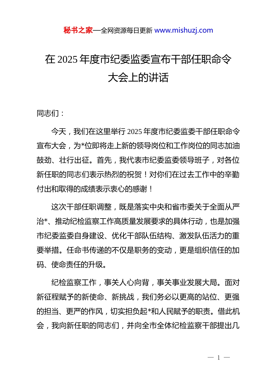 秘书之家—全网资源每日更新 www.mishuzj.com在 2025 年度市纪委监委宣布干部任职命令大会上的讲话同志们:今天,我们在这里举行 2025 年度市纪委监委干部任职命令宣布大会,为*位即将走上新的领导岗位和工作岗位的同志加油鼓劲、壮行出征。首先,我代表市纪委监委领导班子,对各位新任职的同志们表示热烈的祝贺!对你们在过去工作中的辛勤付出和取得的成绩表示衷心的感谢!这次干部任职调整,既是落实中央和省市委关于全面从严治*、推动纪检监察工作高质量发展要求的具体行动,也是加强市纪委监委自身建设、优化干部队伍结构、激发队伍活力的重要举措。任命书传递的不仅是职务的变动,更是组织信任的加码、使命责任的升级。纪检监察工作,事关人心向背,事关事业发展大局。面对新征程赋予的新使命、新挑战,我们务必以更高的站位、更强的担当、更严的作风,切实担负起*和人民赋予的职责。借此机会,我向新任职的同志们,并向全市全体纪检监察干部提出几— 1 —秘书之家—全网资源每日更新 www.mishuzj.com点期望和要求。一、以“铁肩担道义”的定力,淬炼政治忠诚的“底色”政治属性是纪检监察机关的第一属性,忠诚是纪检监察干部的首要品质。新任职的同志们要时刻保持政治上的清醒和坚定,做“两个确立”的坚决拥护者和“两个维护”的忠实践行者。第一,要将政治监督具体化、精准化、常态化。纪检监察机关的职责是监督保障*的路线方针政策和重大决策部署的贯彻落实。新任职的同志们要以高度的政治敏锐性,紧盯“关键少数”,紧扣权力运行,把监督重点聚焦到全面贯彻落实*的二十届四中全会精神上来,聚焦到经济社会高质量发展上来,聚焦到为民办实事、提升群众获得感上来。要善于从业务问题中发现政治问题,从苗头倾向中洞察政治隐患,确保*中央政令畅通、执行到位。第二,要提高政治判断力、政治领悟力、政治执行力。要不断深化理论学习,系统研读**************思想,特别是***关于全面从严治*、*风廉政建设和反腐败斗争的重要论述。要从*的百年奋斗史中汲取智慧和力量,学会在纷繁复杂的环境中— 2 —秘书之家—全网资源每日更新 www.mishuzj.com保持战略清醒,做到对“国之大者”心中有数,对监督方向把握精准,始终同*中央保持高度一致。在重大原则问题上,必须旗帜鲜明、立场坚定。第三,要胸怀大局,服务保障中心工作。纪检监察工作不是孤立的,必须融入全市发展大局,服务保障改革发展。要以严明的纪律护航营商环境优化,以精准的问责倒逼责任落实,以高效的监督推动重点工程项目顺利实施。要摒弃“就案办案”的思维定势,强化“纪律跟着工作走”的理念,把全面从严治*的要求体现在服务保障高质量发展的全过程、各方面。二、以“百炼成钢”的韧劲,锻造担当实干的“利剑”纪检监察工作是技术活、专业活、良心活。新时代的纪检监察干部,不仅要忠诚,更要具备与之相匹配的专业能力和过硬本领。第一,要善于学习,争做行家里手。当前,反腐败斗争形势依然严峻复杂,监督对象、手段、领域不断变化,对我们的专业能力提出了新的更高要求。新任职的同志们要保持“本领恐慌”的危机感,不仅要精通纪法贯通、法法衔接的业务知识,更要深入学习金融、科技、工程、审计、大数据等领域的专业— 3 —秘书之家—全网资源每日更新 www.mishuzj.com知识,加快知识更新、优化能力结构。要从书本中汲取理论营养,从实践中总结经验规律,努力成为能够驾驭复杂局面的“全能型”纪检监察干部。第二,要敢于斗争,提升监督执纪的质效。斗争精神是我们*的鲜明品格。纪检监察机关是*内监督和国家监察的专责机关,必须时刻保持“利剑高悬、震慑常在”的强大势能。要坚持实事求是、依规依纪依法,做深做实做细审查调查工作。要勇于挑最重的担子,啃最硬的骨头,敢于向一切腐败和不正之风亮剑。要注重运用新的科技手段,推进纪检监察工作与信息技术深度融合,实现监督执纪问责的精准化、智能化,全年争取运用新技术手段查办疑难复杂案件*件,提升办案效率*%。第三,要坚持系统思维,推进“三不腐”一体建设。新任职的领导干部要深刻理解“三不腐”是一个有机整体。要在“不敢腐”上持...