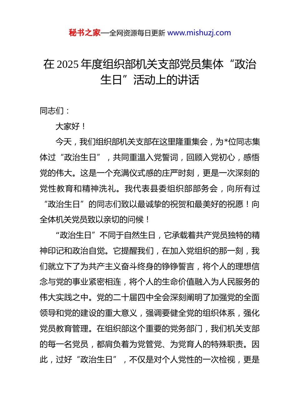 秘书之家—全网资源每日更新 www.mishuzj.com在 2025 年度组织部机关支部党员集体“政治生日”活动上的讲话 同志们:大家好!今天,我们组织部机关支部在这里隆重集会,为*位同志集体过“政治生日”,共同重温入党誓词,回顾入党初心,感悟党的伟大。这是一个充满仪式感的庄严时刻,更是一次深刻的党性教育和精神洗礼。我代表县委组织部部务会,向所有过“政治生日”的同志们致以最诚挚的祝贺和最美好的祝愿!向全体机关党员致以亲切的问候!“政治生日”不同于自然生日,它承载着共产党员独特的精神印记和政治自觉。它提醒我们,在加入党组织的那一刻,我们就立下了为共产主义奋斗终身的铮铮誓言,将个人的理想信念与党的事业紧密相连,将个人的生命价值融入为人民服务的伟大实践之中。党的二十届四中全会深刻阐明了加强党的全面领导和党的建设的重大意义,强调要健全党的组织体系,强化党员教育管理。在组织部这个重要的党务部门,我们机关支部的每一名党员,都肩负着为党管党、为党育人的特殊职责。因此,过好“政治生日”,不仅是对个人党性的一次检视,更是秘书之家—全网资源每日更新 www.mishuzj.com对我们组织部门党员队伍建设的一次有力推动,必将激励大家在新的一年里,以更加饱满的热情、更加昂扬的斗志,投身到组织工作中去,为实现县域高质量发展贡献组织智慧和力量。一、重温誓词,感悟初心使命,永葆政治本色“我志愿加入中国共产党,拥护党的纲领,遵守党的章程……”每当我们重温这神圣的誓词,内心都会激荡起无比的自豪与坚定的信念。这不仅仅是一段文字,更是我们向党和人民许下的庄严承诺,是我们共产党人矢志不渝的初心和使命。(一)回望入党初心,牢记庄严承诺一是深刻认识党的性质和宗旨。我们的党是中国工人阶级的先锋队,是中国人民和中华民族的先锋队,是中国特色社会主义事业的领导核心。党的根本宗旨是全心全意为人民服务。回望我们入党时的那份纯粹和热忱,就是被党为人民谋幸福、为民族谋复兴的伟大理想所感召。那时的我们,或许因为革命先烈的英勇事迹,或许因为身边优秀党员的模范带头,或许因为党带领人民创造的辉煌成就,而毅然决然地选择加入这个光荣的集体。这份初心,是融入我们血脉的红色基因,是激励我们不断前进的根本动力。在组织部工作,我们接触的都是党的事业,服务的都是党的干部,更要时刻对照入党誓词,审视自己是否始终坚守了为党和人民服务的初心,是否始终将个人的秘书之家—全网资源每日更新 www.mishuzj.com前途命运与党的事业紧密相连。二是铭记为民服务的宗旨意识。党的二十届四中全会强调,要始终坚持以人民为中心的发展思想,着力解决人民群众急难愁盼问题。作为党的组织工作者,我们手中掌握的是权力,肩上扛的是责任,心里装的应该是群众。我们的每一项工作,无论是干部选拔任用,还是基层组织建设,抑或是人才引进培养,最终都要落脚到为人民服务、让人民满意上。脱离群众,党的事业就失去了根基。因此,我们必须时刻警醒自己,权力是人民赋予的,只能用来为人民谋利益。要常态化开展“我为群众办实事”实践活动,真正深入基层、深入群众,了解他们的所思所盼,把工作做到群众心坎上,以实际行动擦亮共产党员的“金字招牌”。三是锤炼对党绝对忠诚的政治品格。忠诚是共产党人最鲜明的政治品格。对党忠诚,不是一句空洞的口号,而是具体的、实在的,体现在日常工作的点滴之中。这要求我们必须坚定理想信念,增强“四个意识”、坚定“四个自信”、坚决做到“两个维护”,始终在思想上政治上行动上同以习近平同志为核心的党中央保持高度一致。特别是在组织部门,我们是党的“红色管家”,更要旗帜鲜明讲政治,对党中央的决策部署和省市县委的工作要求,不折不扣地抓好贯彻落实,不能有丝毫秘书之家—全网资源每日更新 www.mishuzj.com的含糊和动摇。要时刻绷紧政治纪律和政治规矩这根弦,做政治上的明白人、老实人。(二)赓续红色血脉,传承光荣传统一是传承党的百年奋斗精神。从建党的开天辟地,到新中国成立的改天换地,到改革开放的翻天覆地,再到新时代取得历史性成就、发生历史性变革的惊天动地,我们党走...