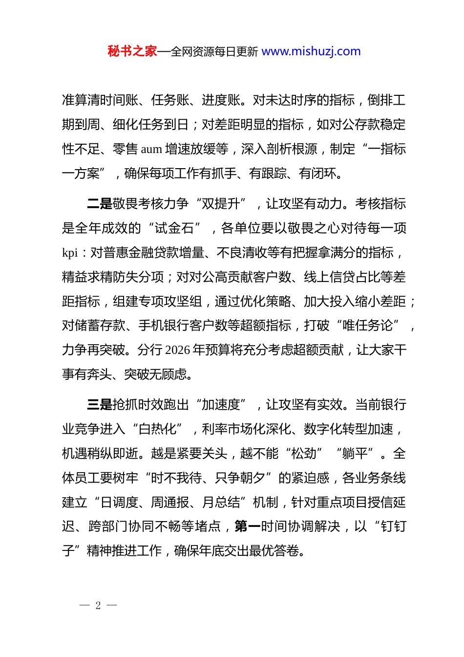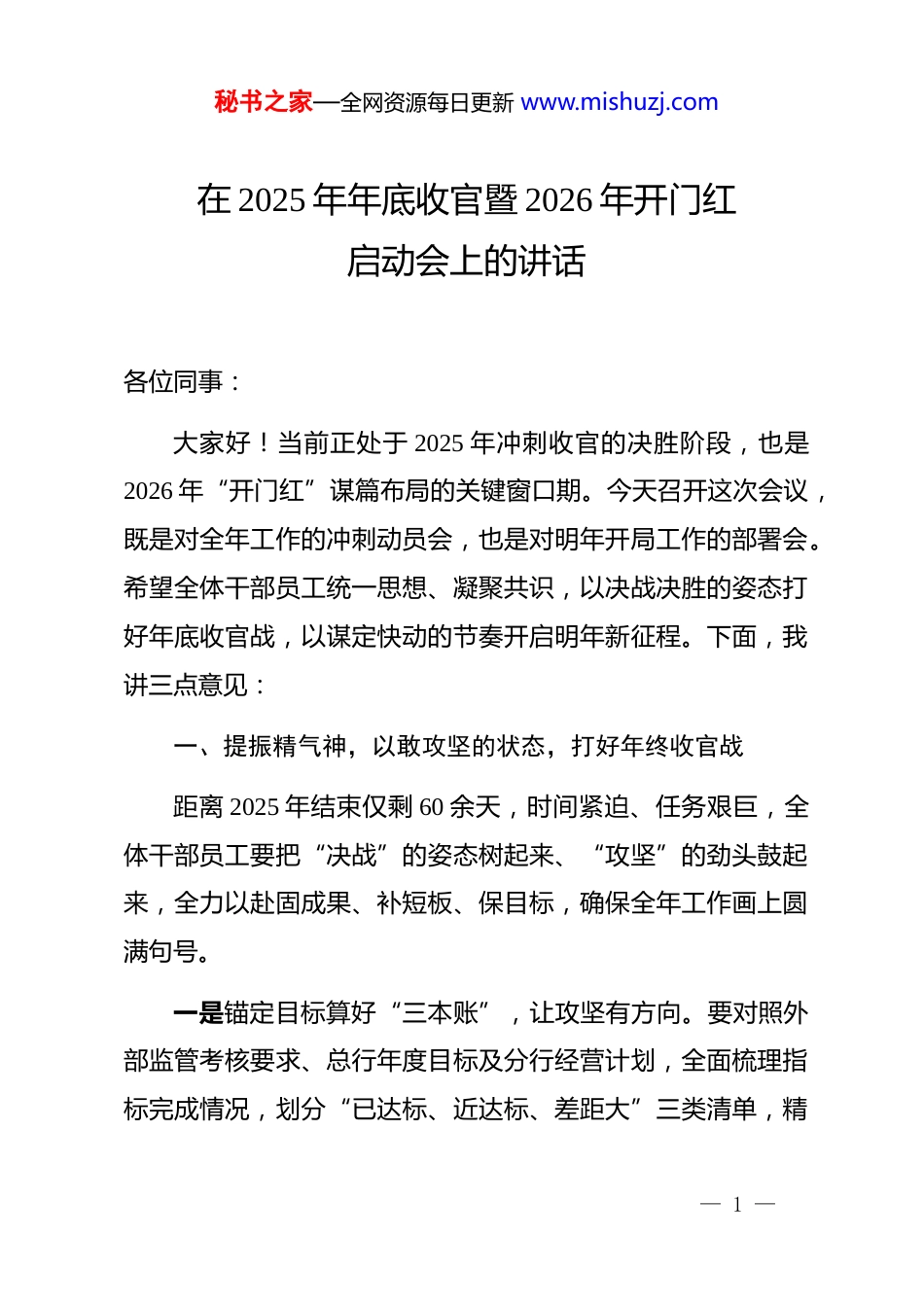 秘书之家—全网资源每日更新 www.mishuzj.com在 2025 年年底收官暨 2026 年开门红启动会上的讲话各位同事:大家好!当前正处于 2025 年冲刺收官的决胜阶段,也是2026 年“开门红”谋篇布局的关键窗口期。今天召开这次会议,既是对全年工作的冲刺动员会,也是对明年开局工作的部署会。希望全体干部员工统一思想、凝聚共识,以决战决胜的姿态打好年底收官战,以谋定快动的节奏开启明年新征程。下面,我讲三点意见:一、提振精气神,以敢攻坚的状态,打好年终收官战距离 2025 年结束仅剩 60 余天,时间紧迫、任务艰巨,全体干部员工要把“决战”的姿态树起来、“攻坚”的劲头鼓起来,全力以赴固成果、补短板、保目标,确保全年工作画上圆满句号。一是锚定目标算好“三本账”,让攻坚有方向。要对照外部监管考核要求、总行年度目标及分行经营计划,全面梳理指标完成情况,划分“已达标、近达标、差距大”三类清单,精— 1 —秘书之家—全网资源每日更新 www.mishuzj.com准算清时间账、任务账、进度账。对未达时序的指标,倒排工期到周、细化任务到日;对差距明显的指标,如对公存款稳定性不足、零售 aum 增速放缓等,深入剖析根源,制定“一指标一方案”,确保每项工作有抓手、有跟踪、有闭环。二是敬畏考核力争“双提升”,让攻坚有动力。考核指标是全年成效的“试金石”,各单位要以敬畏之心对待每一项kpi:对普惠金融贷款增量、不良清收等有把握拿满分的指标,精益求精防失分项;对对公高贡献客户数、线上信贷占比等差距指标,组建专项攻坚组,通过优化策略、加大投入缩小差距;对储蓄存款、手机银行客户数等超额指标,打破“唯任务论”,力争再突破。分行 2026 年预算将充分考虑超额贡献,让大家干事有奔头、突破无顾虑。三是抢抓时效跑出“加速度”,让攻坚有实效。当前银行业竞争进入“白热化”,利率市场化深化、数字化转型加速,机遇稍纵即逝。越是紧要关头,越不能“松劲”“躺平”。全体员工要树牢“时不我待、只争朝夕”的紧迫感,各业务条线建立“日调度、周通报、月总结”机制,针对重点项目授信延迟、跨部门协同不畅等堵点,第一时间协调解决,以“钉钉子”精神推进工作,确保年底交出最优答卷。— 2 —秘书之家—全网资源每日更新 www.mishuzj.com二、提高执行力,以早布局的状态,打好开局主动战“开门红”是全年发展的“第一粒扣子”,扣好这粒扣子,就能抢占市场先机、掌握发展主动。各部门、网点要打破“年末筹备、年初启动”的惯性思维,早部署、早储备、早行动,确保 2026 年一季度开好局、起好步。一是提前启动抢抓“窗口期”,让布局有先机。从同业动态看,多家银行已启动 2026 年“开门红”筹备,我们必须快人一步——今年“开门红”提前至 11 月中旬启动,仅剩 1 个多月筹备时间。各单位要立即行动,结合区域特点、客户结构制定个性化方案,聚焦储蓄存款增量、对公优质客户拓展、零售财富规模、数字金融渗透等核心指标,明确目标、举措与激励,确保活动一启动就快速破局。二是优化方案激发“内生力”,让布局有活力。要深入基层调研,倾听一线声音——比如客户经理客户维护的难点、柜员业务办理的堵点,把这些意见融入“开门红”考核激励方案。方案设计要突出“精准、导向、激励”,既聚焦业务需求,也兼顾员工成长,通过“目标与绩效挂钩、贡献与回报匹配”,设置超额奖、创新奖,充分调动干事热情。同时做好收官与开门红指标衔接,比如合理安排年末贷款投放,为明年储备项目,— 3 —秘书之家—全网资源每日更新 www.mishuzj.com实现无缝推进。三是储备资源筑牢“支撑点”,让布局有底气。提前储备客户、项目、产品三类核心资源:客户端,梳理私行客户、重点企业,提前对接存款、贷款、财富需求;项目端,针对地方重点产业、基建项目,提前开展尽调与授信,确保开门红快速落地;产品端,围绕客户需求创新方案,推出普惠信贷套餐、零售财富组合等专属产品,通过“方案式营销、批量化获客”抢占市场。三、提升质效绩,以谋长远的状态,打好发展持久战年底收官与年初开局不是“两张皮”,而是相互衔接的“有机整体”。我们要...