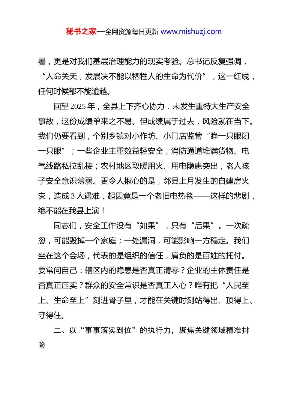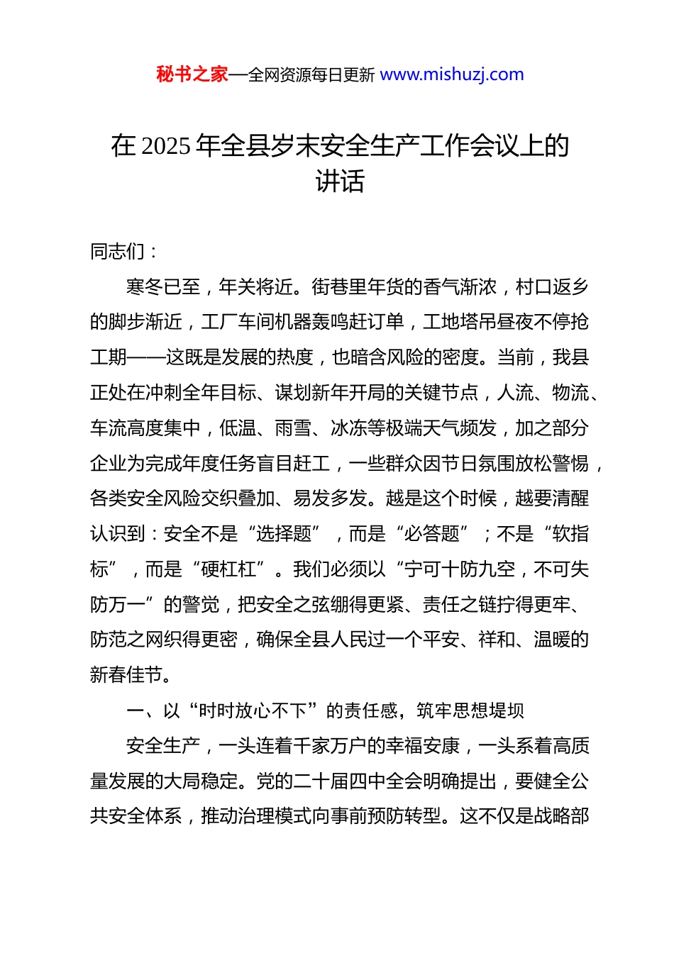 秘书之家—全网资源每日更新 www.mishuzj.com在 2025 年全县岁末安全生产工作会议上的讲话 同志们:寒冬已至,年关将近。街巷里年货的香气渐浓,村口返乡的脚步渐近,工厂车间机器轰鸣赶订单,工地塔吊昼夜不停抢工期——这既是发展的热度,也暗含风险的密度。当前,我县正处在冲刺全年目标、谋划新年开局的关键节点,人流、物流、车流高度集中,低温、雨雪、冰冻等极端天气频发,加之部分企业为完成年度任务盲目赶工,一些群众因节日氛围放松警惕,各类安全风险交织叠加、易发多发。越是这个时候,越要清醒认识到:安全不是“选择题”,而是“必答题”;不是“软指标”,而是“硬杠杠”。我们必须以“宁可十防九空,不可失防万一”的警觉,把安全之弦绷得更紧、责任之链拧得更牢、防范之网织得更密,确保全县人民过一个平安、祥和、温暖的新春佳节。一、以“时时放心不下”的责任感,筑牢思想堤坝安全生产,一头连着千家万户的幸福安康,一头系着高质量发展的大局稳定。党的二十届四中全会明确提出,要健全公共安全体系,推动治理模式向事前预防转型。这不仅是战略部秘书之家—全网资源每日更新 www.mishuzj.com署,更是对我们基层治理能力的现实考验。总书记反复强调,“人命关天,发展决不能以牺牲人的生命为代价”,这一红线,任何时候都不能逾越。回望 2025 年,全县上下齐心协力,未发生重特大生产安全事故,这份成绩单来之不易。但成绩属于过去,风险就在当下。我们仍要看到,个别乡镇对小作坊、小门店监管“睁一只眼闭一只眼”;一些企业主重效益轻安全,消防通道堆满货物、电气线路私拉乱接;农村地区取暖用火、用电隐患突出,老人孩子安全意识薄弱。更令人揪心的是,邻县上月发生的自建房火灾,造成 3 人遇难,起因竟是一个老旧电热毯——这样的悲剧,绝不能在我县上演!同志们,安全工作没有“如果”,只有“后果”。一次疏忽,可能毁掉一个家庭;一处漏洞,可能影响一方稳定。我们坐在这个会场,代表的是组织的信任,肩负的是百姓的托付。要常问自己:辖区内的隐患是否真正清零?企业的主体责任是否真正压实?群众的安全常识是否真正入心?唯有把“人民至上、生命至上”刻进骨子里,才能在关键时刻站得出、顶得上、守得住。二、以“事事落实到位”的执行力,聚焦关键领域精准排险秘书之家—全网资源每日更新 www.mishuzj.com岁末年初,必须紧盯重点行业、重点部位、重点人群,打出一套“组合拳”,做到防患于未然、化解于萌芽。一是让道路更安心。春运大幕即将开启,预计我县日均车流量将突破*万辆次。要加强对国省干线、农村临水临崖路段的巡查,特别是山区道路要提前备好融雪剂、防滑沙。严查客车超员、货车超载、农用车违法载人,对疲劳驾驶、酒后驾车“零容忍”。各乡镇要组织志愿者在集市、学校周边开展交通劝导,让“慢一点、稳一点”成为出行共识。二是让家园更安宁。老旧小区、群租房、“九小场所”是消防薄弱点。要逐栋排查电动自行车“飞线充电”、楼道堆放杂物、防盗窗未设逃生口等问题。推广安装独立式烟感报警器,年内覆盖所有独居老人家庭。消防救援大队要前置执勤力量,在除夕、元宵等重点时段开展流动巡防,确保“1 分钟响应、3分钟到场”。三是让灶台更安全。燃气安全关乎千家万户“烟火气”。要加快完成*公里老旧燃气管网改造,对餐饮店、食堂的液化气钢瓶实行“一瓶一码”溯源管理。入户安检不能走过场,要手把手教群众识别胶管老化、阀门松动等风险。鼓励使用金属波纹管、自闭阀等安全配件,政府可给予适当补贴。四是让工地更规范。严禁施工单位为抢工期在雨雪大风天秘书之家—全网资源每日更新 www.mishuzj.com气进行高空作业。对深基坑、脚手架、塔吊等危大工程实行“每日一检”,监理单位必须签字确认方可施工。工棚取暖要统一使用电暖器,严禁使用炭火、小太阳,防止一氧化碳中毒。住建部门要联合工会,为留守工人送去安全礼包和节日慰问。五是让山林更宁静。当前森林火险等级持续高位。要严格落实林长制,护林员每日巡山不少于 2 次,在重点区域增设监控摄像头。严禁在林区焚烧秸秆、上坟烧纸,倡导鲜花祭扫、网络追思。扑火队...
