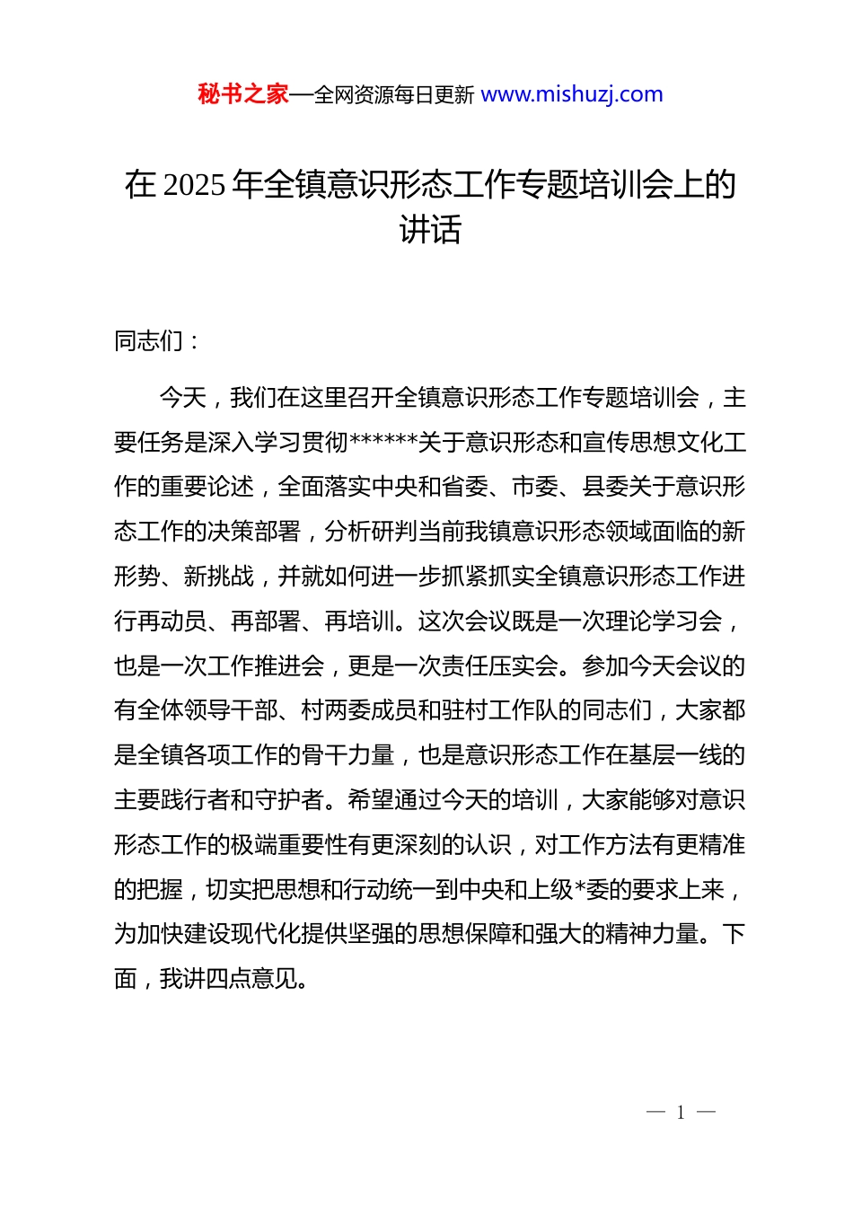 秘书之家—全网资源每日更新 www.mishuzj.com在 2025 年全镇意识形态工作专题培训会上的讲话同志们:今天,我们在这里召开全镇意识形态工作专题培训会,主要任务是深入学习贯彻******关于意识形态和宣传思想文化工作的重要论述,全面落实中央和省委、市委、县委关于意识形态工作的决策部署,分析研判当前我镇意识形态领域面临的新形势、新挑战,并就如何进一步抓紧抓实全镇意识形态工作进行再动员、再部署、再培训。这次会议既是一次理论学习会,也是一次工作推进会,更是一次责任压实会。参加今天会议的有全体领导干部、村两委成员和驻村工作队的同志们,大家都是全镇各项工作的骨干力量,也是意识形态工作在基层一线的主要践行者和守护者。希望通过今天的培训,大家能够对意识形态工作的极端重要性有更深刻的认识,对工作方法有更精准的把握,切实把思想和行动统一到中央和上级*委的要求上来,为加快建设现代化提供坚强的思想保障和强大的精神力量。下面,我讲四点意见。— 1 —秘书之家—全网资源每日更新 www.mishuzj.com一、提高政治站位,深刻认识新时代意识形态工作的极端重要性意识形态工作是*的一项极端重要的工作,关乎旗帜、关乎道路、关乎国家政治安全。*的十八大以来,以***同志为核心的*中央高度重视意识形态工作,******发表一系列重要讲话、作出一系列****,深刻阐明了意识形态工作的重大理论和实践问题,为我们做好新时代意识形态工作提供了根本遵循。我们必须站在政治和全局的高度,深刻领会其核心要义和实践要求。第一,做好意识形态工作是巩固*的执政根基的必然要求。人心是最大的政治。意识形态决定文化前进方向和发展道路,对一个政*、一个国家、一个民族的生存和发展至关重要。历史和现实反复证明,能否做好意识形态工作,事关*的前途命运,事关国家长治久安,事关民族凝聚力和向心力。当前,我们正处在实现中华民族伟大复兴的关键时期,内外环境复杂多变,思想文化领域交流交融交锋更加频繁。我们必须始终坚持马克思主义在意识形态领域的指导地位,牢牢掌握意识形态工作的领导权、管理权、话语权,不断巩固全*全国各族人民团结奋斗的共同思想基础,才能确保我们的事业始终沿着正确方向前进。第二,做好意识形态工作是推动**镇高质量发展的现实需— 2 —秘书之家—全网资源每日更新 www.mishuzj.com要。当前,我镇正处于转型升级、爬坡过坎的关键阶段,全镇上下面临着巩固拓展脱贫攻坚成果同乡村振兴有效衔接、推动产业结构优化、深化基层治理创新等多重任务。越是发展的关键时期,越需要强大的精神动力和良好的舆论环境。统一的思想、坚定的信心、昂扬的斗志,是克服一切艰难险阻、推动事业发展的力量源泉。反之,如果思想混乱、杂音噪音不断,就会干扰发展大局,甚至迟滞我们的发展步伐。我们必须通过扎实有效的意识形态工作,唱响主旋律,弘扬正能量,把全镇上下的思想和行动统一到镇*委、政府的决策部署上来,凝聚起心往一处想、劲往一处使的磅礴力量。第三,做好意识形态工作是应对风险挑战的紧迫任务。当今世界正经历百年未有之大变局,我们面对的意识形态领域斗争比以往任何时候都更加复杂、更加尖锐。特别是随着互联网技术和新媒体的迅猛发展,信息传播格局发生了深刻变革,人人都有麦克风,人人都是信息源。网络空间已经成为意识形态斗争的主战场、最前沿。一些错误思潮、有害信息通过网络快速传播、发酵,对主流价值观造成冲击,对社会稳定构成潜在威胁。对我镇而言,一些涉及征地拆迁、项目建设、环境治理、民生保障等方面的矛盾和问题,如果处置不当,极易被放大炒— 3 —秘书之家—全网资源每日更新 www.mishuzj.com作,演变为网络舆情事件,损害政府公信力和地区形象。因此,我们必须保持清醒头脑,增强忧患意识,下好先手棋、打好主动仗,坚决维护我镇意识形态领域的安全和稳定。二、正视问题短板,准确把握当前我镇意识形态工作面临的挑战近年来,在全镇上下的共同努力下,我镇意识形态工作总体态势是好的,主流思想舆论持续巩固壮大,社会主义核心价值观深入人心,全镇干部群众的精神面貌积极向上。但我们也要清醒地看到,对...