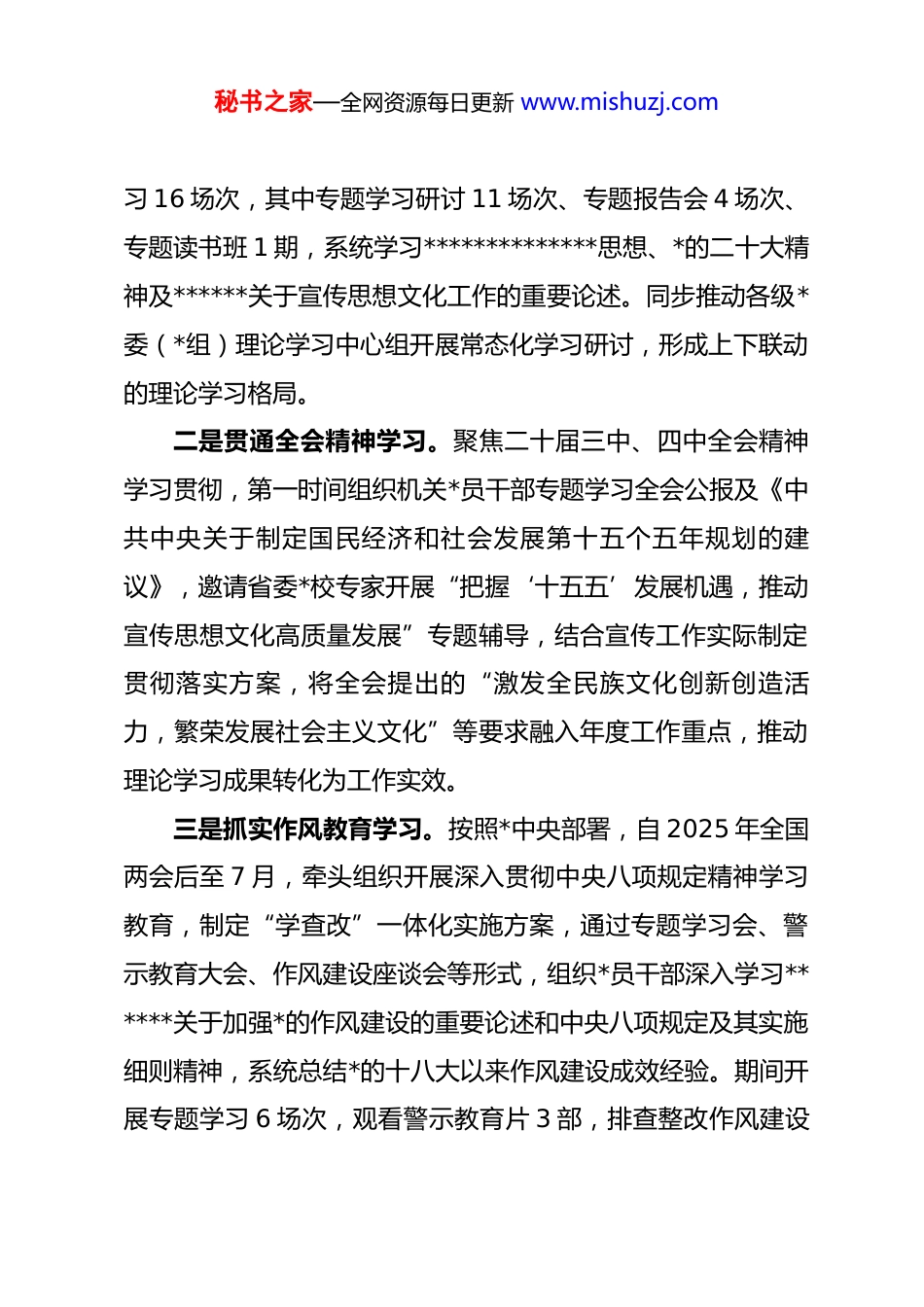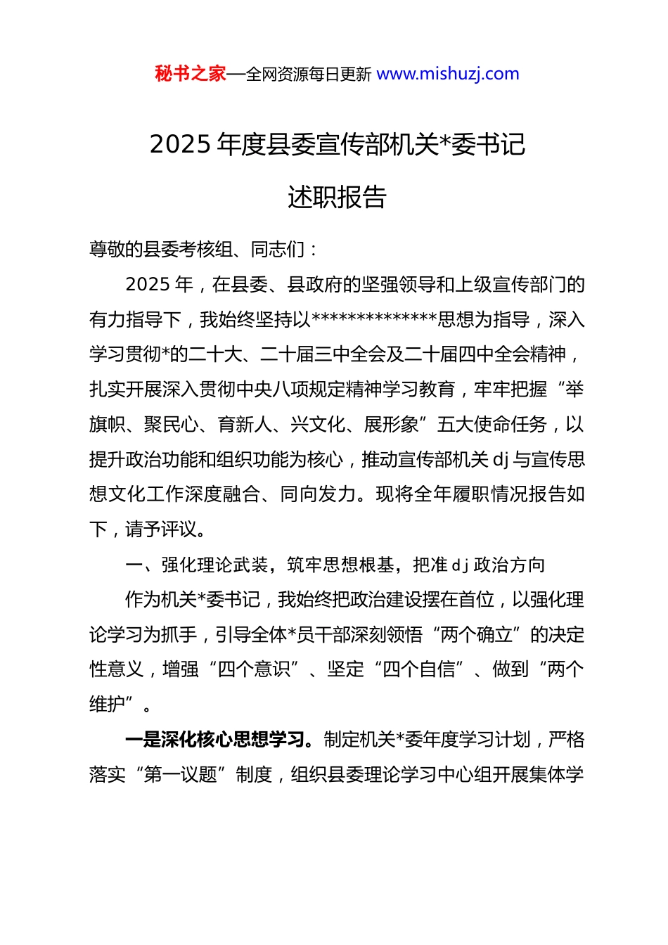 秘书之家—全网资源每日更新 www.mishuzj.com2025 年度县委宣传部机关*委书记述职报告尊敬的县委考核组、同志们:2025 年,在县委、县政府的坚强领导和上级宣传部门的有力指导下,我始终坚持以**************思想为指导,深入学习贯彻*的二十大、二十届三中全会及二十届四中全会精神,扎实开展深入贯彻中央八项规定精神学习教育,牢牢把握“举旗帜、聚民心、育新人、兴文化、展形象”五大使命任务,以提升政治功能和组织功能为核心,推动宣传部机关 dj 与宣传思想文化工作深度融合、同向发力。现将全年履职情况报告如下,请予评议。一、强化理论武装,筑牢思想根基,把准 dj 政治方向作为机关*委书记,我始终把政治建设摆在首位,以强化理论学习为抓手,引导全体*员干部深刻领悟“两个确立”的决定性意义,增强“四个意识”、坚定“四个自信”、做到“两个维护”。一是深化核心思想学习。制定机关*委年度学习计划,严格落实“第一议题”制度,组织县委理论学习中心组开展集体学秘书之家—全网资源每日更新 www.mishuzj.com习 16 场次,其中专题学习研讨 11 场次、专题报告会 4 场次、专题读书班 1 期,系统学习**************思想、*的二十大精神及******关于宣传思想文化工作的重要论述。同步推动各级*委(*组)理论学习中心组开展常态化学习研讨,形成上下联动的理论学习格局。二是贯通全会精神学习。聚焦二十届三中、四中全会精神学习贯彻,第一时间组织机关*员干部专题学习全会公报及《中共中央关于制定国民经济和社会发展第十五个五年规划的建议》,邀请省委*校专家开展“把握‘十五五’发展机遇,推动宣传思想文化高质量发展”专题辅导,结合宣传工作实际制定贯彻落实方案,将全会提出的“激发全民族文化创新创造活力,繁荣发展社会主义文化”等要求融入年度工作重点,推动理论学习成果转化为工作实效。三是抓实作风教育学习。按照*中央部署,自 2025 年全国两会后至 7 月,牵头组织开展深入贯彻中央八项规定精神学习教育,制定“学查改”一体化实施方案,通过专题学习会、警示教育大会、作风建设座谈会等形式,组织*员干部深入学习******关于加强*的作风建设的重要论述和中央八项规定及其实施细则精神,系统总结*的十八大以来作风建设成效经验。期间开展专题学习 6 场次,观看警示教育片 3 部,排查整改作风建设秘书之家—全网资源每日更新 www.mishuzj.com突出问题 4 项,完善相关制度 2 项,切实以学习教育推动作风建设走深走实。四是拓展基层宣讲普及。持续做强“xx 之声”宣讲品牌,组建由理论骨干、业务能手、先进典型组成的宣讲队伍,结合“我们的价值观 我们的中国梦”百姓宣讲比赛,深入机关、企业、学校、社区、乡村开展全会精神、政策解读等宣讲活动 86场次。创新开展“书香 xx 悦读人生”主题阅读活动 700 余场次,推动*的创新理论“飞入寻常百姓家”。二、聚焦主责主业,推动 dj 与业务融合,提升宣传工作质效坚持围绕中心抓 dj、抓好 dj 促业务,将机关 dj 工作与宣传思想文化重点任务紧密结合,以高质量 dj 引领宣传工作高质量发展。一是做强主流舆论,凝聚发展共识。构建“本地融媒+上级媒体+商业平台”宣传矩阵,聚焦县域经济社会发展亮点,精心策划主题宣传。2025 年以来,在省级以上媒体发稿 850多篇,其中围绕胡集书会主题报道,在《人民日报》、新华社、央视等中央级媒体刊发稿件 300 余篇,微博、抖音等平台设置相关话题,全网阅读量达 5 亿+;聚焦本地新型绳网产业发展,刊发融媒报道 200 余篇,全网浏览量上亿次,相关网上秘书之家—全网资源每日更新 www.mishuzj.com主题宣传经验做法被中央网信办《网信动态》刊发。规范新闻发布工作,围绕“提振消费信心”“乐享五一”等主题举办新闻发布会 45 场次,有效搭建政务沟通桥梁。深化媒体融合改革,县融媒体中心“爱 xx”客户端下载量达 27 万+,各平台粉丝总数超 100 万,全年发布短视频、图文稿件 10000 余条,传播指数位居全市各县区首位,智慧广电工程被省广电局列为全省黄河流域试点工程(全市唯一)。二是深化文明创建,培育时...