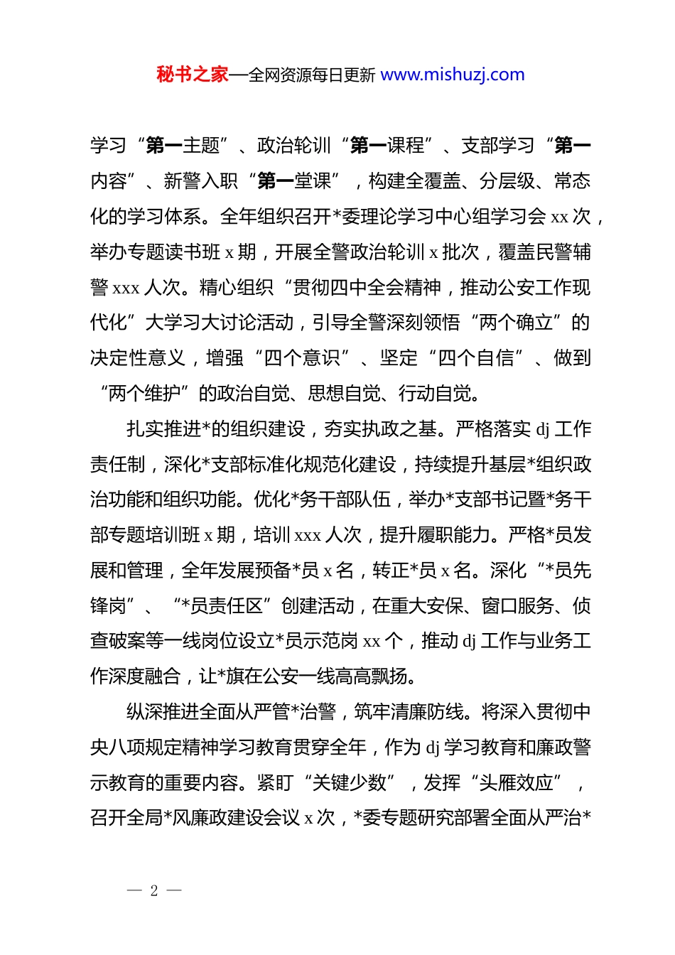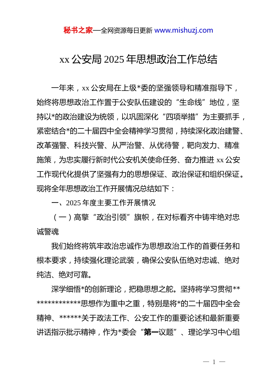 秘书之家—全网资源每日更新 www.mishuzj.comxx 公安局 2025 年思想政治工作总结一年来,xx 公安局在上级*委的坚强领导和精准指导下,始终将思想政治工作置于公安队伍建设的“生命线”地位,坚持以*的政治建设为统领,以巩固深化“四项举措”为主要抓手,紧密结合*的二十届四中全会精神学习贯彻,持续深化政治建警、改革强警、科技兴警、从严治警、从优待警,靶向发力、精准施策,为忠实履行新时代公安机关使命任务、奋力推进 xx 公安工作现代化提供了坚强有力的思想保证、政治保证和组织保证。现将全年思想政治工作开展情况总结如下:一、2025 年度主要工作开展情况(一)高擎“政治引领”旗帜,在对标看齐中铸牢绝对忠诚警魂我们始终将筑牢政治忠诚作为思想政治工作的首要任务和根本要求,持续强化理论武装,确保公安队伍绝对忠诚、绝对纯洁、绝对可靠。深学细悟*的创新理论,把稳思想之舵。坚持将学习贯彻**************思想作为重中之重,特别是将*的二十届四中全会精神、******关于政法工作、公安工作的重要论述和最新重要讲话指示批示精神,作为*委会“第一议题”、理论学习中心组— 1 —秘书之家—全网资源每日更新 www.mishuzj.com学习“第一主题”、政治轮训“第一课程”、支部学习“第一内容”、新警入职“第一堂课”,构建全覆盖、分层级、常态化的学习体系。全年组织召开*委理论学习中心组学习会 xx 次,举办专题读书班 x 期,开展全警政治轮训 x 批次,覆盖民警辅警 xxx 人次。精心组织“贯彻四中全会精神,推动公安工作现代化”大学习大讨论活动,引导全警深刻领悟“两个确立”的决定性意义,增强“四个意识”、坚定“四个自信”、做到“两个维护”的政治自觉、思想自觉、行动自觉。扎实推进*的组织建设,夯实执政之基。严格落实 dj 工作责任制,深化*支部标准化规范化建设,持续提升基层*组织政治功能和组织功能。优化*务干部队伍,举办*支部书记暨*务干部专题培训班 x 期,培训 xxx 人次,提升履职能力。严格*员发展和管理,全年发展预备*员 x 名,转正*员 x 名。深化“*员先锋岗”、“*员责任区”创建活动,在重大安保、窗口服务、侦查破案等一线岗位设立*员示范岗 xx 个,推动 dj 工作与业务工作深度融合,让*旗在公安一线高高飘扬。纵深推进全面从严管*治警,筑牢清廉防线。将深入贯彻中央八项规定精神学习教育贯穿全年,作为 dj 学习教育和廉政警示教育的重要内容。紧盯“关键少数”,发挥“头雁效应”,召开全局*风廉政建设会议 x 次,*委专题研究部署全面从严治*— 2 —秘书之家—全网资源每日更新 www.mishuzj.com工作 x 次。组织全体民警辅警深入学习新修订的《中国共产 dj律处分条例》,集中观看警示教育片《xxx》等 xx 场次,参观廉政教育基地 x 次,编发典型案例通报 x 期。全覆盖组织签订《遵守严禁违规宴请饮酒规定承诺书》等责任书 xxx 余份。聚焦重要节点、重点领域、关键环节,常态化开展明察暗访和专项督察,对苗头性、倾向性问题及时提醒纠正,持续释放严字当头、一严到底的强烈信号,不断夯实全警知敬畏、存戒惧、守底线的思想根基。(二)聚焦“能力提升”工程,在实战砺兵中锻造过硬公安铁军我们牢固树立战斗力标准,围绕公安工作现代化要求,将思想政治工作融入练兵备战全过程,着力提升队伍专业素养和实战本领。构建精准化实战培训体系。紧扣维护安全稳定实战需求,制定年度教育训练计划,优化课程设置,涵盖政治理论、法律法规、科技应用、警务技能、应急处突、群众工作、心理健康等模块。坚持“警种主训、分级实施”,治安、刑侦、法制、网安、交警等主要警种按计划开展专业培训 xx 期。创新推行“微课堂”、“案例教学”、“红蓝对抗”等教学模式,增强培训的针对性和实效性。特别加强了对新型犯罪打击、涉网案— 3 —秘书之家—全网资源每日更新 www.mishuzj.com件侦办、重大风险防控等前沿领域的能力培训。深化常态化岗位练兵机制。巩固拓展“一所一队一教官”机制成果,推动练兵模式从集中阶段性向岗位常态化转变。各基层所队小教官围绕基础体能、武器警械使用、现场处置规...