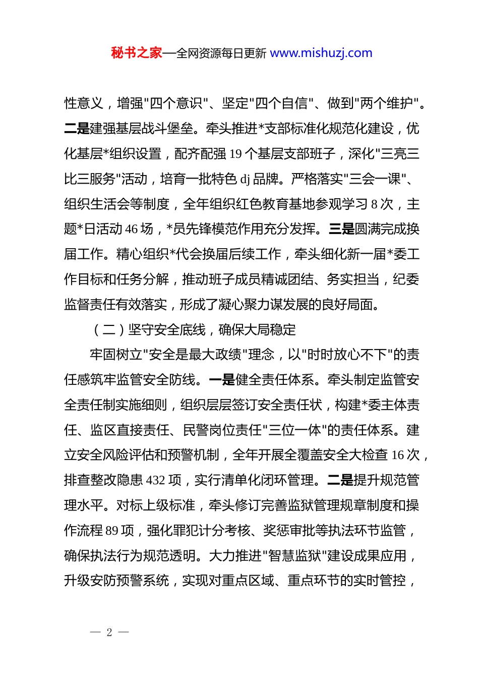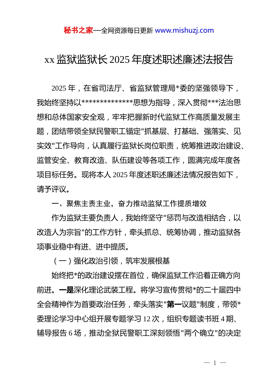 秘书之家—全网资源每日更新 www.mishuzj.comxx 监狱监狱长 2025 年度述职述廉述法报告2025 年,在省司法厅、省监狱管理局*委的坚强领导下,我始终坚持以**************思想为指导,深入贯彻***法治思想和总体国家安全观,牢牢把握新时代监狱工作高质量发展主题,团结带领全狱民警职工锚定"抓基层、打基础、强落实、见实效"工作导向,认真履行监狱长岗位职责,统筹推进政治建设、监管安全、教育改造、队伍建设等各项工作,圆满完成年度各项目标任务。现将本人 2025 年度述职述廉述法情况报告如下,请予评议。一、聚焦主责主业,奋力推动监狱工作提质增效作为监狱主要负责人,我始终坚守"惩罚与改造相结合,以改造人为宗旨"的工作方针,牵头抓总、统筹协调,推动监狱各项事业稳中有进、进中提质。(一)强化政治引领,筑牢发展根基始终把*的政治建设摆在首位,确保监狱工作沿着正确方向前进。一是深化理论武装工程。将学习宣传贯彻*的二十届四中全会精神作为首要政治任务,牵头落实"第一议题"制度,带领*委理论学习中心组开展专题学习 12 次,组织专题读书班 4 期、辅导报告 6 场,推动全狱民警职工深刻领悟"两个确立"的决定— 1 —秘书之家—全网资源每日更新 www.mishuzj.com性意义,增强"四个意识"、坚定"四个自信"、做到"两个维护"。二是建强基层战斗堡垒。牵头推进*支部标准化规范化建设,优化基层*组织设置,配齐配强 19 个基层支部班子,深化"三亮三比三服务"活动,培育一批特色 dj 品牌。严格落实"三会一课"、组织生活会等制度,全年组织红色教育基地参观学习 8 次,主题*日活动 46 场,*员先锋模范作用充分发挥。三是圆满完成换届工作。精心组织*代会换届后续工作,牵头细化新一届*委工作目标和任务分解,推动班子成员精诚团结、务实担当,纪委监督责任有效落实,形成了凝心聚力谋发展的良好局面。(二)坚守安全底线,确保大局稳定牢固树立"安全是最大政绩"理念,以"时时放心不下"的责任感筑牢监管安全防线。一是健全责任体系。牵头制定监管安全责任制实施细则,组织层层签订安全责任状,构建*委主体责任、监区直接责任、民警岗位责任"三位一体"的责任体系。建立安全风险评估和预警机制,全年开展全覆盖安全大检查 16 次,排查整改隐患 432 项,实行清单化闭环管理。二是提升规范管理水平。对标上级标准,牵头修订完善监狱管理规章制度和操作流程 89 项,强化罪犯计分考核、奖惩审批等执法环节监管,确保执法行为规范透明。大力推进"智慧监狱"建设成果应用,升级安防预警系统,实现对重点区域、重点环节的实时管控,— 2 —秘书之家—全网资源每日更新 www.mishuzj.com科技赋能成效显著。三是强化风险防控。聚焦重点人员、重点物品、重点时段,建立动态管控机制,全年管控重点罪犯 236名,清缴危险物品 15 件。常态化开展防脱逃、防暴狱等应急演练 28 次,联合驻地武警、公安等部门开展联防联控演练 6 次,民警应急处突能力显著提升。2025 年,监狱未发生重大监管安全事故,持续保持安全稳定良好局面。(三)创新改造方式,提升矫治质效坚持以改造人为核心,不断优化教育改造体系,着力降低再犯罪率。一是深化思想教育。牵头确立政治改造统领地位,将法治教育、道德教育、形势政策教育融入日常,创新运用多媒体、电化教育等手段,开展专题教育活动 96 场,受教育罪犯达 1.2 万人次,引导罪犯认罪悔罪、遵规守纪。二是拓展教育帮扶渠道。组织开展扫盲、小学、初中阶段文化教育,386 名罪犯完成学历提升,152 名罪犯报名参加高等教育自学考试。对接社会需求,开设电工、焊工、家政等职业技能培训项目 12个,468 名罪犯获得职业资格证书。优化亲情会见、亲情电话制度,组织春节、中秋等节日亲情帮教活动 8 场,接待家属会见 1.8 万人次,引入社会组织帮教志愿者 36 名,构建多元化帮教体系。三是加强心理矫治。牵头完善心理健康指导中心建设,配齐 8 名专业心理矫治民警,开展全员心理普测 2 次,建立心— 3 —秘书之家—全网资源每日更新 www.mishuzj.com理健康档案 3200 余份。对 196 名存在心理问题的...