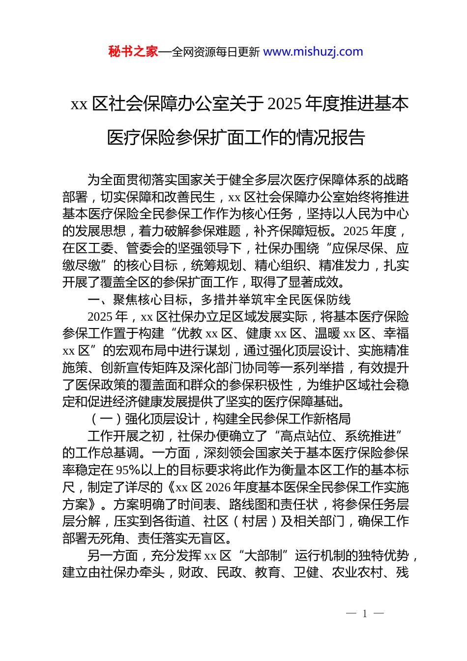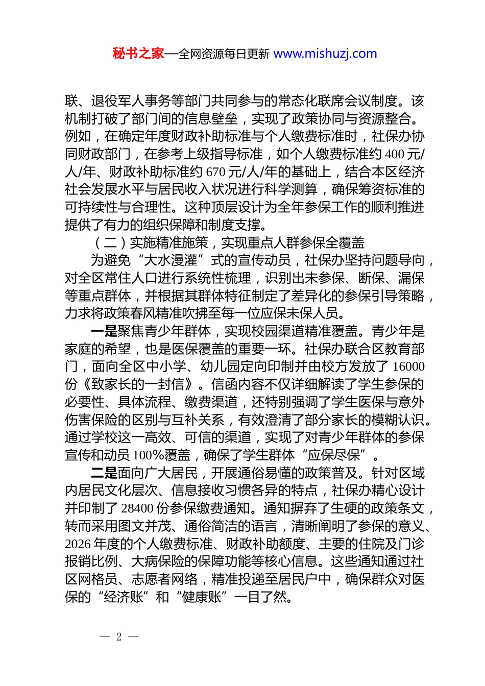 秘书之家—全网资源每日更新 www.mishuzj.comxx 区社会保障办公室关于 2025 年度推进基本医疗保险参保扩面工作的情况报告为全面贯彻落实国家关于健全多层次医疗保障体系的战略部署,切实保障和改善民生,xx 区社会保障办公室始终将推进基本医疗保险全民参保工作作为核心任务,坚持以人民为中心的发展思想,着力破解参保难题,补齐保障短板。2025 年度,在区工委、管委会的坚强领导下,社保办围绕“应保尽保、应缴尽缴”的核心目标,统筹规划、精心组织、精准发力,扎实开展了覆盖全区的参保扩面工作,取得了显著成效。一、聚焦核心目标,多措并举筑牢全民医保防线2025 年,xx 区社保办立足区域发展实际,将基本医疗保险参保工作置于构建“优教 xx 区、健康 xx 区、温暖 xx 区、幸福xx 区”的宏观布局中进行谋划,通过强化顶层设计、实施精准施策、创新宣传矩阵及深化部门协同等一系列举措,有效提升了医保政策的覆盖面和群众的参保积极性,为维护区域社会稳定和促进经济健康发展提供了坚实的医疗保障基础。(一)强化顶层设计,构建全民参保工作新格局工作开展之初,社保办便确立了“高点站位、系统推进”的工作总基调。一方面,深刻领会国家关于基本医疗保险参保率稳定在 95%以上的目标要求将此作为衡量本区工作的基本标尺,制定了详尽的《xx 区 2026 年度基本医保全民参保工作实施方案》。方案明确了时间表、路线图和责任状,将参保任务层层分解,压实到各街道、社区(村居)及相关部门,确保工作部署无死角、责任落实无盲区。另一方面,充分发挥 xx 区“大部制”运行机制的独特优势,建立由社保办牵头,财政、民政、教育、卫健、农业农村、残— 1 —秘书之家—全网资源每日更新 www.mishuzj.com联、退役军人事务等部门共同参与的常态化联席会议制度。该机制打破了部门间的信息壁垒,实现了政策协同与资源整合。例如,在确定年度财政补助标准与个人缴费标准时,社保办协同财政部门,在参考上级指导标准,如个人缴费标准约 400 元/人/年、财政补助标准约 670 元/人/年的基础上,结合本区经济社会发展水平与居民收入状况进行科学测算,确保筹资标准的可持续性与合理性。这种顶层设计为全年参保工作的顺利推进提供了有力的组织保障和制度支撑。(二)实施精准施策,实现重点人群参保全覆盖为避免“大水漫灌”式的宣传动员,社保办坚持问题导向,对全区常住人口进行系统性梳理,识别出未参保、断保、漏保等重点群体,并根据其群体特征制定了差异化的参保引导策略,力求将政策春风精准吹拂至每一位应保未保人员。一是聚焦青少年群体,实现校园渠道精准覆盖。青少年是家庭的希望,也是医保覆盖的重要一环。社保办联合区教育部门,面向全区中小学、幼儿园定向印制并由校方发放了 16000份《致家长的一封信》。信函内容不仅详细解读了学生参保的必要性、具体流程、缴费渠道,还特别强调了学生医保与意外伤害保险的区别与互补关系,有效澄清了部分家长的模糊认识。通过学校这一高效、可信的渠道,实现了对青少年群体的参保宣传和动员 100%覆盖,确保了学生群体“应保尽保”。二是面向广大居民,开展通俗易懂的政策普及。针对区域内居民文化层次、信息接收习惯各异的特点,社保办精心设计并印制了 28400 份参保缴费通知。通知摒弃了生硬的政策条文,转而采用图文并茂、通俗简洁的语言,清晰阐明了参保的意义、2026 年度的个人缴费标准、财政补助额度、主要的住院及门诊报销比例、大病保险的保障功能等核心信息。这些通知通过社区网格员、志愿者网络,精准投递至居民户中,确保群众对医保的“经济账”和“健康账”一目了然。— 2 —秘书之家—全网资源每日更新 www.mishuzj.com三是关注特殊困难群体,提供兜底保障。针对低保对象、特困供养人员、重度残疾人、孤儿等特殊困难群体,社保办主动对接民政、残联等部门,获取精准名单。通过信息比对,筛选出未参保人员,由街道和社区工作人员提供“一对一”的上门服务,协助办理参保登记与缴费手续,并落实相关的政府资助参保政策确保这部分最需要医疗保障的群体能够及时、无障碍地被纳入保障范围,织密织牢了...