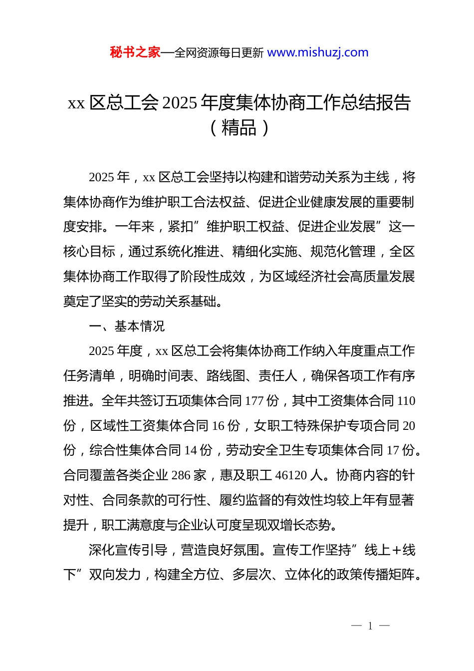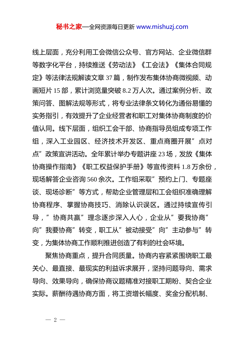 秘书之家—全网资源每日更新 www.mishuzj.comxx 区总工会 2025 年度集体协商工作总结报告(精品)2025 年,xx 区总工会坚持以构建和谐劳动关系为主线,将集体协商作为维护职工合法权益、促进企业健康发展的重要制度安排。一年来,紧扣”维护职工权益、促进企业发展”这一核心目标,通过系统化推进、精细化实施、规范化管理,全区集体协商工作取得了阶段性成效,为区域经济社会高质量发展奠定了坚实的劳动关系基础。一、基本情况2025 年度,xx 区总工会将集体协商工作纳入年度重点工作任务清单,明确时间表、路线图、责任人,确保各项工作有序推进。全年共签订五项集体合同 177 份,其中工资集体合同 110份,区域性工资集体合同 16 份,女职工特殊保护专项合同 20份,综合性集体合同 14 份,劳动安全卫生专项集体合同 17 份。合同覆盖各类企业 286 家,惠及职工 46120 人。协商内容的针对性、合同条款的可行性、履约监督的有效性均较上年有显著提升,职工满意度与企业认可度呈现双增长态势。深化宣传引导,营造良好氛围。宣传工作坚持”线上+线下”双向发力,构建全方位、多层次、立体化的政策传播矩阵。— 1 —秘书之家—全网资源每日更新 www.mishuzj.com线上层面,充分利用工会微信公众号、官方网站、企业微信群等数字化平台,持续推送《劳动法》《工会法》《集体合同规定》等法律法规解读文章 37 篇,制作发布集体协商微视频、动画短片 15 部,累计浏览量突破 8.2 万人次。通过案例分析、政策问答、图解法规等形式,将专业法律条文转化为通俗易懂的实务指引,有效提升了企业经营者和职工对集体协商制度的价值认同。线下层面,组织工会干部、协商指导员组成专项工作组,深入工业园区、经济技术开发区、重点商圈开展”点对点”政策宣讲活动。全年累计举办专题讲座 23 场,发放《集体协商操作指南》《职工权益保护手册》等宣传资料 1.8 万余份,现场解答企业咨询 560 余次。工作组采取”预约上门、专题座谈、现场诊断”等方式,帮助企业管理层和工会组织准确理解协商程序、掌握协商技巧、消除认识误区。通过持续宣传引导,”协商共赢”理念逐步深入人心,企业从”要我协商”向”我要协商”转变,职工从”被动接受”向”主动参与”转变,为集体协商工作顺利推进创造了有利的社会环境。聚焦协商重点,提升合同质量。协商内容紧紧围绕职工最关心、最直接、最现实的利益诉求展开,坚持问题导向、需求导向、效果导向,确保协商议题精准对接职工期盼、契合企业实际。薪酬待遇协商方面,将工资增长幅度、奖金分配机制、— 2 —秘书之家—全网资源每日更新 www.mishuzj.com津贴补贴标准、技能人才薪酬激励等作为核心议题,推动建立职工工资与企业经济效益同步增长的长效机制。全年通过协商确定工资平均增长幅度为 4.8%,其中制造业企业职工工资增长5.2%,服务业企业职工工资增长 4.5%,建筑业企业职工工资增长 4.3%。协商确定的薪酬增长机制既考虑了企业的经营状况和承受能力,又保障了职工分享企业发展成果的权利,实现了企业发展与职工增收的良性互动。劳动标准协商方面,重点就工作时间、休息休假、劳动定额、加班加点工资支付等进行细化明确。针对部分行业存在的超时加班问题,协商确定实行综合计算工时制的企业必须保障职工月均加班时间不超过 36 小时,并严格按照法定标准支付加班工资。休息休假方面,明确职工带薪年休假、探亲假、婚丧假、生育假等权益,推动企业将法定节假日之外的福利假期写入合同条款。劳动安全卫生协商方面,将职业病防护、安全生产条件改善、劳动防护用品配备、职工健康体检等内容纳入专项合同,全年推动企业投入安全生产改善资金 3200 万元,为职工配备标准化劳动防护用品 4.6 万套。女职工特殊保护方面,专项合同明确女职工”四期”保护、禁忌劳动范围、生育保险待遇、母婴设施建设等内容,推动 85家百人以上企业建立女职工关爱室,为孕期、哺乳期女职工提供人性化服务。合同审查环节,建立”企业自审、上级工会初— 3 —秘书之家—全网资源每日更新 www.mishuzj.com审、人社部门终审”三级审查机制,...