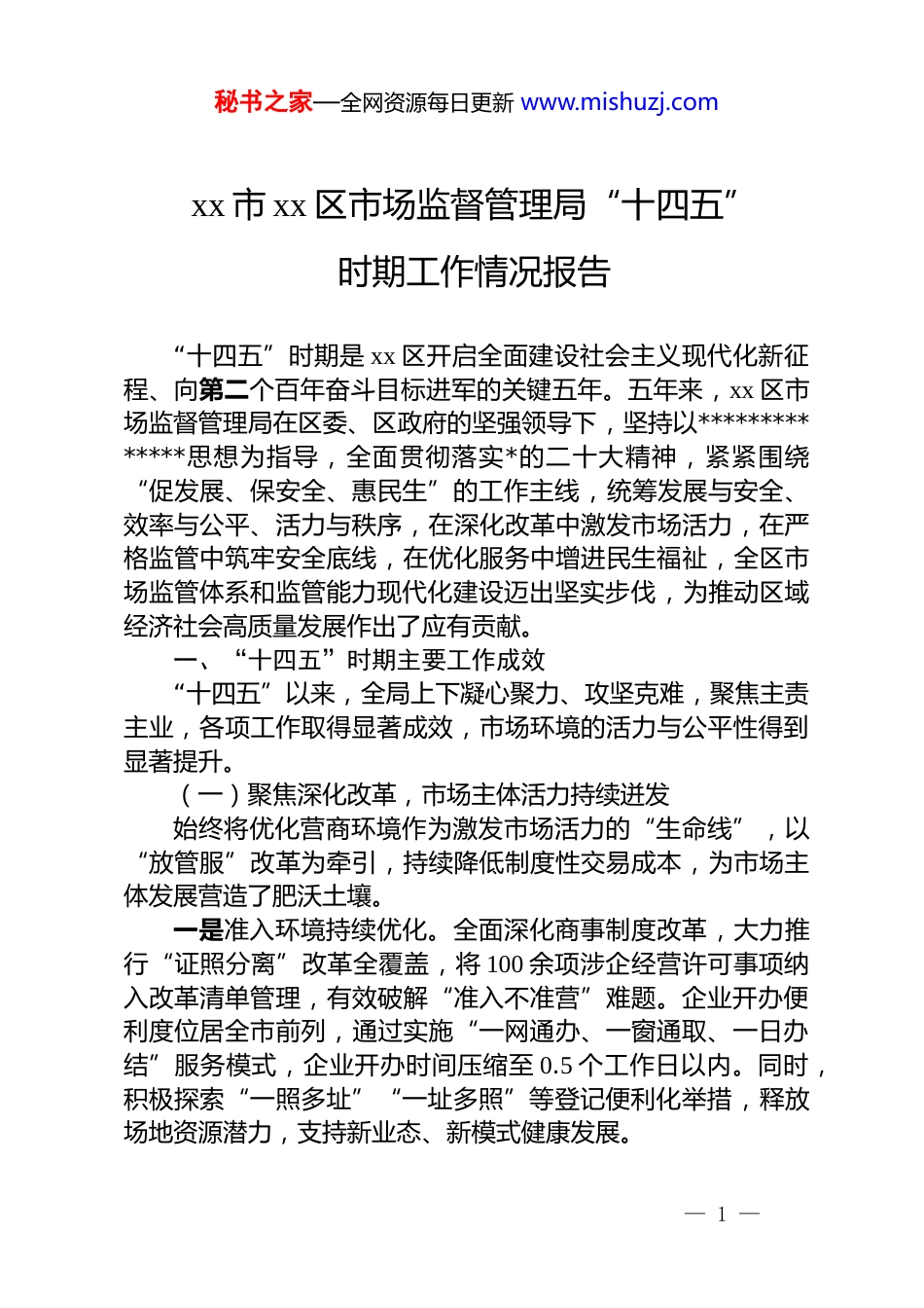 秘书之家—全网资源每日更新 www.mishuzj.comxx 市 xx 区市场监督管理局“十四五”时期工作情况报告“十四五”时期是 xx 区开启全面建设社会主义现代化新征程、向第二个百年奋斗目标进军的关键五年。五年来,xx 区市场监督管理局在区委、区政府的坚强领导下,坚持以**************思想为指导,全面贯彻落实*的二十大精神,紧紧围绕“促发展、保安全、惠民生”的工作主线,统筹发展与安全、效率与公平、活力与秩序,在深化改革中激发市场活力,在严格监管中筑牢安全底线,在优化服务中增进民生福祉,全区市场监管体系和监管能力现代化建设迈出坚实步伐,为推动区域经济社会高质量发展作出了应有贡献。一、“十四五”时期主要工作成效“十四五”以来,全局上下凝心聚力、攻坚克难,聚焦主责主业,各项工作取得显著成效,市场环境的活力与公平性得到显著提升。(一)聚焦深化改革,市场主体活力持续迸发始终将优化营商环境作为激发市场活力的“生命线”,以“放管服”改革为牵引,持续降低制度性交易成本,为市场主体发展营造了肥沃土壤。一是准入环境持续优化。全面深化商事制度改革,大力推行“证照分离”改革全覆盖,将 100 余项涉企经营许可事项纳入改革清单管理,有效破解“准入不准营”难题。企业开办便利度位居全市前列,通过实施“一网通办、一窗通取、一日办结”服务模式,企业开办时间压缩至 0.5 个工作日以内。同时,积极探索“一照多址”“一址多照”等登记便利化举措,释放场地资源潜力,支持新业态、新模式健康发展。— 1 —秘书之家—全网资源每日更新 www.mishuzj.com二是市场主体量质齐升。通过一系列改革举措的落地见效,极大激发了社会创业创新热情。截至 2025 年 10 月底,全区登记在册市场主体总量突破 35 万户,较“十三五”期末增长超过40%,其中企业数量占比提升至 45%以上,主体结构不断优化。五年间,全区新设市场主体超过 12 万户,为稳增长、保就业提供了坚实支撑。三是退出机制不断完善。建立健全市场主体强制退出和简易注销制度,畅通市场主体退出渠道。对于长期未经营、无法取得联系的“僵尸企业”,依法予以清理吊销;对于无债权债务或已结清债权债务的合规企业,适用简易注销程序,实现市场新陈代谢的良性循环。“十四五”期间,累计引导超过 3.8万户市场主体通过便捷渠道有序退出市场,有效净化了市场环境。(二)聚焦质量强区,经济发展动能显著增强坚持质量第一、效益优先,深入实施质量强区战略和知识产权战略,将质量、标准、品牌、专利等要素作为推动经济高质量发展的重要引擎。一是质量基础建设全面加强。构建和完善政府质量奖评选机制,激励企业追求卓越绩效。五年间,共引导 2 家企业获得xx 省政府质量奖提名,8 家企业获得 xx 市政府质量奖。深入开展重点产业质量提升行动,围绕汽车及新能源汽车、智能家居、精细化工等支柱产业,组织质量技术专家“问诊把脉”,解决质量瓶颈问题近百项。全区制造业产品质量合格率稳定保持在96%以上。二是标准化引领作用日益凸显。鼓励和支持企事业单位参与国际、国家、行业及地方标准的制修订工作,抢占产业发展话语权。“十四五”期间,区内企业主导或参与制修订国际、国家及行业标准 25 项,发布实施先进团体标准 12 项。标准化工作的深化,有效提升了区域产业的核心竞争力。— 2 —秘书之家—全网资源每日更新 www.mishuzj.com三是知识产权创造运用保护水平大幅提升。建立知识产权“严保护、大保护、快保护、同保护”工作格局,严厉打击专利侵权、商标假冒等违法行为。五年间,共办理知识产权行政处罚案件 350 余宗。同时,强化知识产权公共服务,设立知识产权维权援助工作站,提供一站式服务。全区知识产权创造量质齐升,累计有效发明专利拥有量达 3000 余件,有效注册商标拥有量超 5 万件,分别较“十三五”期末增长 65%和 50%,每万人口高价值发明专利拥有量达到全市平均水平。(三)聚焦公平竞争,统一大市场根基不断夯实坚持监管规范和促进发展并重,强化竞争政策基础地位,着力破除地方保护和市场分割,为各类市场主体营造公平竞争的市场环境。一...