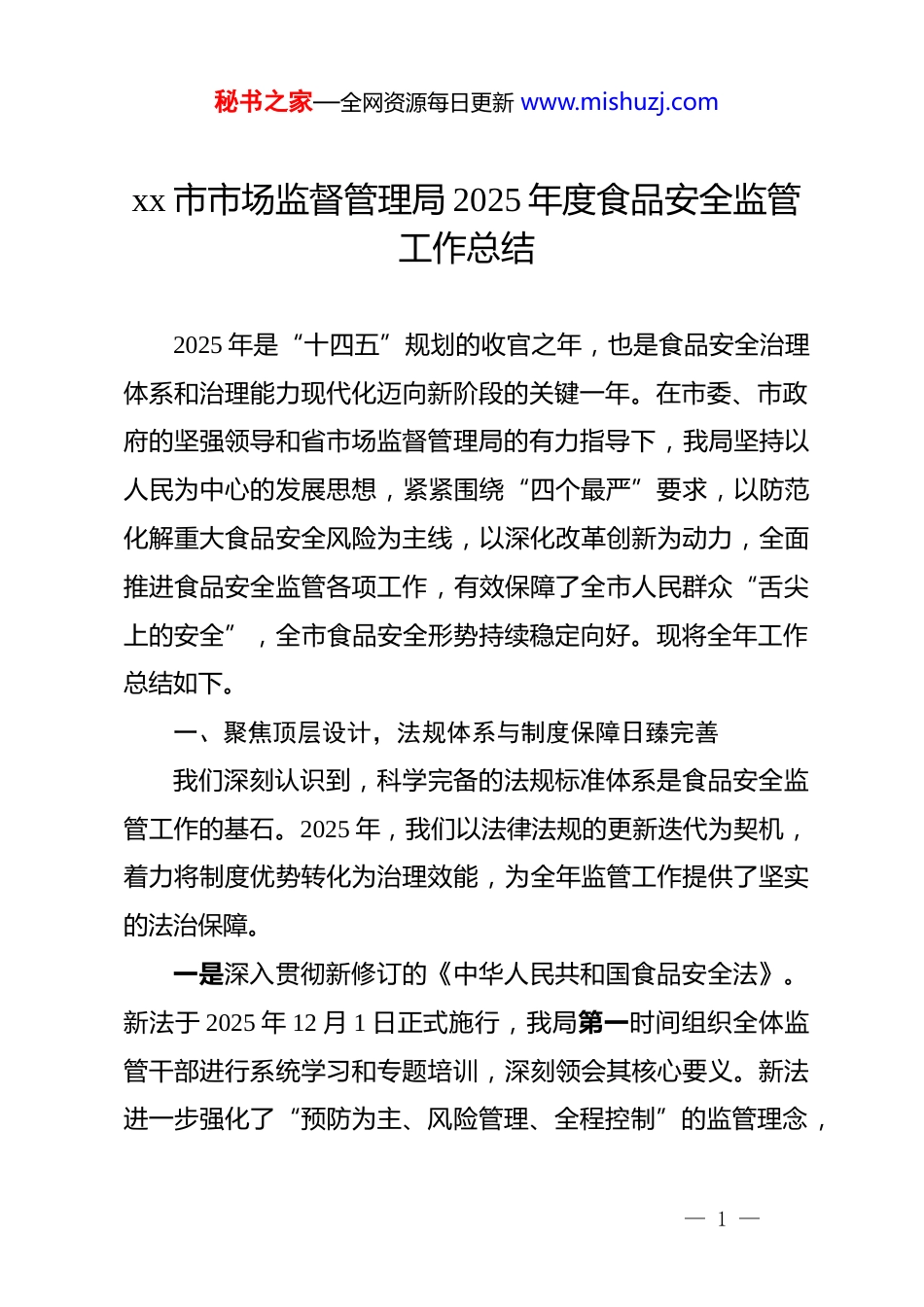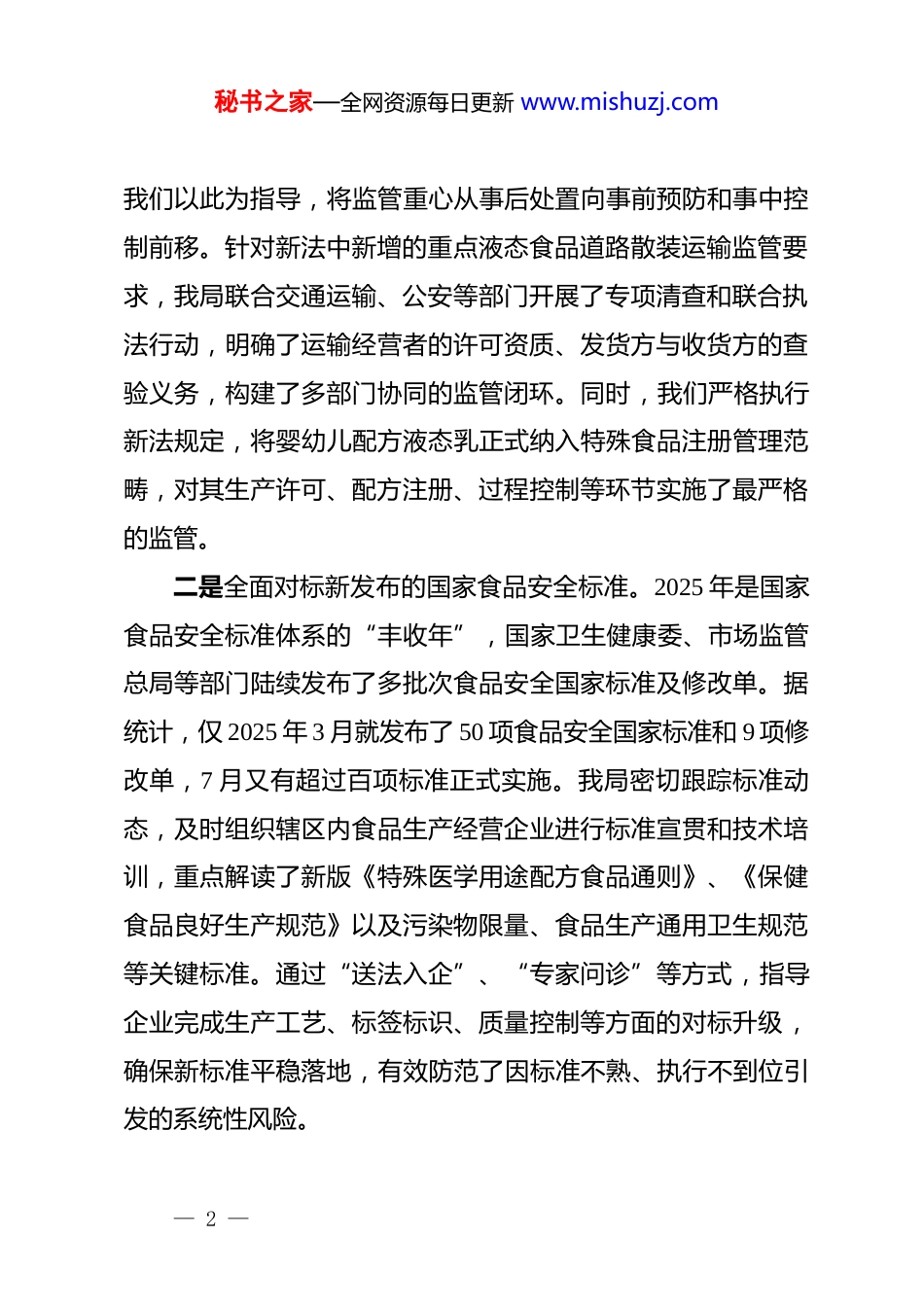 秘书之家—全网资源每日更新 www.mishuzj.comxx 市市场监督管理局 2025 年度食品安全监管工作总结2025 年是“十四五”规划的收官之年,也是食品安全治理体系和治理能力现代化迈向新阶段的关键一年。在市委、市政府的坚强领导和省市场监督管理局的有力指导下,我局坚持以人民为中心的发展思想,紧紧围绕“四个最严”要求,以防范化解重大食品安全风险为主线,以深化改革创新为动力,全面推进食品安全监管各项工作,有效保障了全市人民群众“舌尖上的安全”,全市食品安全形势持续稳定向好。现将全年工作总结如下。一、聚焦顶层设计,法规体系与制度保障日臻完善我们深刻认识到,科学完备的法规标准体系是食品安全监管工作的基石。2025 年,我们以法律法规的更新迭代为契机,着力将制度优势转化为治理效能,为全年监管工作提供了坚实的法治保障。一是深入贯彻新修订的《中华人民共和国食品安全法》。新法于 2025 年 12 月 1 日正式施行,我局第一时间组织全体监管干部进行系统学习和专题培训,深刻领会其核心要义。新法进一步强化了“预防为主、风险管理、全程控制”的监管理念,— 1 —秘书之家—全网资源每日更新 www.mishuzj.com我们以此为指导,将监管重心从事后处置向事前预防和事中控制前移。针对新法中新增的重点液态食品道路散装运输监管要求,我局联合交通运输、公安等部门开展了专项清查和联合执法行动,明确了运输经营者的许可资质、发货方与收货方的查验义务,构建了多部门协同的监管闭环。同时,我们严格执行新法规定,将婴幼儿配方液态乳正式纳入特殊食品注册管理范畴,对其生产许可、配方注册、过程控制等环节实施了最严格的监管。二是全面对标新发布的国家食品安全标准。2025 年是国家食品安全标准体系的“丰收年”,国家卫生健康委、市场监管总局等部门陆续发布了多批次食品安全国家标准及修改单。据统计,仅 2025 年 3 月就发布了 50 项食品安全国家标准和 9 项修改单,7 月又有超过百项标准正式实施。我局密切跟踪标准动态,及时组织辖区内食品生产经营企业进行标准宣贯和技术培训,重点解读了新版《特殊医学用途配方食品通则》、《保健食品良好生产规范》以及污染物限量、食品生产通用卫生规范等关键标准。通过“送法入企”、“专家问诊”等方式,指导企业完成生产工艺、标签标识、质量控制等方面的对标升级,确保新标准平稳落地,有效防范了因标准不熟、执行不到位引发的系统性风险。— 2 —秘书之家—全网资源每日更新 www.mishuzj.com三是积极应对新兴业态的监管挑战。针对预制菜、代餐食品等新兴食品业态的快速发展,我局依据 2025 年 3 月多部门联合印发的《关于加强预制菜食品安全监管促进产业高质量发展的通知》以及新修订《食品安全法》中补充的原则性规定,率先在全市范围内开展了预制菜生产经营状况摸底排查。我们明确了预制菜的定义范围,严禁使用防腐剂,并要求生产企业严格落实原料采购、生产过程控制、贮存运输等环节的主体责任。同时,加大了对代餐食品、功能性饮料等产品的监督抽检力度,严厉打击虚假宣传、非法添加等违法行为,填补了新兴领域的监管盲区。二、创新监管手段,智慧赋能与精准施策成效显著面对日益复杂的食品安全形势和有限的监管资源,我局大力推进智慧监管建设,以数字化、智能化手段驱动监管方式变革,显著提升了监管的靶向性和有效性。一是深化智慧追溯平台应用。在全省统一建设的“xx 省食品安全智慧追溯平台”基础上,我局大力推动辖区内食品生产经营主体入驻。通过政策引导和技术帮扶,2025 年新增 257 家食品生产经营主体成功接入平台,实现了产品从原料采购到成品销售的全程数字化追溯。我们还指导和帮扶了 42 家基础薄弱的食品生产小作坊进行提档升级,通过引入二维码、电子台账— 3 —秘书之家—全网资源每日更新 www.mishuzj.com等简易追溯手段,使其初步具备了来源可查、去向可追的能力。智慧追-溯体系的广泛应用,不仅强化了企业的主体责任意识,也为我局开展精准监管、快速处置风险事件提供了强大的数据支持。二是探索人工智能与大数据应用。我局积极探索将人工智能、大...