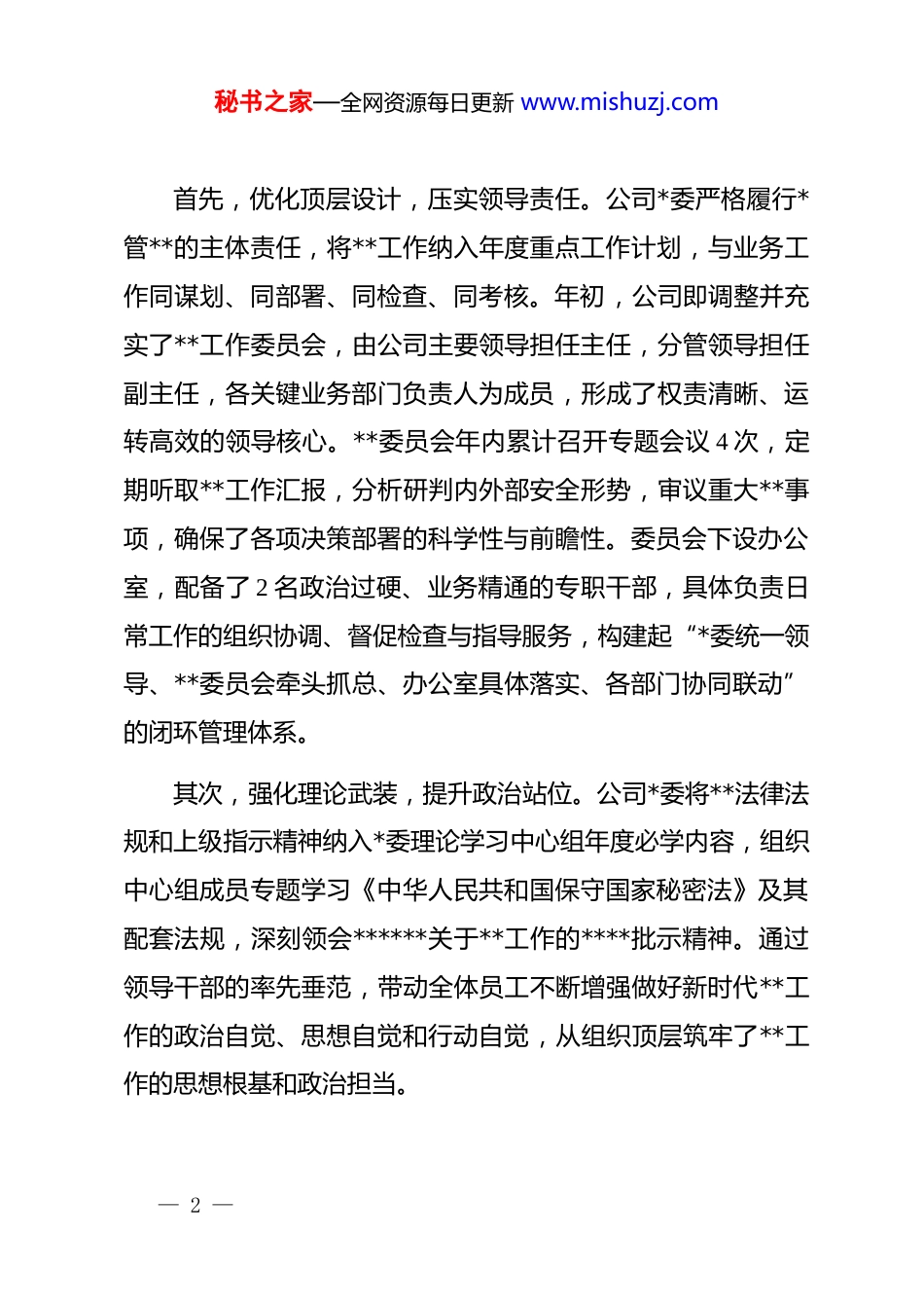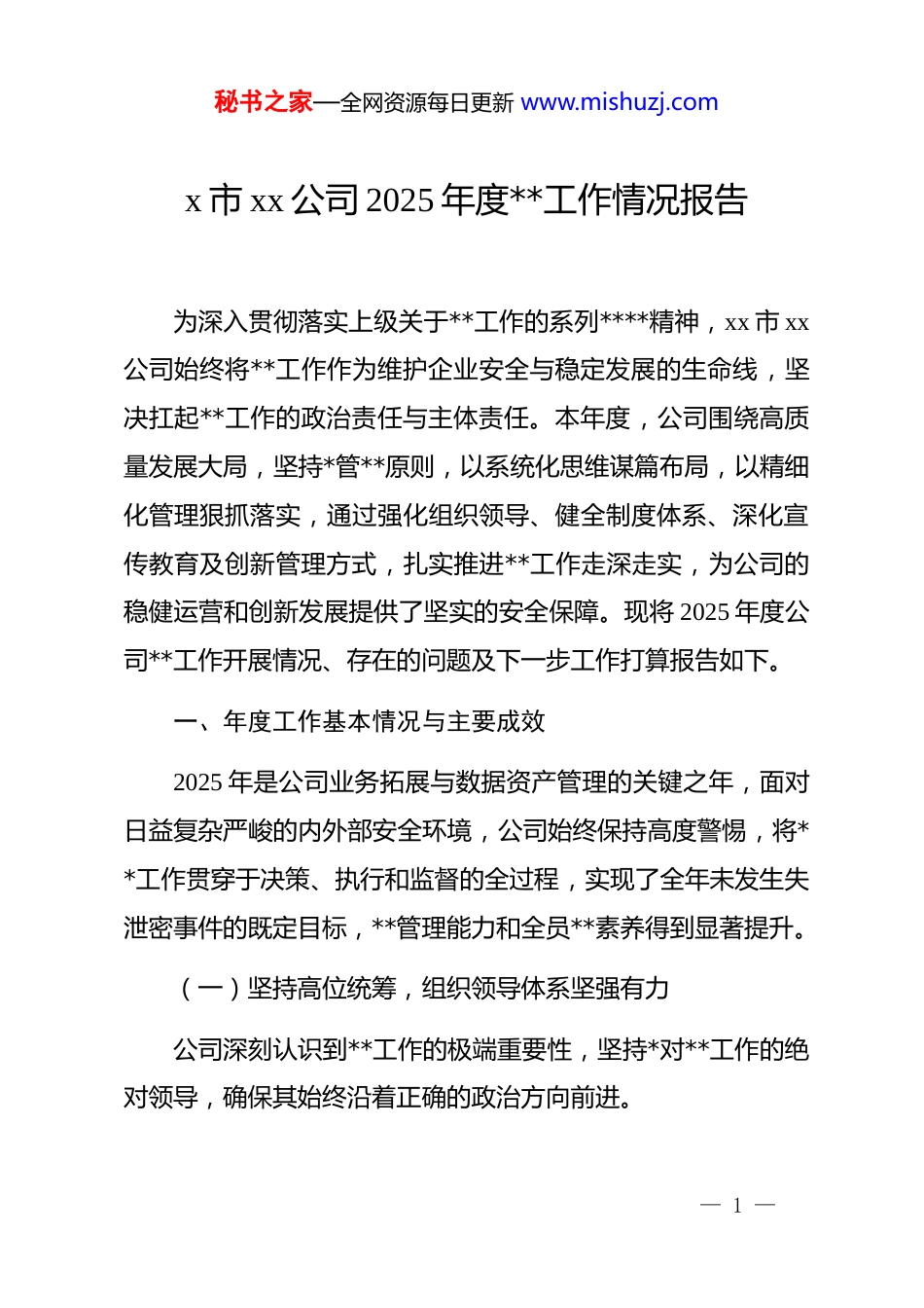 秘书之家—全网资源每日更新 www.mishuzj.comx 市 xx 公司 2025 年度**工作情况报告为深入贯彻落实上级关于**工作的系列****精神,xx 市 xx公司始终将**工作作为维护企业安全与稳定发展的生命线,坚决扛起**工作的政治责任与主体责任。本年度,公司围绕高质量发展大局,坚持*管**原则,以系统化思维谋篇布局,以精细化管理狠抓落实,通过强化组织领导、健全制度体系、深化宣传教育及创新管理方式,扎实推进**工作走深走实,为公司的稳健运营和创新发展提供了坚实的安全保障。现将 2025 年度公司**工作开展情况、存在的问题及下一步工作打算报告如下。一、年度工作基本情况与主要成效2025 年是公司业务拓展与数据资产管理的关键之年,面对日益复杂严峻的内外部安全环境,公司始终保持高度警惕,将**工作贯穿于决策、执行和监督的全过程,实现了全年未发生失泄密事件的既定目标,**管理能力和全员**素养得到显著提升。(一)坚持高位统筹,组织领导体系坚强有力公司深刻认识到**工作的极端重要性,坚持*对**工作的绝对领导,确保其始终沿着正确的政治方向前进。— 1 —秘书之家—全网资源每日更新 www.mishuzj.com首先,优化顶层设计,压实领导责任。公司*委严格履行*管**的主体责任,将**工作纳入年度重点工作计划,与业务工作同谋划、同部署、同检查、同考核。年初,公司即调整并充实了**工作委员会,由公司主要领导担任主任,分管领导担任副主任,各关键业务部门负责人为成员,形成了权责清晰、运转高效的领导核心。**委员会年内累计召开专题会议 4 次,定期听取**工作汇报,分析研判内外部安全形势,审议重大**事项,确保了各项决策部署的科学性与前瞻性。委员会下设办公室,配备了 2 名政治过硬、业务精通的专职干部,具体负责日常工作的组织协调、督促检查与指导服务,构建起“*委统一领导、**委员会牵头抓总、办公室具体落实、各部门协同联动”的闭环管理体系。其次,强化理论武装,提升政治站位。公司*委将**法律法规和上级指示精神纳入*委理论学习中心组年度必学内容,组织中心组成员专题学习《中华人民共和国保守国家秘密法》及其配套法规,深刻领会******关于**工作的****批示精神。通过领导干部的率先垂范,带动全体员工不断增强做好新时代**工作的政治自觉、思想自觉和行动自觉,从组织顶层筑牢了**工作的思想根基和政治担当。— 2 —秘书之家—全网资源每日更新 www.mishuzj.com(二)聚焦制度建设,风险防控屏障严密牢固制度是**工作的基石。公司立足于智慧城市建设运营和数据资产管理的核心业务特点,着力构建一套覆盖全面、流程清晰、管控严密的制度防护体系。第一,完善制度框架,提升规范化水平。针对业务发展中出现的新情况、新问题,公司于 2025 年第二季度组织对现有**管理制度进行了全面梳理与修订,印发了《xx 公司定密管理办法》《xx 公司涉密人员管理细则》以及《xx 公司信息发布**审查规定》等一系列核心制度文件。新制度体系科学界定了国家秘密、工作秘密和商业秘密的范围与标准,细化了从定密、变更到解密的完整流程,确保定密工作的精准性与合法性。截至目前,公司已建立覆盖**工作全链条的制度规范 20 余项,制度的针对性、系统性与可操作性显著增强。第二,精准识别风险,落实岗位责任。公司严格依据“最小化、必要性”原则,科学界定并动态调整涉密岗位与涉密人员范围。目前,公司共确定核心涉密岗位 15 个,在岗涉密人员32 名。公司坚持严把涉密人员的“入口关”,从政治素质、业务能力、道德品行、责任意识等方面进行全面审查,确保涉密队伍的绝对忠诚与可靠。同时,将**责任明确分解到岗、落实— 3 —秘书之家—全网资源每日更新 www.mishuzj.com到人,公司主要负责人与各部门负责人、部门负责人与关键岗位员工逐级签订了《**责任书》与《**承诺书》,累计签订 98份。通过这种方式,形成了一级抓一级、层层抓落实的责任闭环,有效推动了**责任由“纸面”要求转化为“岗位”行动。(三)深化宣教培训,全员**防线持续巩固公司坚持人是**工作的第一道防线,持续创新宣传教育形式,着力培育“人人知**、时时讲*...
