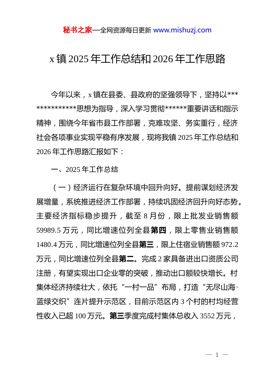 秘书之家—全网资源每日更新 www.mishuzj.comx 镇 2025 年工作总结和 2026 年工作思路今年以来,x 镇在县委、县政府的坚强领导下,坚持以**************思想为指导,深入学习贯彻******重要讲话和指示精神,围绕今年省市县工作部署,克难攻坚、务实重行,经济社会各项事业实现平稳有序发展,现将我镇 2025 年工作总结和2026 年工作思路汇报如下:一、2025 年工作总结(一)经济运行在复杂环境中回升向好。提前谋划经济发展增量,系统推进经济工作部署,持续巩固经济回升向好态势。主要经济指标稳步提升,截至 8 月份,限上批发业销售额59989.5 万元,同比增速位列全县第四,限上零售业销售额1480.4 万元,同比增速位列全县第三,限上住宿业销售额 972.2万元,同比增速位列全县第二。完成 2 家具备进出口资质公司注册,有望实现出口企业零的突破,推动出口额较快增长。村集体经济持续壮大,依托“一村一品”布局,打造“无尽山海·蓝绿交织”连片提升示范区,目前示范区内 3 个村的村均经营性收入已超 100 万元。第三季度完成村集体总收入 3552 万元,— 1 —秘书之家—全网资源每日更新 www.mishuzj.com经营性收入 2440 万元,营收达 50 万元以上村社达 10 个,“集体经济”指标在全市第一季度“六比竞赛”中位列生态型乡镇第一,连续两年前三。(二)发展动能在克难攻坚中加速释放。牢固树立“项目为王”理念,实行“一个项目、一个专班、一套方案”推进机制,倒排工期、挂图作战,推动项目建设全面提速增效。x 小镇北部拓展区政策处理持续推进土地签约扫尾工作,成功拆除核电隧道口 17 间脏乱集装箱,破解遗留多年的历史问题,为 x省道环境整治及核电隧道口房屋处置工作打下基础。x 高速加快推进连接线房屋拆除工作,现已顺利完成三丰村 21 间房屋拆除任务。x 工程(x)政策处理有序推进,完成二公告发布。国家级蓝色海湾项目松木桩合围全面完成,待紫菜收成之后启动吹填工作。可斯贝莉总部回归项目完成 40 亩核心区域项目控制性详细规划编制工作,一期“摩码陪你”品牌试点店正式开业运营,探索“住宿+餐饮”模式,日客流量突破 2000 人次,并同步启动工厂观光店设计。(三)城乡面貌在融合发展中不断改善。坚持以城带乡、互促共进,统筹推进城乡协调发展,着力构建现代化发展新格局。区域协调项目稳步推进,界牌大黄鱼冷链项目完成主体建— 2 —秘书之家—全网资源每日更新 www.mishuzj.com筑施工,有序推进设备采购与安装;下在育苗厂完成主体框架建设,全面进入砌墙阶段;核电生活服务区顺利开业,同步开展环境整治专项行动,拆除乱搭乱建设施 53 家,清理公共区域超 6000 平方米,有效保障服务区规范有序运营。x 镇“‘鱼’你同行,共‘富’美好”作品获评“讲好中国故事”创意传播国际大赛三等奖。顺利举办 2025x 端午龙舟嘉年华,吸引游客超 4 万人次,并成功获评全省首个“x 省龙舟运动基地”称号。基础设施支撑持续强化,投入约 1000 万元,完成下在至界牌村道改造提升工程,为 x 段文旅融合发展及 x 两地经济互动注入新活力。完成 x 段路基应急坍塌修复,加快推进岱半线边坡路段安全防护工程设计,全力保障沿线村民出行安全。(四)民生福祉在普惠共享中持续增进。坚持以人民为中心发展思想,深入实施公共服务“七优享”工程,不断实现人民对美好生活的向往。持续完善公共服务与社会保障体系,扎实推进社会救助工作,累计救助低保、五保等弱势群体 15 户 33人,慰问烈属 2 人、困难退役军人 11 人。加强应急救护能力建设,开展应急救护培训 4 场,覆盖 400 余人,其中 110 人通过考核并获得应急救护证书。不断健全教育基础设施,完成 x 中学新建教学楼项目建设,即将正式投入使用。与 x 公司达成合— 3 —秘书之家—全网资源每日更新 www.mishuzj.com作,投入 120 余万元为 x 镇学校新建篮球场 2 座、司令台 1 座及塑胶标准跑道 1 条,校园体育设施条件得到进一步优化。全力守牢平安稳定底线,持续开展安全隐患大排查大整治,铁腕抓好安全生产和消防安全工作,累计...