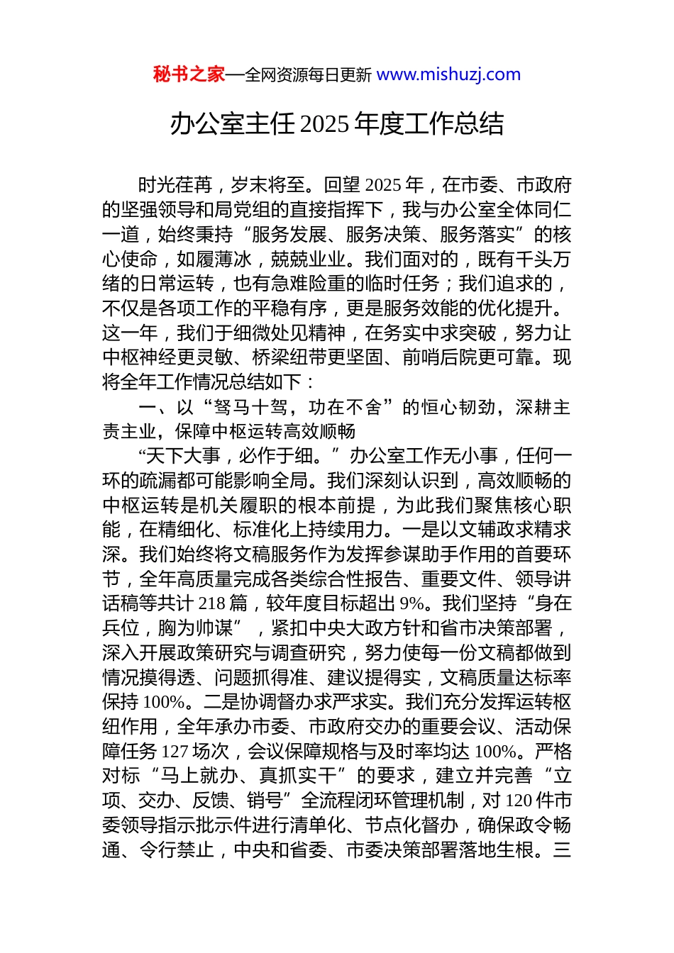 秘书之家—全网资源每日更新 www.mishuzj.com办公室主任 2025 年度工作总结时光荏苒,岁末将至。回望 2025 年,在市委、市政府的坚强领导和局党组的直接指挥下,我与办公室全体同仁一道,始终秉持“服务发展、服务决策、服务落实”的核心使命,如履薄冰,兢兢业业。我们面对的,既有千头万绪的日常运转,也有急难险重的临时任务;我们追求的,不仅是各项工作的平稳有序,更是服务效能的优化提升。这一年,我们于细微处见精神,在务实中求突破,努力让中枢神经更灵敏、桥梁纽带更坚固、前哨后院更可靠。现将全年工作情况总结如下:一、以“驽马十驾,功在不舍”的恒心韧劲,深耕主责主业,保障中枢运转高效顺畅“天下大事,必作于细。”办公室工作无小事,任何一环的疏漏都可能影响全局。我们深刻认识到,高效顺畅的中枢运转是机关履职的根本前提,为此我们聚焦核心职能,在精细化、标准化上持续用力。一是以文辅政求精求深。我们始终将文稿服务作为发挥参谋助手作用的首要环节,全年高质量完成各类综合性报告、重要文件、领导讲话稿等共计 218 篇,较年度目标超出 9%。我们坚持“身在兵位,胸为帅谋”,紧扣中央大政方针和省市决策部署,深入开展政策研究与调查研究,努力使每一份文稿都做到情况摸得透、问题抓得准、建议提得实,文稿质量达标率保持 100%。二是协调督办求严求实。我们充分发挥运转枢纽作用,全年承办市委、市政府交办的重要会议、活动保障任务 127 场次,会议保障规格与及时率均达 100%。严格对标“马上就办、真抓实干”的要求,建立并完善“立项、交办、反馈、销号”全流程闭环管理机制,对 120 件市委领导指示批示件进行清单化、节点化督办,确保政令畅通、令行禁止,中央和省委、市委决策部署落地生根。三秘书之家—全网资源每日更新 www.mishuzj.com是机要保密求稳求安。我们视安全为生命线,全年处理各类机要文件、涉密信息零差错、零泄密。通过定期开展保密警示教育、升级安防技术设备、严格执行流转程序,织密了保密安全防护网,为机关工作提供了坚实可靠的安全保障。二、以“舟至中流,奋楫者先”的革新锐气,锐意改革创新,驱动服务效能提质升级“苟日新,日日新,又日新。”面对新形势、新要求,我们深知固步自封没有出路,唯有改革创新才能赢得主动。我们坚持以信息化、规范化为抓手,着力破解效率瓶颈,推动“三服务”工作从“做没做”向“优不优”深刻转变。一是流程再造提速度。我们全面优化 OA 办公系统,将干部考勤、请销假、公文流转、事项审批等 80%的日常办公事务集成至线上办理,平均处理时效提升 40%以上。大力推行“短实新”文风,严格执行发文负面清单,全年下发至基层的文件数量同比压减 10.5%,切实为基层减负。二是数字赋能拓广度。我们积极担当政务信息公开的“前哨站”,全年通过门户网站、政务新媒体等平台主动公开信息 460 余条,及时回应社会关切。同时,我们牵头完成了机关办公用房信息数字化统计与上报工作,实现了国有资产动态化、精准化管理,为科学决策提供了数据支撑。三是预算绩效控尺度。我们牢固树立“过紧日子”思想,严格执行年度预算。2025 年,办公室牵头编制的部门整体支出预算为 1600.22 万元,通过厉行节约、优化结构,实际支出较预算压减 102.06 万元,“三公”经费支出连续三年保持下降趋势。我们强化绩效目标管理,确保每一分钱都花在刀刃上,全年预算支出标准执行率达 100%,以高效的财力保障促进了政务效能的提升。三、以“澄湖万顷,波澜不惊”的清廉定力,筑牢思想防线,淬炼忠诚干净担当队伍“出淤泥而不染,濯清涟而不妖。”清正廉洁是办公室秘书之家—全网资源每日更新 www.mishuzj.com干部的政治生命线。我们始终将全面从严治党要求贯穿工作全过程,以清廉机关建设为抓手,努力营造风清气正、干事创业的政治生态。一是制度筑廉,扎紧“铁笼子”。我们聚焦关键岗位、关键环节,全年新建与修订涵盖财务管理、公务接待、政府采购、廉政风险防控等方面的内部规章制度 28 项,形成了用制度管权、按制度办事、靠制度管人的有效机制。例如,通过细化《公务活动用餐管理细则》...