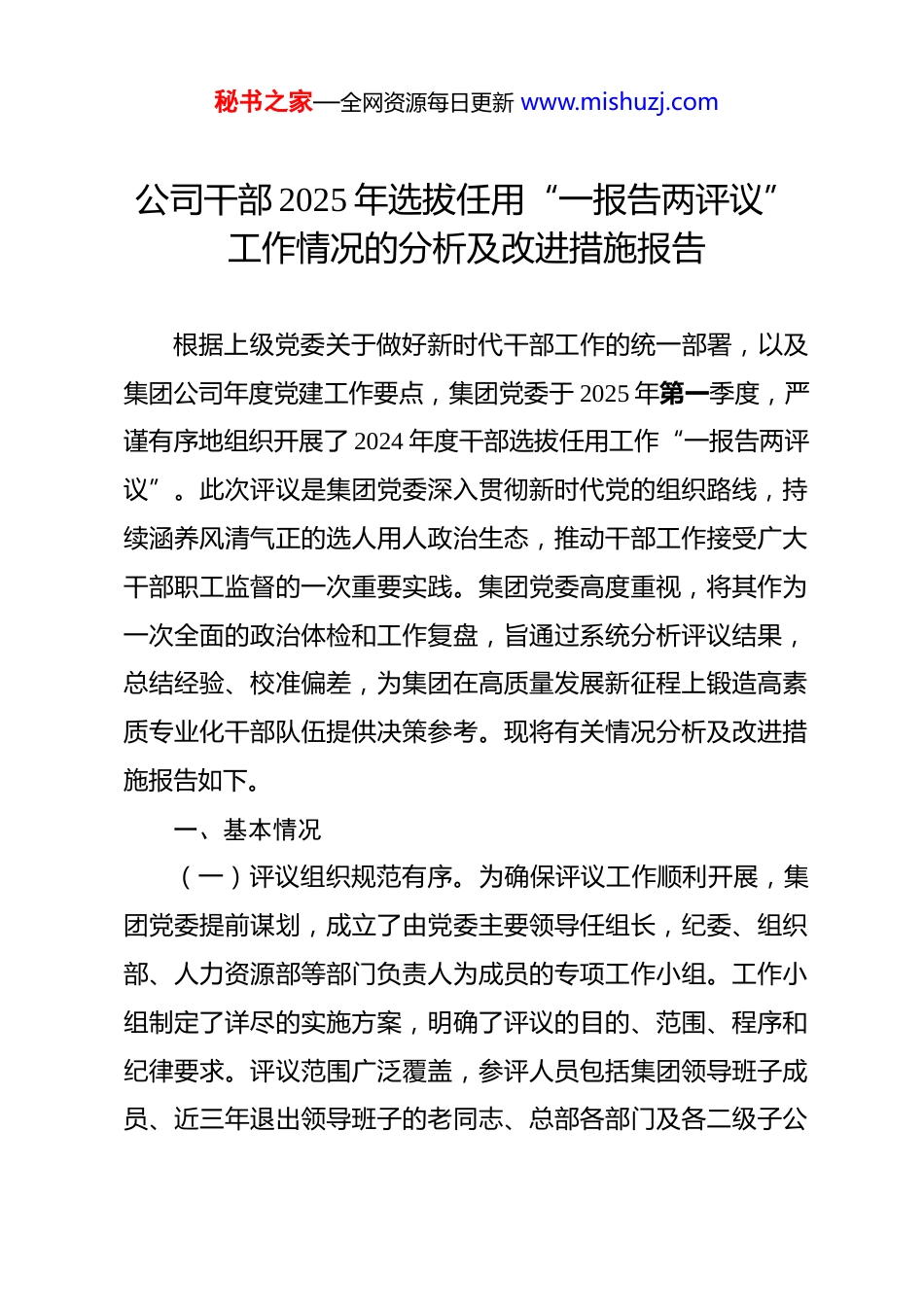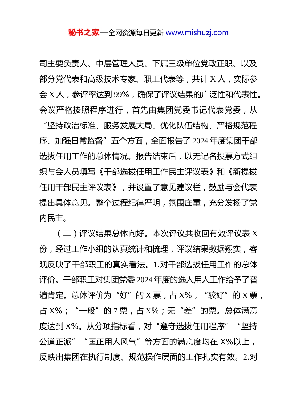 秘书之家—全网资源每日更新 www.mishuzj.com公司干部 2025 年选拔任用“一报告两评议”工作情况的分析及改进措施报告 根据上级党委关于做好新时代干部工作的统一部署,以及集团公司年度党建工作要点,集团党委于 2025 年第一季度,严谨有序地组织开展了 2024 年度干部选拔任用工作“一报告两评议”。此次评议是集团党委深入贯彻新时代党的组织路线,持续涵养风清气正的选人用人政治生态,推动干部工作接受广大干部职工监督的一次重要实践。集团党委高度重视,将其作为一次全面的政治体检和工作复盘,旨通过系统分析评议结果,总结经验、校准偏差,为集团在高质量发展新征程上锻造高素质专业化干部队伍提供决策参考。现将有关情况分析及改进措施报告如下。一、基本情况(一)评议组织规范有序。为确保评议工作顺利开展,集团党委提前谋划,成立了由党委主要领导任组长,纪委、组织部、人力资源部等部门负责人为成员的专项工作小组。工作小组制定了详尽的实施方案,明确了评议的目的、范围、程序和纪律要求。评议范围广泛覆盖,参评人员包括集团领导班子成员、近三年退出领导班子的老同志、总部各部门及各二级子公秘书之家—全网资源每日更新 www.mishuzj.com司主要负责人、中层管理人员、下属三级单位党政正职、以及部分党代表和高级技术专家、职工代表等,共计 X 人,实际参会 X 人,参评率达到 99%,确保了评议结果的广泛性和代表性。会议严格按照程序进行,首先由集团党委书记代表党委,从“坚持政治标准、服务发展大局、优化队伍结构、严格规范程序、加强日常监督”五个方面,全面报告了 2024 年度集团干部选拔任用工作的总体情况。报告结束后,以无记名投票方式组织与会人员填写《干部选拔任用工作民主评议表》和《新提拔任用干部民主评议表》,并设置了意见建议栏,鼓励与会代表提出具体意见。整个过程纪律严明,氛围庄重,充分发扬了党内民主。(二)评议结果总体向好。本次评议共收回有效评议表 X份,经过工作小组的认真统计和梳理,评议结果数据翔实,客观反映了干部职工的真实看法。1.对干部选拔任用工作的总体评价。干部职工对集团党委 2024 年度的选人用人工作给予了普遍肯定。总体评价为“好”的 X 票,占 X%;“较好”的 X 票,占 X%;“一般”的 7 票,占 X%;无“差”的票。总体满意度达到 X%。从分项指标看,对“遵守选拔任用程序”“坚持公道正派”“匡正用人风气”等方面的满意度均在 X%以上,反映出集团在执行制度、规范操作层面的工作扎实有效。2.对秘书之家—全网资源每日更新 www.mishuzj.com新提拔干部的民主评议。2024 年度,集团共提拔任用各级管理干部 X 名。民主评议结果显示,这 X 名干部获得“称职”及以上等次的平均得票率为 X%,其中,“优秀”等次平均得票率为 X%。从评议细项分析,新提拔干部在“政治素质”“廉洁自律”“品德修养”等“德”的方面评价最高;在“履职能力”“工作实绩”等“能”“绩”方面也获得了较高认可。这表明,新提拔干部的主流是好的,能够胜任本职工作,得到了干部职工的基本信任。二、取得的主要成效一年来,集团党委始终坚持党管干部原则,将干部工作融入公司治理和改革发展全过程,取得了一系列积极成效。(一)突出政治引领,选人用人“风向标”作用彰明。集团党委始终将政治标准作为选拔干部的第一标准,在动议、考察等环节,突出对干部政治忠诚、政治定力、政治担当的考察。例如,在选拔风险管控部门负责人时,优先考虑在重大风险事件和关键时刻表现出强烈政治担当和斗争精神的干部。全年所有提拔或进一步使用的干部,均通过了纪检监察部门的廉洁审查和专项政治鉴定,确保了干部队伍的绝对可靠。(二)聚焦战略布局,干部配备“指挥棒”功能凸显。紧密围绕集团向新能源、新材料、数字经济等领域转型的战略目秘书之家—全网资源每日更新 www.mishuzj.com标,坚持“事业发展需要什么人,就配什么人”。2024 年,为推动数字化转型项目,打破论资排辈,选拔了年仅 38 岁的技术专家王某担任项目公司总经理;为开拓海外新能源市场,选派了具有丰富国际业务经验和跨文化沟通...