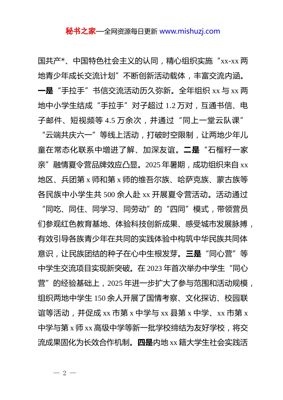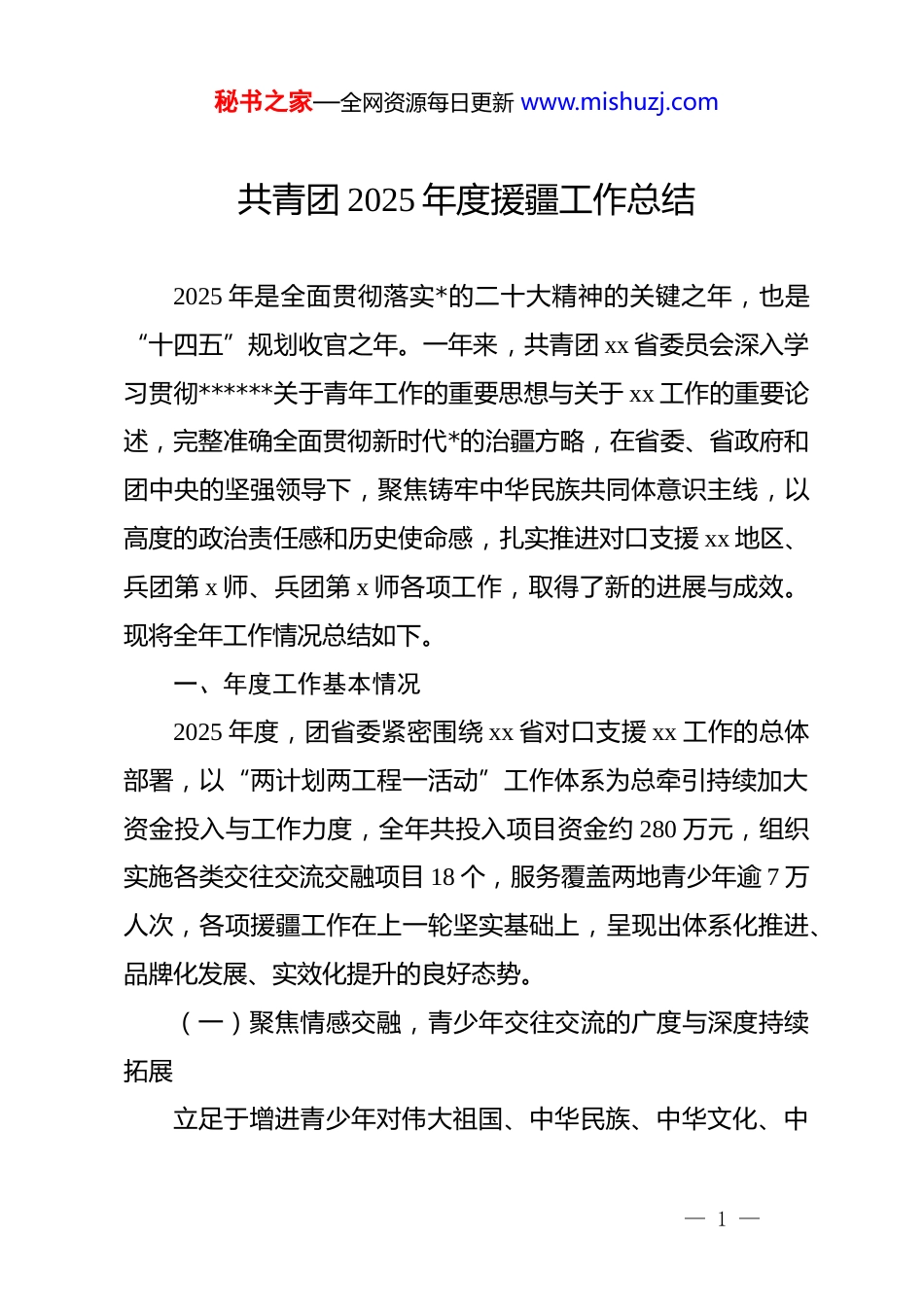 秘书之家—全网资源每日更新 www.mishuzj.com共青团 2025 年度援疆工作总结2025 年是全面贯彻落实*的二十大精神的关键之年,也是“十四五”规划收官之年。一年来,共青团 xx 省委员会深入学习贯彻******关于青年工作的重要思想与关于 xx 工作的重要论述,完整准确全面贯彻新时代*的治疆方略,在省委、省政府和团中央的坚强领导下,聚焦铸牢中华民族共同体意识主线,以高度的政治责任感和历史使命感,扎实推进对口支援 xx 地区、兵团第 x 师、兵团第 x 师各项工作,取得了新的进展与成效。现将全年工作情况总结如下。一、年度工作基本情况2025 年度,团省委紧密围绕 xx 省对口支援 xx 工作的总体部署,以“两计划两工程一活动”工作体系为总牵引持续加大资金投入与工作力度,全年共投入项目资金约 280 万元,组织实施各类交往交流交融项目 18 个,服务覆盖两地青少年逾 7 万人次,各项援疆工作在上一轮坚实基础上,呈现出体系化推进、品牌化发展、实效化提升的良好态势。(一)聚焦情感交融,青少年交往交流的广度与深度持续拓展立足于增进青少年对伟大祖国、中华民族、中华文化、中— 1 —秘书之家—全网资源每日更新 www.mishuzj.com国共产*、中国特色社会主义的认同,精心组织实施“xx-xx 两地青少年成长交流计划”不断创新活动载体,丰富交流内涵。一是“手拉手”书信交流活动历久弥新。全年组织 xx 与 xx 两地中小学生结成“手拉手”对子超过 1.2 万对,互通书信、电子邮件、短视频等 4.5 万余次,并通过“同上一堂云队课”“云端共庆六一”等线上活动,打破时空限制,让两地少年儿童在常态化联系中增进了解、加深友谊。二是“石榴籽一家亲”融情夏令营品牌效应凸显。2025 年暑期,成功组织来自 xx地区、兵团第 x 师和第 x 师的维吾尔族、哈萨克族、蒙古族等各民族中小学生共 500 余人赴 xx 开展夏令营活动。活动通过“同吃、同住、同学习、同劳动”的“四同”模式,带领营员们参观红色教育基地、体验科技创新成果、感受城市发展脉搏,有效引导各族青少年在共同的实践体验中构筑中华民族共同体意识,让民族团结的种子在心中生根发芽。三是“同心营”等中学生交流项目实现新突破。在 2023 年首次举办中学生“同心营”的经验基础上,2025 年进一步扩大了参与范围和活动规模,组织两地中学生 150 余人开展了国情考察、文化探访、校园联谊等活动,并促成 xx 市第 x 中学与 xx 县第 x 中学、xx 市第 x中学与第 x 师 xx 高级中学等新一批学校缔结为友好学校,将交流成果固化为长效合作机制。四是内地 xx 籍大学生社会实践活— 2 —秘书之家—全网资源每日更新 www.mishuzj.com动扎实开展。依托“三下乡”社会实践平台,在 xx 省内高校中组建省级重点“民族团结实践团”45 支,组织超过 500 名 xx 籍大学生深入 xx 的乡村、社区、企业开展国情调研、政策宣讲、志愿服务等活动,引导他们通过亲身观察与比较,深刻感受家乡和祖国的巨大变化,自觉成为民族团结的坚定维护者和有力践行者。(二)聚焦人才培育,服务受援地长远发展的支撑力不断增强坚持“输血”与“造血”并重,将智力支援和人才培养摆在突出位置,为 xx 经济社会高质量发展注入青春动能。一是大学生志愿服务西部计划 xx 专项深入实施。优化招募选拔机制,加强政策宣传,全年共选派 170 余名优秀高校毕业生赴 xx 地区、兵团第 x 师、第 x 师开展为期 1 至 3 年的志愿服务。这些志愿者在基层教育、医疗卫生、社会治理等岗位上挥洒汗水、贡献智慧,展现了 xx 青年的责任与担当。二是 xx 青年人才赴 xx 培训计划精准有效。将受援地团干部和青年骨干培训纳入 xx 团干部教育培训总体规划,年内分两批次组织 xx 地区、兵团第 x 师和第 x 师的基层团干部、少先队辅导员、青年致富带头人等共计80 余人赴 xx 参加专题培训。培训围绕基层团组织建设、青年创新创业、乡村振兴、新媒体应用等主题,通过理论授课、现场— 3 —秘书之家—全网资源每日更新 www.mishuzj.com教学、交流研讨等方式,切实提升了参训学...