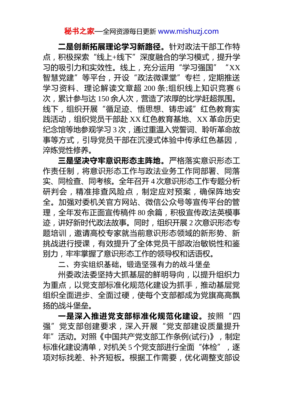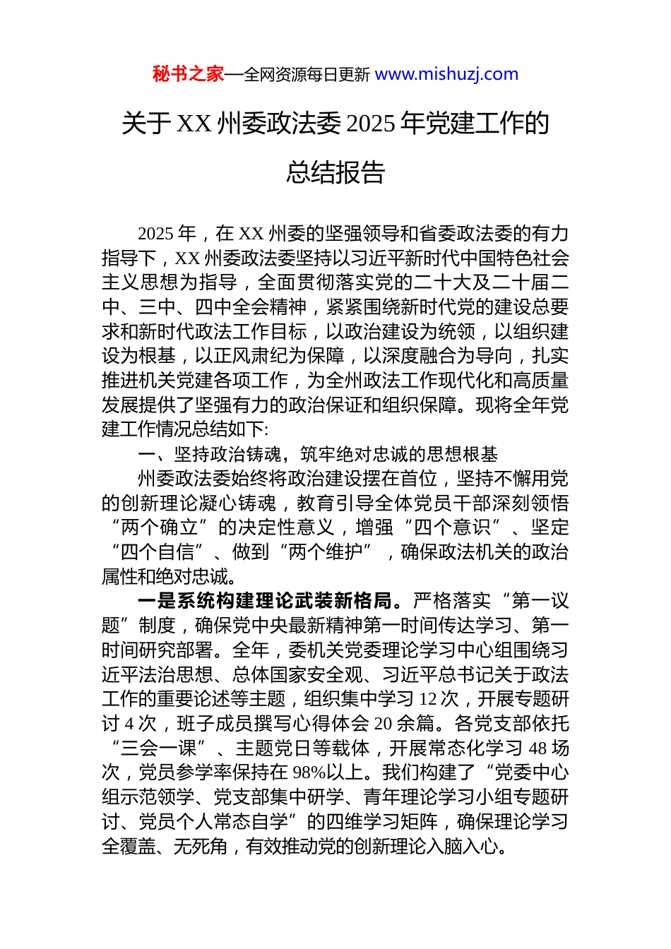 秘书之家—全网资源每日更新 www.mishuzj.com关于 XX 州委政法委 2025 年党建工作的总结报告2025 年,在 XX 州委的坚强领导和省委政法委的有力指导下,XX 州委政法委坚持以习近平新时代中国特色社会主义思想为指导,全面贯彻落实党的二十大及二十届二中、三中、四中全会精神,紧紧围绕新时代党的建设总要求和新时代政法工作目标,以政治建设为统领,以组织建设为根基,以正风肃纪为保障,以深度融合为导向,扎实推进机关党建各项工作,为全州政法工作现代化和高质量发展提供了坚强有力的政治保证和组织保障。现将全年党建工作情况总结如下:一、坚持政治铸魂,筑牢绝对忠诚的思想根基州委政法委始终将政治建设摆在首位,坚持不懈用党的创新理论凝心铸魂,教育引导全体党员干部深刻领悟“两个确立”的决定性意义,增强“四个意识”、坚定“四个自信”、做到“两个维护”,确保政法机关的政治属性和绝对忠诚。一是系统构建理论武装新格局。严格落实“第一议题”制度,确保党中央最新精神第一时间传达学习、第一时间研究部署。全年,委机关党委理论学习中心组围绕习近平法治思想、总体国家安全观、习近平总书记关于政法工作的重要论述等主题,组织集中学习 12 次,开展专题研讨 4 次,班子成员撰写心得体会 20 余篇。各党支部依托“三会一课”、主题党日等载体,开展常态化学习 48 场次,党员参学率保持在 98%以上。我们构建了“党委中心组示范领学、党支部集中研学、青年理论学习小组专题研讨、党员个人常态自学”的四维学习矩阵,确保理论学习全覆盖、无死角,有效推动党的创新理论入脑入心。秘书之家—全网资源每日更新 www.mishuzj.com二是创新拓展理论学习新路径。针对政法干部工作特点,积极探索“线上+线下”深度融合的学习模式,提升学习的吸引力和实效性。线上,充分运用“学习强国”“XX智慧党建”等平台,开设“政法微课堂”专栏,定期推送学习资料、理论解读文章超 200 条;组织线上知识竞赛 6次,累计参与达 150 余人次,营造了浓厚的比学赶超氛围。线下,组织开展“循足迹、悟思想、铸忠诚”红色教育实践活动,组织党员干部赴 XX 红色教育基地、XX 革命历史纪念馆等地参观学习 3 次,通过重温入党誓词、聆听革命故事等方式,引导党员干部在沉浸式体验中传承红色基因,淬炼党性修养。三是坚决守牢意识形态主阵地。严格落实意识形态工作责任制,将意识形态工作与政法业务工作同部署、同落实、同检查、同考核。全年召开 4 次意识形态工作专题分析研判会,精准排查风险点,制定应对预案,确保阵地安全。加强对委机关官方网站、微信公众号等宣传平台的管理,全年发布正面宣传稿件 80 余篇,积极宣传政法英模事迹,讲好新时代政法故事。同时,组织开展 2 次意识形态专题培训,邀请高校专家就当前意识形态领域的新形势、新挑战进行授课,有效提升了全体党员干部政治敏锐性和鉴别力,牢牢掌握了意识形态工作的领导权和话语权。二、夯实组织基础,锻造坚强有力的战斗堡垒州委政法委坚持大抓基层的鲜明导向,以提升组织力为重点,以党支部标准化规范化建设为抓手,推动基层党组织全面进步、全面过硬,使每个支部都成为党旗高高飘扬的战斗堡垒。一是深入推进党支部标准化规范化建设。按照“四强”党支部创建要求,深入开展“党支部建设质量提升年”活动。对照《中国共产党支部工作条例(试行)》,制定标准化建设清单,对机关 5 个党支部进行全面“体检”,逐项对标找差、补齐短板。根据工作需要,优化调整支部设秘书之家—全网资源每日更新 www.mishuzj.com置,将退休党员干部单独成立 1 个党支部,并新建 2 个功能性党支部,确保党组织有效覆盖。同时,加大对党务干部的培养力度,举办党支部书记、党务工作者专题培训班 3期,培训 80 余人次,有效提升了党务工作队伍的专业素养和履职能力。截至 2025 年底,机关 85%的党支部达到标准化建设示范标准,其中 2 个党支部被州直机关工委评为“先进基层党组织”。二是严肃规范党内政治生活。严格执行《关于新形势下党内政治生活的若干准则》,高质量落实“三会一课”、组织生活会、民主...