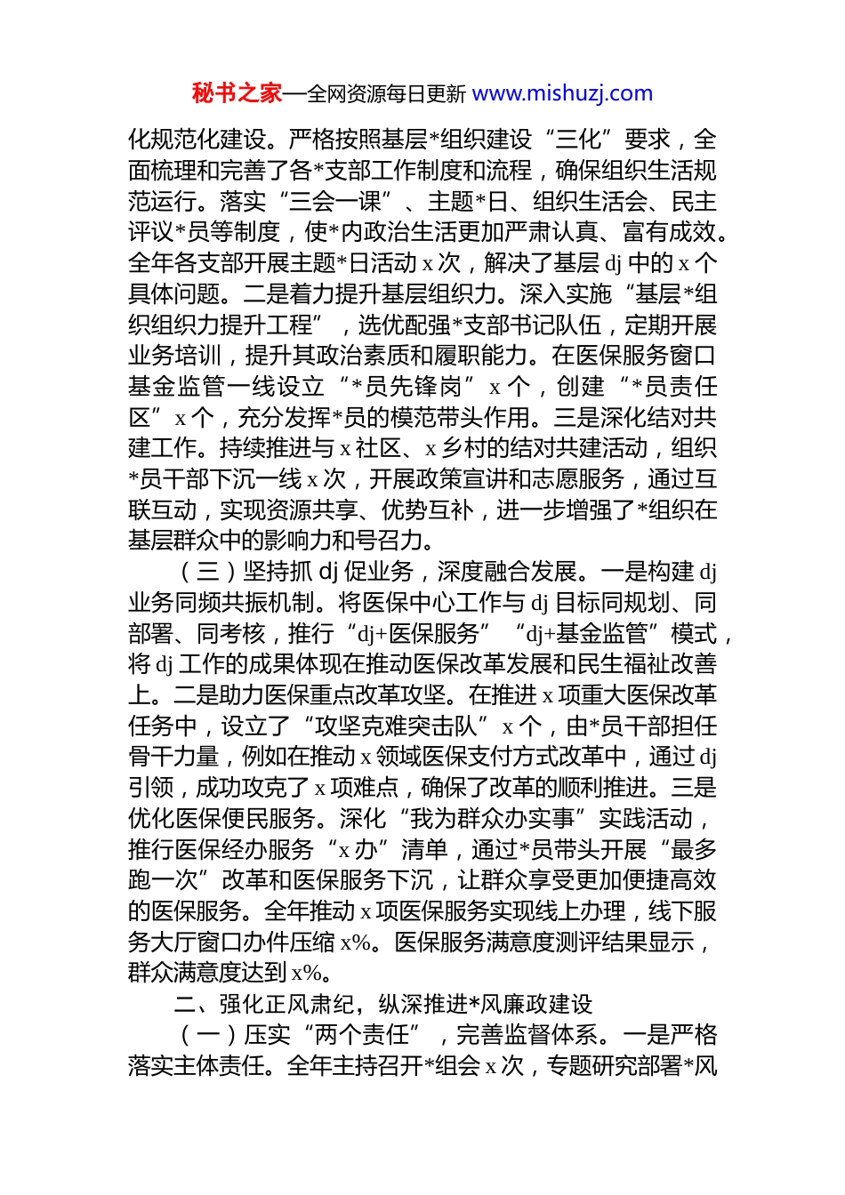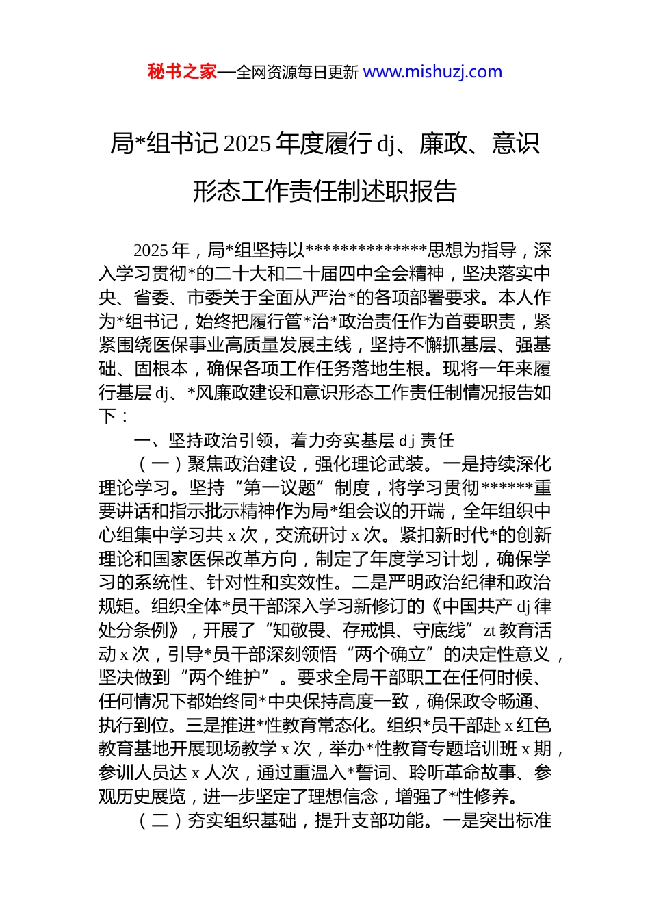 秘书之家—全网资源每日更新 www.mishuzj.com局*组书记 2025 年度履行 dj、廉政、意识形态工作责任制述职报告2025 年,局*组坚持以**************思想为指导,深入学习贯彻*的二十大和二十届四中全会精神,坚决落实中央、省委、市委关于全面从严治*的各项部署要求。本人作为*组书记,始终把履行管*治*政治责任作为首要职责,紧紧围绕医保事业高质量发展主线,坚持不懈抓基层、强基础、固根本,确保各项工作任务落地生根。现将一年来履行基层 dj、*风廉政建设和意识形态工作责任制情况报告如下:一、坚持政治引领,着力夯实基层 dj 责任(一)聚焦政治建设,强化理论武装。一是持续深化理论学习。坚持“第一议题”制度,将学习贯彻******重要讲话和指示批示精神作为局*组会议的开端,全年组织中心组集中学习共 x 次,交流研讨 x 次。紧扣新时代*的创新理论和国家医保改革方向,制定了年度学习计划,确保学习的系统性、针对性和实效性。二是严明政治纪律和政治规矩。组织全体*员干部深入学习新修订的《中国共产 dj 律处分条例》,开展了“知敬畏、存戒惧、守底线”zt 教育活动 x 次,引导*员干部深刻领悟“两个确立”的决定性意义,坚决做到“两个维护”。要求全局干部职工在任何时候、任何情况下都始终同*中央保持高度一致,确保政令畅通、执行到位。三是推进*性教育常态化。组织*员干部赴 x 红色教育基地开展现场教学 x 次,举办*性教育专题培训班 x 期,参训人员达 x 人次,通过重温入*誓词、聆听革命故事、参观历史展览,进一步坚定了理想信念,增强了*性修养。(二)夯实组织基础,提升支部功能。一是突出标准秘书之家—全网资源每日更新 www.mishuzj.com化规范化建设。严格按照基层*组织建设“三化”要求,全面梳理和完善了各*支部工作制度和流程,确保组织生活规范运行。落实“三会一课”、主题*日、组织生活会、民主评议*员等制度,使*内政治生活更加严肃认真、富有成效。全年各支部开展主题*日活动 x 次,解决了基层 dj 中的 x 个具体问题。二是着力提升基层组织力。深入实施“基层*组织组织力提升工程”,选优配强*支部书记队伍,定期开展业务培训,提升其政治素质和履职能力。在医保服务窗口基金监管一线设立“*员先锋岗”x 个,创建“*员责任区”x 个,充分发挥*员的模范带头作用。三是深化结对共建工作。持续推进与 x 社区、x 乡村的结对共建活动,组织*员干部下沉一线 x 次,开展政策宣讲和志愿服务,通过互联互动,实现资源共享、优势互补,进一步增强了*组织在基层群众中的影响力和号召力。(三)坚持抓 dj 促业务,深度融合发展。一是构建 dj业务同频共振机制。将医保中心工作与 dj 目标同规划、同部署、同考核,推行“dj+医保服务”“dj+基金监管”模式,将 dj 工作的成果体现在推动医保改革发展和民生福祉改善上。二是助力医保重点改革攻坚。在推进 x 项重大医保改革任务中,设立了“攻坚克难突击队”x 个,由*员干部担任骨干力量,例如在推动 x 领域医保支付方式改革中,通过 dj引领,成功攻克了 x 项难点,确保了改革的顺利推进。三是优化医保便民服务。深化“我为群众办实事”实践活动,推行医保经办服务“x 办”清单,通过*员带头开展“最多跑一次”改革和医保服务下沉,让群众享受更加便捷高效的医保服务。全年推动 x 项医保服务实现线上办理,线下服务大厅窗口办件压缩 x%。医保服务满意度测评结果显示,群众满意度达到 x%。二、强化正风肃纪,纵深推进*风廉政建设(一)压实“两个责任”,完善监督体系。一是严格落实主体责任。全年主持召开*组会 x 次,专题研究部署*风秘书之家—全网资源每日更新 www.mishuzj.com廉政建设和反腐败工作。与班子成员、各科室负责人签订《*风廉政建设责任书》x 份,做到压力层层传导,责任级级落实。定期听取班子成员和重点岗位干部述职述廉报告 x次,对履责不到位的及时进行约谈提醒。二是深化“四责协同”机制。推动*组主体责任、纪检监督责任、部门监管责任、个人岗位责任贯通联动,形成了齐抓共管的强大合力。充分发挥派驻纪检监察组“探头”作用,支...