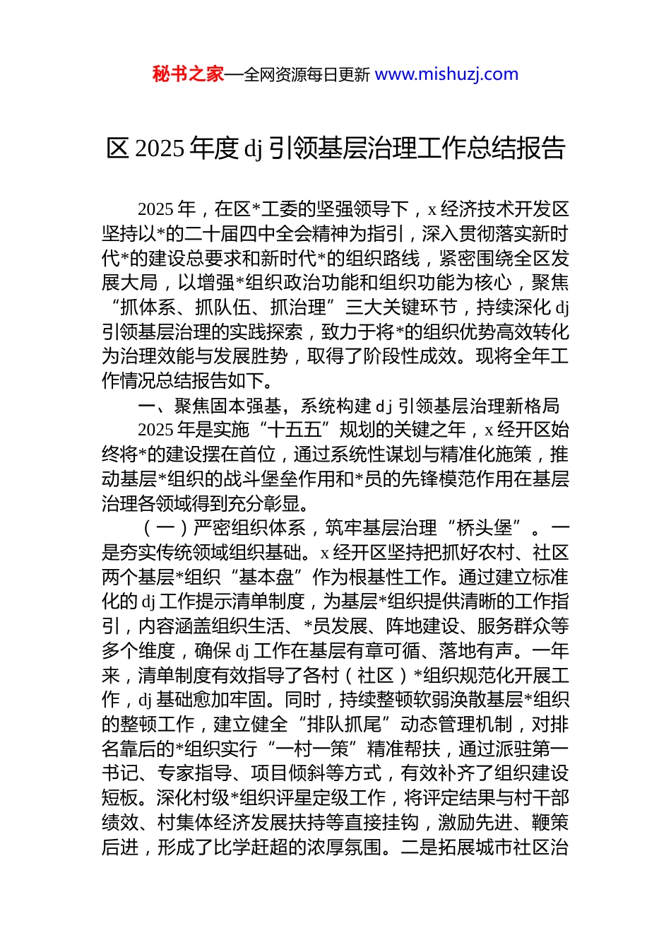 秘书之家—全网资源每日更新 www.mishuzj.com区 2025 年度 dj 引领基层治理工作总结报告2025 年,在区*工委的坚强领导下,x 经济技术开发区坚持以*的二十届四中全会精神为指引,深入贯彻落实新时代*的建设总要求和新时代*的组织路线,紧密围绕全区发展大局,以增强*组织政治功能和组织功能为核心,聚焦“抓体系、抓队伍、抓治理”三大关键环节,持续深化 dj引领基层治理的实践探索,致力于将*的组织优势高效转化为治理效能与发展胜势,取得了阶段性成效。现将全年工作情况总结报告如下。一、聚焦固本强基,系统构建 dj 引领基层治理新格局2025 年是实施“十五五”规划的关键之年,x 经开区始终将*的建设摆在首位,通过系统性谋划与精准化施策,推动基层*组织的战斗堡垒作用和*员的先锋模范作用在基层治理各领域得到充分彰显。(一)严密组织体系,筑牢基层治理“桥头堡”。一是夯实传统领域组织基础。x 经开区坚持把抓好农村、社区两个基层*组织“基本盘”作为根基性工作。通过建立标准化的 dj 工作提示清单制度,为基层*组织提供清晰的工作指引,内容涵盖组织生活、*员发展、阵地建设、服务群众等多个维度,确保 dj 工作在基层有章可循、落地有声。一年来,清单制度有效指导了各村(社区)*组织规范化开展工作,dj 基础愈加牢固。同时,持续整顿软弱涣散基层*组织的整顿工作,建立健全“排队抓尾”动态管理机制,对排名靠后的*组织实行“一村一策”精准帮扶,通过派驻第一书记、专家指导、项目倾斜等方式,有效补齐了组织建设短板。深化村级*组织评星定级工作,将评定结果与村干部绩效、村集体经济发展扶持等直接挂钩,激励先进、鞭策后进,形成了比学赶超的浓厚氛围。二是拓展城市社区治秘书之家—全网资源每日更新 www.mishuzj.com理网络。面对城市化进程加快的新形势,x 经开区积极创新城市社区 dj 模式。依托“五微五心”行动,在城市社区深度布局 dj 观察点,作为探索治理新模式的“试验田”。通过示范点的成功经验,带动全区深化居民小区和网格单元的*组织覆盖,将*的小组建在楼栋上、支部建在小区里,实现了组织设置的有效下沉和延伸。截至 2025 年 11 月底,全区居民小区*组织覆盖率达到 95%以上,*的组织体系犹如毛细血管般深入城市肌理,为精准服务居民、快速化解矛盾奠定了坚实的组织基础。三是强化新兴领域 dj 覆盖。为应对新经济业态带来的挑战,x 经开区将加强新兴领域“两个覆盖”作为年度重点任务。针对物流园区、电商产业园、外卖平台等新业态集聚区,通过单独组建、联合组建等方式,成功推动成立了一批新兴领域*组织。同时,创新实施 dj 指导员、助企纾困员、人才服务专员“多员合一”制度,选派优秀*员干部深入企业,既宣传*的政策,又帮助解决经营难题和人才需求,有效提升了*在新兴领域的号召力、凝聚力和影响力,实现了 dj 工作与经济发展的同频共振。(二)深化队伍建设,锻造基层治理“主力军”。人才是基层治理最核心的资源。x 经开区坚持把建设一支政治过硬、本领高强、作风优良的基层干部队伍作为关键抓手一是创新干部培训模式。为破解基层干部能力不足的难题x 经开区打破传统单一的课堂教学模式,充分整合区内各类优质资源。将乡村振兴研学基地、现代农业产业示范基地“共同缔造”试点村等 10 余处特色现场教学点“串珠成链”,精心打造了数条精品现场教学路线。通过举办“头雁讲堂”,组织村(社区)*组织书记、后备干部等开展“浸润式”教学,全年累计培训基层干部超过 500 人次。学员们在田间地头学经验,在治理一线找差距,在产业园区看发展,有效提升了运用新发展理念解决实际问题的能力二是优化后备力量储备。着眼于下一届村(社区)“两秘书之家—全网资源每日更新 www.mishuzj.com委”换届的需要,x 经开区提前谋划,系统整合镇、村两级班子和公益性岗位资源,有计划地安排政治素质好、群众基础牢、有发展潜力的储备人选到信访维稳、项目建设、环境整治等关键岗位进行实践锻炼,让其在“风口浪尖”上经风雨、见世面、长才干。同时,抓住春节、国庆等重要时间节点,利用外出务工*员、大学毕业生...