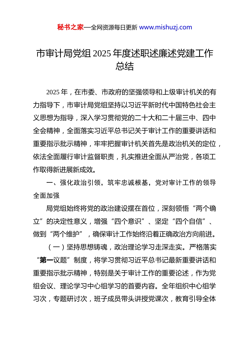 秘书之家—全网资源每日更新 www.mishuzj.com市审计局党组 2025 年度述职述廉述党建工作总结 2025 年,在市委、市政府的坚强领导和上级审计机关的有力指导下,市审计局党组坚持以习近平新时代中国特色社会主义思想为指导,深入学习贯彻党的二十大和二十届三中、四中全会精神,全面落实习近平总书记关于审计工作的重要讲话和重要指示批示精神,牢牢把握审计机关首先是政治机关的定位,依法全面履行审计监督职责,扎实推进全面从严治党,各项工作取得新进展新成效。一、强化政治引领,筑牢忠诚根基,党对审计工作的领导全面加强局党组始终将党的政治建设摆在首位,深刻领悟“两个确立”的决定性意义,增强“四个意识”、坚定“四个自信”、做到“两个维护”,确保审计工作始终沿着正确政治方向前进。(一)坚持思想铸魂,政治理论学习走深走实。严格落实“第一议题”制度,将学习贯彻习近平总书记最新重要讲话和重要指示批示精神,特别是关于审计工作的重要论述,作为党组会议、理论学习中心组学习的首要内容。全年组织中心组学习次,专题研讨次,班子成员带头讲授党课次,教育引导全体秘书之家—全网资源每日更新 www.mishuzj.com审计干部不断提高政治判断力、政治领悟力、政治执行力,自觉在思想上政治上行动上同以习近平同志为核心的党中央保持高度一致,确保党中央决策部署和省委、市委工作要求在全市审计系统不折不扣落到实处。(二)健全领导机制,审计工作格局持续优化。坚决贯彻落实市委审计委员会各项决策部署,严格执行重大事项请示报告制度,全年向市委审计委员会报送审计专报、要情份,获市委市政府主要领导批示件,推动将党领导审计工作的制度优势转化为治理效能。加强对区委审计委员会办公室工作的指导,开展专项检查,推动全市审计工作“一盘棋”格局更加巩固。(三)聚焦“国之大者”,政治监督属性更加鲜明。自觉将审计工作置于全市发展大局中谋划推进,紧紧围绕党中央重大决策部署和市委、市政府中心工作确定审计重点。全力配合完成上级审计机关交办的重大审计任务,抽调精干力量参与市委市政府重点工作协调。坚持把推动党中央重大政策措施贯彻落实作为审计监督的重中之重,确保政令畅通、令行禁止。二、依法忠诚履职,服务发展大局,审计监督效能显著提升紧紧围绕高质量发展这一首要任务,立足经济监督定位,聚焦财政财务收支真实合法效益主责主业,依法全面履行审计秘书之家—全网资源每日更新 www.mishuzj.com监督职责。全年全市审计机关共完成审计(调查)项目 210 个,促进增收节支、挽回损失亿元,推动建立健全规章制度 409 项,移送处理事项 148 件。(一)聚焦宏观政策落实,促进经济持续向好。加强对重大战略、重大举措、重大项目的审计监督。围绕深化重点领域改革,开展了政策落实、政府数据资源资产化等审计调查,推动改革任务落地。围绕促进财政政策加力提效,组织实施了市本级财政预算执行、决算草案审计,对公检法司系统部门预算执行、涉企财政扶持资金、重点资助事业单位运营等开展专项审计,促进财政资金提质增效,营商环境持续优化。*区审计局首次实现对辖区街道社区工作站经费审计全覆盖。(二)聚焦风险防范化解,助力经济行稳致远。紧盯经济社会运行中的风险隐患,发挥审计“探头”作用。开展市本级国有资本经营预算、市属国企境外投资运营等审计,推动完善国资监管,促进国有资本保值增值。对重点国有企业资产负债损益情况进行审计,揭示风险隐患。推动第一批家特定类型企业纳入国资预算编报体系,织密风险防护网。(三)聚焦生态文明建设,推动绿色低碳发展。践行“绿水青山就是金山银山”理念,开展国有土地使用权出让收支、土地资源管理、湿地及红树林保护等资源环境审计,揭示生态秘书之家—全网资源每日更新 www.mishuzj.com保护领域存在的问题,督促相关部门落实主体责任,严守生态保护红线,促进美丽建设。(四)聚焦保障改善民生,维护人民群众利益。坚持以人民为中心的发展思想,加大对民生资金和项目的审计力度。组织开展公立医院、保障性安居工程、城中村改造、民办义务教育、乡村振兴等领域审计,严肃查处侵害群众...