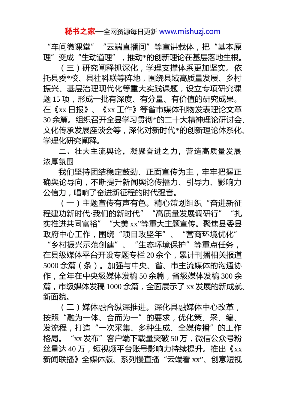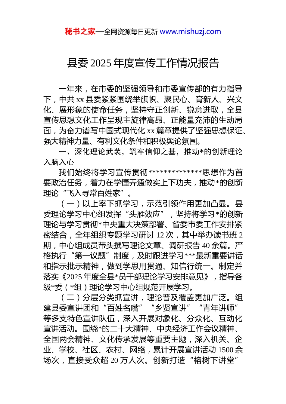 秘书之家—全网资源每日更新 www.mishuzj.com县委 2025 年度宣传工作情况报告一年来,在市委的坚强领导和市委宣传部的有力指导下,中共 xx 县委紧紧围绕举旗帜、聚民心、育新人、兴文化、展形象的使命任务,坚持守正创新、锐意进取,全县宣传思想文化工作呈现主旋律高昂、正能量充沛的生动局面,为奋力谱写中国式现代化 xx 篇章提供了坚强思想保证、强大精神力量、有利文化条件和积极舆论氛围。一、深化理论武装,筑牢信仰之基,推动*的创新理论入脑入心我们始终将学习宣传贯彻**************思想作为首要政治任务,着力在学懂弄通做实上下功夫,推动*的创新理论“飞入寻常百姓家”。(一)以上率下抓学习,示范引领作用更加凸显。县委理论学习中心组发挥“头雁效应”,坚持将学习*的创新理论与学习贯彻*中央重大决策部署、省委市委工作安排紧密结合,全年组织专题学习研讨 12 次,其中举办读书班 2期,中心组成员带头撰写理论文章、调研报告 40 余篇。严格执行“第一议题”制度,及时跟进学习***最新重要讲话和指示批示精神,做到学思用贯通、知信行统一。制定并落实《2025 年度全县*员干部理论学习安排意见》,指导各级*委(*组)理论学习中心组规范开展学习。(二)分层分类抓宣讲,理论普及覆盖更加广泛。组建县委宣讲团和“百姓名嘴”“乡贤宣讲”“青年讲师”等多支特色宣讲队伍,深入开展对象化、分众化、互动化宣讲活动。围绕*的二十大精神、中央经济工作会议精神、全国两会精神、文化传承发展等重要主题,深入机关、企业、学校、社区、农村、网络,累计开展宣讲活动 1500 余场次,直接受众超 20 万人次。创新打造“榕树下讲堂”秘书之家—全网资源每日更新 www.mishuzj.com“车间微课堂”“云端直播间”等宣讲载体,把“基本原理”变成“生动道理”,推动*的创新理论在基层落地生根。(三)研究阐释抓深化,学理支撑体系更加坚实。依托县委*校、县社科联等阵地,围绕县域高质量发展、乡村振兴、基层治理现代化等重大实践课题,设立专项研究课题 15 项,形成一批有深度、有分量、有价值的研究成果。在《xx 日报》、《xx 工作》等省市媒体刊物发表理论文章30 余篇。组织召开全县学习贯彻*的二十大精神理论研讨会、文化传承发展座谈会等,深化对新时代*的创新理论体系化、学理化研究阐释。二、壮大主流舆论,凝聚奋进之力,营造高质量发展浓厚氛围我们坚持团结稳定鼓劲、正面宣传为主,牢牢把握正确舆论导向,不断提升新闻舆论传播力、引导力、影响力公信力,唱响了奋进新征程的时代强音。(一)主题宣传有声有色。精心策划组织“奋进新征程建功新时代·我们的新时代”“高质量发展调研行”“扎实推进共同富裕”“大美 xx”等重大主题宣传。聚焦县委县政府中心工作,围绕“项目攻坚年”、“营商环境优化”“乡村振兴示范创建”、“生态环境保护”等重点任务,在县级媒体平台开设专题专栏 20 余个,累计刊播相关报道5000 余篇(条)。加强与中央、省、市主流媒体的沟通协作,全年在中央级媒体发稿 50 余篇,省级媒体发稿 300 余篇,市级媒体发稿 1000 余篇,全面展示了 xx 发展的新成就、新面貌。(二)媒体融合纵深推进。深化县融媒体中心改革,按照“融为一体、合而为一”的要求,优化策、采、编、发流程,打造“一次采集、多种生成、全媒传播”的工作格局。“xx 发布”客户端下载量突破 50 万,微信公众号粉丝量达 40 万,短视频平台账号影响力持续提升。推出《xx新闻联播》全媒体版、系列慢直播“云端看 xx”、创意短视秘书之家—全网资源每日更新 www.mishuzj.com频“xx 二十四节气”等融媒产品,全年生产点击量“10 万+”产品超 100 个。建成覆盖全县各乡镇(街道)、部分重点村(社区)的融媒体工作站,打通基层宣传“最后一公里”。(三)舆论引导精准有效。健全完善重大舆情和突发事件应急报道及舆论引导机制,严格执行“三审三校”制度,确保内容安全、导向正确。密切关注经济社会发展热点和民生诉求,加强政策解读和权威信息发布,主动回应社会关切。全年召开新闻发布会、媒体吹风会 8 场,发布权威信息 200 余...