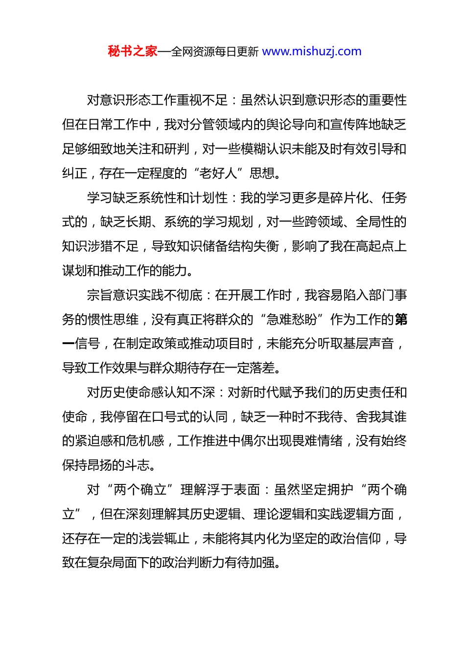 秘书之家—全网资源每日更新 www.mishuzj.com2025 年度民主生活会组织生活会自我批评意见(50 条)一、理论学习与思想认识方面理论学习深度不够:对党的创新理论,我满足于通读文件摘抄笔记,缺乏深层次的思考和内化,特别是未能将理论中的世界观和方法论系统性地转化为指导复杂工作的锐利武器,导致在理论指导实践方面存在一定滞后性。政治敏锐性有待提高:面对一些苗头性、倾向性问题,我虽然立场坚定,但在从政治高度认识和分析具体业务工作方面做得不够,对潜在的风险和意识形态领域的潜在流向,缺乏前瞻性的警觉和深入研判的能力。学用结合不紧密:在学习新理念、新政策时,我未能做到带着问题学、结合岗位思,存在“学归学、做归做”的现象,导致理论学习成果未能完全有效转化为解决实际难题、推动工作创新的具体思路和举措。党性锤炼有所松懈:随着工作年限增长,有时满足于“不掉队、过得去”的底线要求,对标先进的意识有所弱化,在党性修养的自我要求上,放松了对一些“小事小节”的警惕性,未能时刻保持一名优秀党员的先锋模范意识。秘书之家—全网资源每日更新 www.mishuzj.com对意识形态工作重视不足:虽然认识到意识形态的重要性但在日常工作中,我对分管领域内的舆论导向和宣传阵地缺乏足够细致地关注和研判,对一些模糊认识未能及时有效引导和纠正,存在一定程度的“老好人”思想。学习缺乏系统性和计划性:我的学习更多是碎片化、任务式的,缺乏长期、系统的学习规划,对一些跨领域、全局性的知识涉猎不足,导致知识储备结构失衡,影响了我在高起点上谋划和推动工作的能力。宗旨意识实践不彻底:在开展工作时,我容易陷入部门事务的惯性思维,没有真正将群众的“急难愁盼”作为工作的第一信号,在制定政策或推动项目时,未能充分听取基层声音,导致工作效果与群众期待存在一定落差。对历史使命感认知不深:对新时代赋予我们的历史责任和使命,我停留在口号式的认同,缺乏一种时不我待、舍我其谁的紧迫感和危机感,工作推进中偶尔出现畏难情绪,没有始终保持昂扬的斗志。对“两个确立”理解浮于表面:虽然坚定拥护“两个确立”,但在深刻理解其历史逻辑、理论逻辑和实践逻辑方面,还存在一定的浅尝辄止,未能将其内化为坚定的政治信仰,导致在复杂局面下的政治判断力有待加强。秘书之家—全网资源每日更新 www.mishuzj.com对重大理论的深层思考不足:在学习新思想时,我更多关注其具体论述,对其中蕴含的马克思主义立场观点方法,缺乏追根溯源的深层思考和领悟,导致在指导具体工作时缺乏思想穿透力和预见性。二、履职尽责与担当作为方面攻坚克难的锐气不足:在面对涉及多部门、利益调整的复杂棘手问题时,我有时会产生畏难情绪,求稳怕变的思想有所抬头,未能始终保持“啃硬骨头”的闯劲和斗志,导致部分改革深化工作推进力度不够坚决。创新精神和勇气欠缺:对于工作中的新情况、新要求,我习惯于照搬上级文件精神和既有经验模式,缺乏打破常规、敢为人先的创新意识,致使一些工作停留在一般化水平,未能形成具有本单位特色的创新亮点和有效经验。责任传导压力不足:作为管理人员,我在任务部署后,对下属单位和人员的执行情况,缺乏持续、细致地跟进和督导,存在“安排下去就了事”的思想,导致责任压力在末端未能有效传导和压实,影响了工作落地效果。工作效率有待提升:日常工作中,对一些流程性、事务性的工作,虽然能按时完成,但在提高效率、优化流程方面思考不多,特别是对一些信息化手段的应用不够充分,浪费了部分秘书之家—全网资源每日更新 www.mishuzj.com时间,拖慢了整体工作节奏。对业务风险预判不足:在推进重大项目和关键业务时,我更多关注于目标的实现,对潜在的法律风险、廉政风险和舆论风险的研判和防范措施不够周密,缺乏足够的底线思维和风险意识,可能留下隐患。决策有时不够果断:在需要快速做出反应和决断的关键时刻,我有时会因顾虑过多、求全责备而犹豫不决,错失了最佳的工作时机,反映出在面对不确定性时,缺乏敢于拍板、敢于担当的魄力和胆识。工作标准定位不高:我在完成工作时,多数情况下以“合格”为目标,满足于完成基...