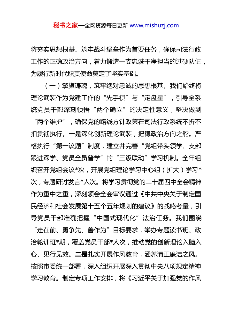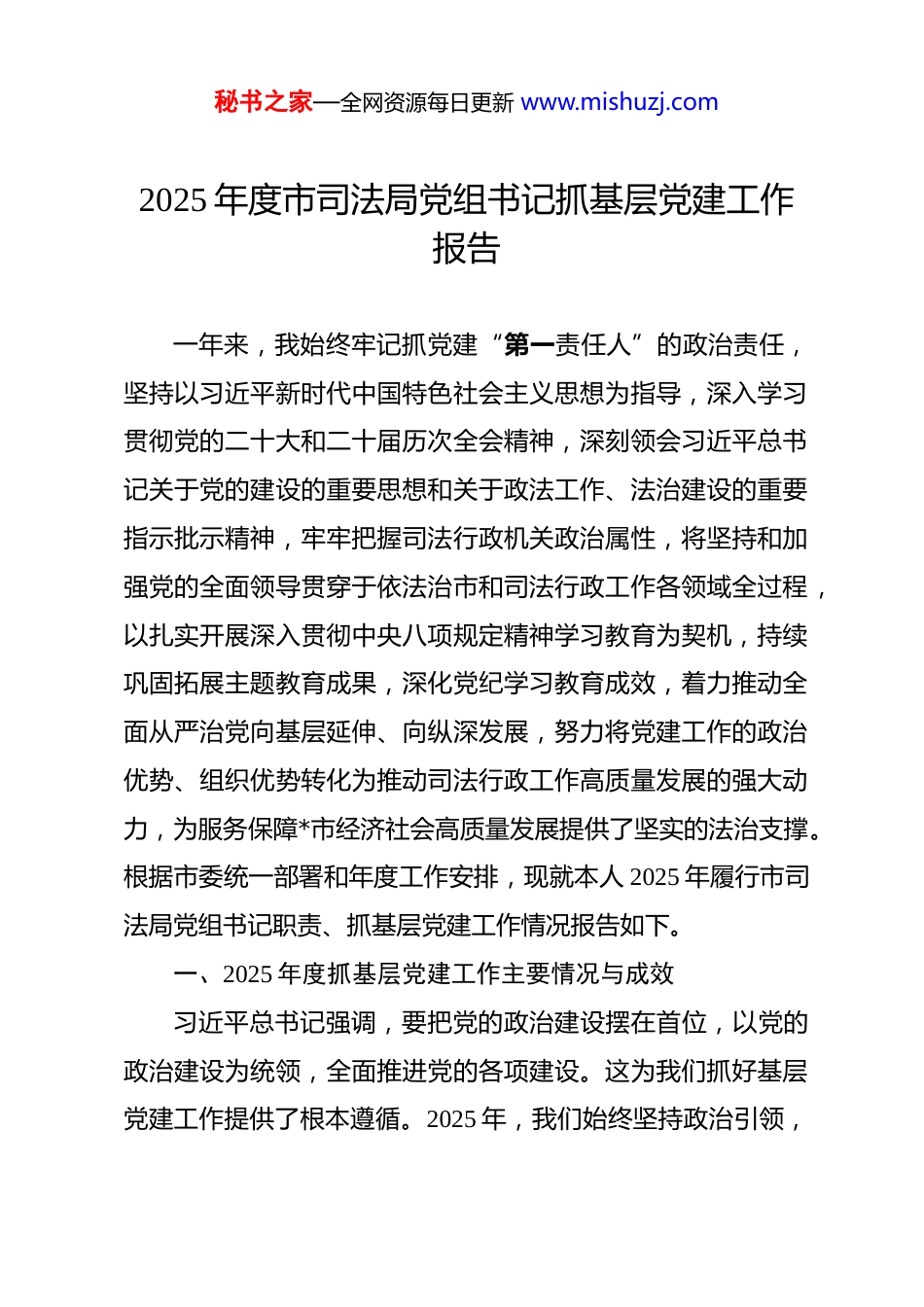 秘书之家—全网资源每日更新 www.mishuzj.com2025 年度市司法局党组书记抓基层党建工作报告 一年来,我始终牢记抓党建“第一责任人”的政治责任,坚持以习近平新时代中国特色社会主义思想为指导,深入学习贯彻党的二十大和二十届历次全会精神,深刻领会习近平总书记关于党的建设的重要思想和关于政法工作、法治建设的重要指示批示精神,牢牢把握司法行政机关政治属性,将坚持和加强党的全面领导贯穿于依法治市和司法行政工作各领域全过程,以扎实开展深入贯彻中央八项规定精神学习教育为契机,持续巩固拓展主题教育成果,深化党纪学习教育成效,着力推动全面从严治党向基层延伸、向纵深发展,努力将党建工作的政治优势、组织优势转化为推动司法行政工作高质量发展的强大动力,为服务保障*市经济社会高质量发展提供了坚实的法治支撑。根据市委统一部署和年度工作安排,现就本人 2025 年履行市司法局党组书记职责、抓基层党建工作情况报告如下。一、2025 年度抓基层党建工作主要情况与成效习近平总书记强调,要把党的政治建设摆在首位,以党的政治建设为统领,全面推进党的各项建设。这为我们抓好基层党建工作提供了根本遵循。2025 年,我们始终坚持政治引领,秘书之家—全网资源每日更新 www.mishuzj.com将夯实思想根基、筑牢战斗堡垒作为首要任务,确保司法行政工作的正确政治方向,着力锻造一支忠诚干净担当的过硬队伍,为履行新时代职责使命奠定了坚实基础。(一)擎旗铸魂,筑牢绝对忠诚的思想根基。我们始终将理论武装作为党建工作的“先手棋”与“定盘星”,引导全系统党员干部深刻领悟“两个确立”的决定性意义,坚决做到“两个维护”,确保党的路线方针政策在司法行政系统不折不扣贯彻执行。一是深化创新理论武装,把稳政治方向之舵。严格执行“第一议题”制度,建立并完善“党组带头领学、支部跟进深学、党员全员普学”的“三级联动”学习机制。全年组织召开党组会议*次,开展党组理论学习中心组(扩大)学习*次,专题研讨发言*人次。将学习贯彻党的二十届四中全会精神作为重中之重,深刻领会全会审议通过《中共中央关于制定国民经济和社会发展第十五个五年规划的建议》的战略考量,引导党员干部准确把握“中国式现代化”法治任务。我们围绕“走在前、勇争先、善作为”目标要求,举办专题读书班、政治轮训班*期,覆盖党员干部*人次,推动党的创新理论入脑入心、见行见效。二是扎实开展作风教育,涵养清正廉洁之风。按照市委统一部署,深入组织开展深入贯彻中央八项规定精神学习教育。制定专项工作安排,将《习近平关于加强党的作风秘书之家—全网资源每日更新 www.mishuzj.com建设论述摘编》等作为必学内容。组织党员领导干部专题读书班,带动基层党支部通过“三会一课”、主题党日等形式开展学习研讨**余场次。坚持学查改一体推进,局党组班子带头查摆问题*项,班子成员查摆问题*项,建立台账并完成整改。开展警示教育活动*次,节前廉政谈话*次,发布廉政提醒*次,推动作风建设常态化长效化,全系统风清气正的政治生态持续巩固。三是压紧压实意识形态责任,守牢政治安全阵地。严格落实意识形态工作责任制,全年专题研究部署意识形态工作*次。加强对局门户网站、微信公众号等阵地的管理,严格执行新闻稿件“三审”制度。密切关注司法行政领域社会舆情和思想动态,定期开展风险研判。将意识形态工作要求融入律师、公证、司法鉴定等行业管理,教育引导法律服务工作者坚持正确政治方向,确保司法行政领域意识形态安全。(二)强基扎根,锻造坚强有力的战斗堡垒。我们牢固树立大抓基层的鲜明导向,以提升组织力为重点,着力推动基层党组织全面进步、全面过硬,确保党的组织体系经脉畅通、气血旺盛,使每名党员都成为一面鲜红的旗帜,每个支部都成为党旗高高飘扬的战斗堡垒。一是健全组织体系,推进“两个覆盖”提质增效。深入推进基层党建“书记领航”行动,本人及班子成员均建立基层党支部联系点,定期开展“上门听会”等秘书之家—全网资源每日更新 www.mishuzj.com活动,加强对基层党建工作的直接指导。大力推进行业党建工作,完成对全市*家律师事务所党建工作情...