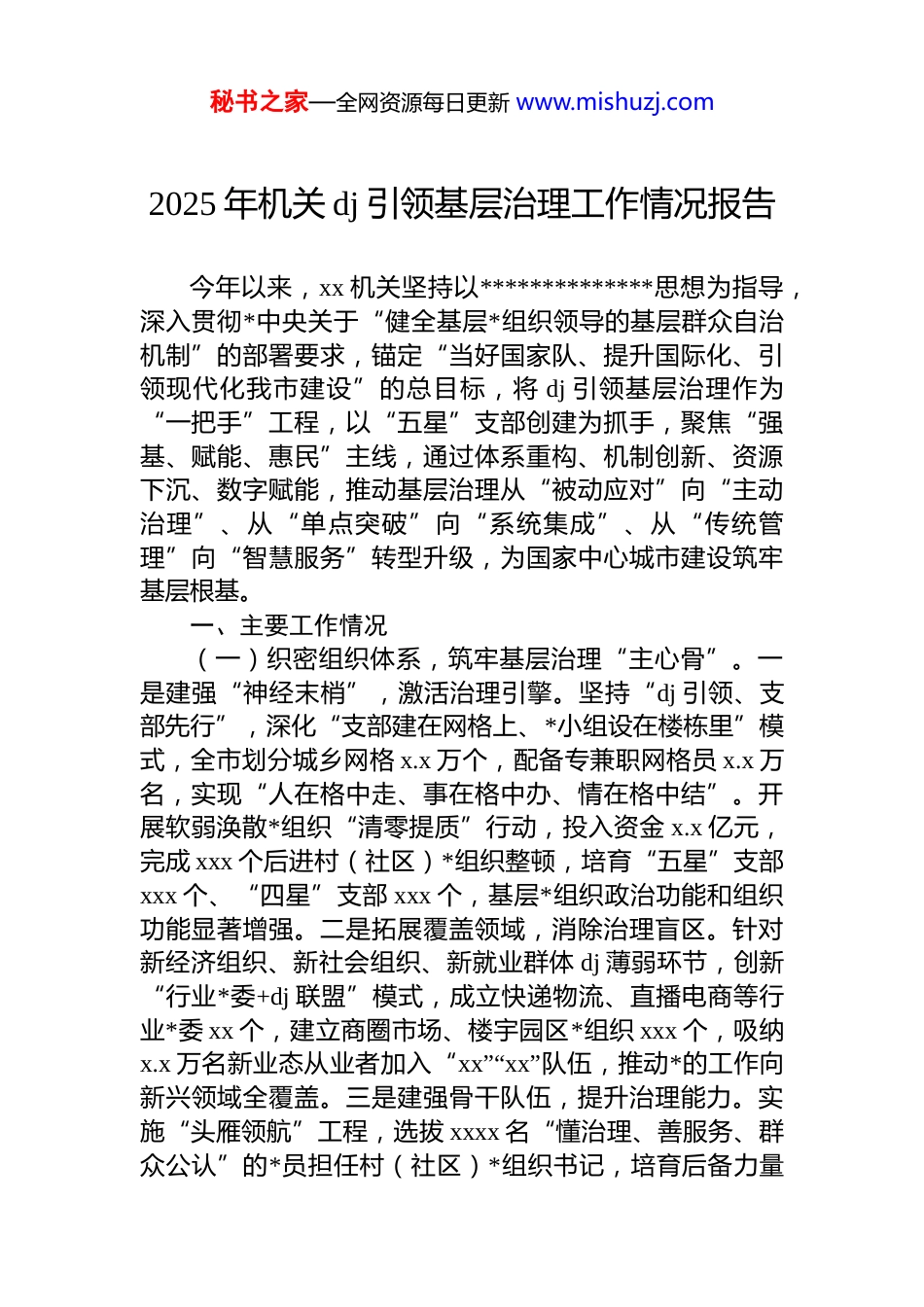 秘书之家—全网资源每日更新 www.mishuzj.com2025 年机关 dj 引领基层治理工作情况报告今年以来,xx 机关坚持以**************思想为指导,深入贯彻*中央关于“健全基层*组织领导的基层群众自治机制”的部署要求,锚定“当好国家队、提升国际化、引领现代化我市建设”的总目标,将 dj 引领基层治理作为“一把手”工程,以“五星”支部创建为抓手,聚焦“强基、赋能、惠民”主线,通过体系重构、机制创新、资源下沉、数字赋能,推动基层治理从“被动应对”向“主动治理”、从“单点突破”向“系统集成”、从“传统管理”向“智慧服务”转型升级,为国家中心城市建设筑牢基层根基。一、主要工作情况(一)织密组织体系,筑牢基层治理“主心骨”。一是建强“神经末梢”,激活治理引擎。坚持“dj 引领、支部先行”,深化“支部建在网格上、*小组设在楼栋里”模式,全市划分城乡网格 x.x 万个,配备专兼职网格员 x.x 万名,实现“人在格中走、事在格中办、情在格中结”。开展软弱涣散*组织“清零提质”行动,投入资金 x.x 亿元,完成 xxx 个后进村(社区)*组织整顿,培育“五星”支部xxx 个、“四星”支部 xxx 个,基层*组织政治功能和组织功能显著增强。二是拓展覆盖领域,消除治理盲区。针对新经济组织、新社会组织、新就业群体 dj 薄弱环节,创新“行业*委+dj 联盟”模式,成立快递物流、直播电商等行业*委 xx 个,建立商圈市场、楼宇园区*组织 xxx 个,吸纳x.x 万名新业态从业者加入“xx”“xx”队伍,推动*的工作向新兴领域全覆盖。三是建强骨干队伍,提升治理能力。实施“头雁领航”工程,选拔 xxxx 名“懂治理、善服务、群众公认”的*员担任村(社区)*组织书记,培育后备力量秘书之家—全网资源每日更新 www.mishuzj.comxxxx 余名。通过“线上云课堂+线下实训营”,培训基层干部 x.x 万人次,组织 xxx 名优秀书记赴先进地区跟班学习,基层队伍专业化水平持续提升。(二)创新治理机制,破解基层治理“老大难”。一是推行“dj+网格+n”联动机制,实现“小事不出网格、大事不出社区”。整合公安、民政、城管等 xx 个部门资源,建立“网格吹哨、部门报到、分级处置”机制,网格员通过“随手拍”“民情直通车”收集问题,由街道(乡镇)“中枢平台”分类派单,部门限时办结。今年以来,累计受理群众诉求 xx 万件,办结率 xx.x%,化解矛盾纠纷 x.x 万起,信访量同比下降 xx%。二是深化“居民议事+协商共治”模式,激发群众参与活力。推广“政好办·议事厅”“庭院*小组”等载体,在小区楼栋设立“议事角”“意见箱”,建立“居民点单、支部下单、*员接单、群众评单”服务闭环。“楼栋议事会”化解飞线充电、停车难等问题xxxx 余件;“红色物业联盟”推动 xxx 个无主管楼院实现规范化管理,群众满意度提升至 xx.x%。三是构建“数字赋能+智慧治理”体系,提升治理效能。依托“政好办”app搭建基层治理平台,集成政务服务、民生保障、应急管理等功能模块,实现“一网通办”事项 xxxx 项。经开区“智慧社区”通过人脸识别、智能监控等技术,预警高空抛物消防隐患等风险 x.x 万次;登封市“乡村大脑”整合医保、养老等数据,为老年人提供“刷脸认证”“上门代办”服务,惠及群众 xx 万人次。(三)聚焦民生福祉,彰显基层治理“温度感”。一是发展壮大集体经济,夯实共同富裕基础。实施“dj 引领集体经济提质增效行动”,推广“*支部+合作社+农户”“土地流转+规模经营”等模式,盘活闲置厂房、荒山荒坡等资源,培育特色产业项目 xxxx 余个。中牟县“*支部领办合作社”带动 x.x 万农户增收,年集体经济收入超 xx 万元的村达 xxx 个,其中超千万元村 xx 个。二是深化“dj+志愿秘书之家—全网资源每日更新 www.mishuzj.com服务”,擦亮为民服务底色。开展“万名*员进社区、我为群众办实事”活动,x.x 万名机关企事业单位*员到社区报到,组建“xx”“xx”等志愿服务队 xxxx 余支,开展助老扶弱、环境整治等活动 x.x 万场次,服务群众超百万人次。三是推进“dj+乡风文明”,涵养基层治理软实力。修订村规民约,设立“...