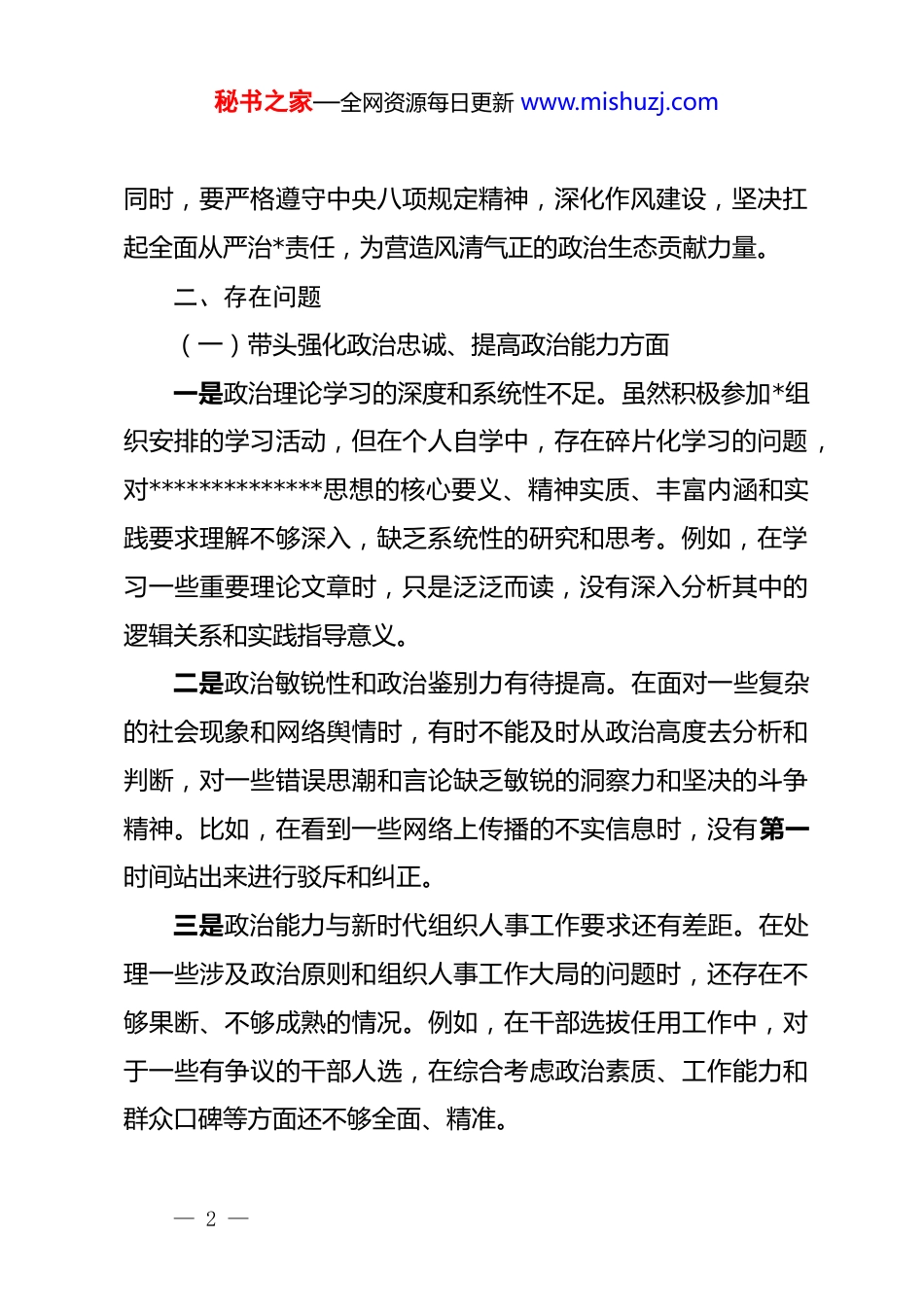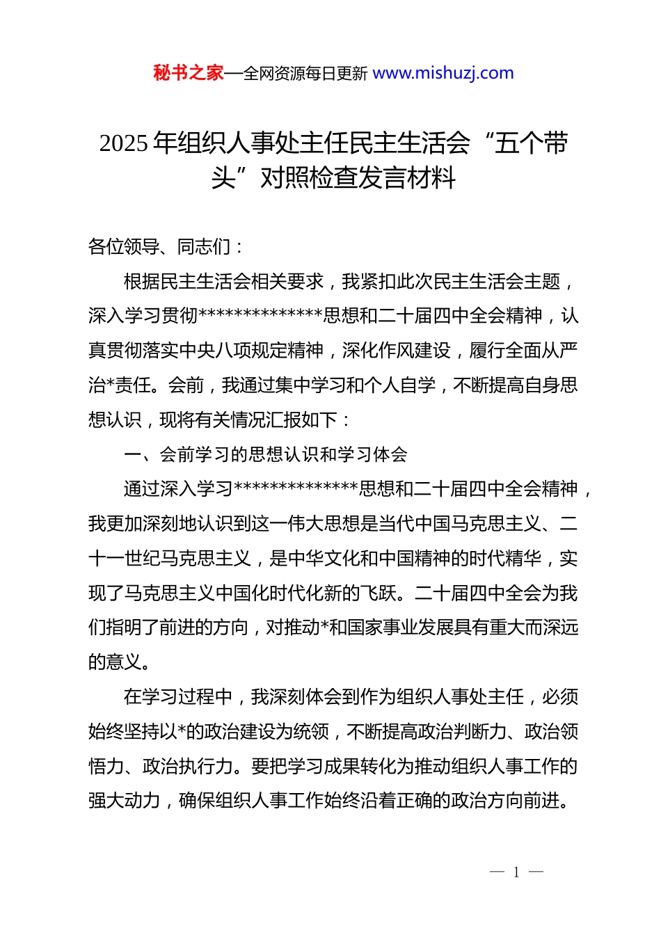 秘书之家—全网资源每日更新 www.mishuzj.com2025 年组织人事处主任民主生活会“五个带头”对照检查发言材料各位领导、同志们:根据民主生活会相关要求,我紧扣此次民主生活会主题,深入学习贯彻**************思想和二十届四中全会精神,认真贯彻落实中央八项规定精神,深化作风建设,履行全面从严治*责任。会前,我通过集中学习和个人自学,不断提高自身思想认识,现将有关情况汇报如下:一、会前学习的思想认识和学习体会通过深入学习**************思想和二十届四中全会精神,我更加深刻地认识到这一伟大思想是当代中国马克思主义、二十一世纪马克思主义,是中华文化和中国精神的时代精华,实现了马克思主义中国化时代化新的飞跃。二十届四中全会为我们指明了前进的方向,对推动*和国家事业发展具有重大而深远的意义。在学习过程中,我深刻体会到作为组织人事处主任,必须始终坚持以*的政治建设为统领,不断提高政治判断力、政治领悟力、政治执行力。要把学习成果转化为推动组织人事工作的强大动力,确保组织人事工作始终沿着正确的政治方向前进。— 1 —秘书之家—全网资源每日更新 www.mishuzj.com同时,要严格遵守中央八项规定精神,深化作风建设,坚决扛起全面从严治*责任,为营造风清气正的政治生态贡献力量。二、存在问题(一)带头强化政治忠诚、提高政治能力方面一是政治理论学习的深度和系统性不足。虽然积极参加*组织安排的学习活动,但在个人自学中,存在碎片化学习的问题,对**************思想的核心要义、精神实质、丰富内涵和实践要求理解不够深入,缺乏系统性的研究和思考。例如,在学习一些重要理论文章时,只是泛泛而读,没有深入分析其中的逻辑关系和实践指导意义。二是政治敏锐性和政治鉴别力有待提高。在面对一些复杂的社会现象和网络舆情时,有时不能及时从政治高度去分析和判断,对一些错误思潮和言论缺乏敏锐的洞察力和坚决的斗争精神。比如,在看到一些网络上传播的不实信息时,没有第一时间站出来进行驳斥和纠正。三是政治能力与新时代组织人事工作要求还有差距。在处理一些涉及政治原则和组织人事工作大局的问题时,还存在不够果断、不够成熟的情况。例如,在干部选拔任用工作中,对于一些有争议的干部人选,在综合考虑政治素质、工作能力和群众口碑等方面还不够全面、精准。— 2 —秘书之家—全网资源每日更新 www.mishuzj.com(二)带头固本培元、增强*性方面一是*性修养的自觉性不够强。在日常工作和生活中,有时会放松对自己的要求,缺乏严格的*性锻炼。例如,在参加*组织生活时,有时存在走过场的思想,没有真正把自己摆进去,认真开展批评与自我批评。二是理想信念的坚定性不够。在面对一些困难和挑战时,偶尔会出现信心不足、意志动摇的情况。比如,在推进一些组织人事改革工作时,遇到阻力和困难,就会产生畏难情绪,对改革的信心和决心有所动摇。三是宗旨意识有所淡化。在工作中,有时会过于注重业务工作,而忽视了群众的需求和利益。例如,在处理干部职工的诉求时,有时会存在拖延、推诿的现象,没有及时有效地解决他们的实际问题。(三)带头敬畏人民、敬畏组织、敬畏法纪方面一是对群众的感情不够深厚。在与干部职工沟通交流时,有时缺乏耐心和细心,没有真正倾听他们的心声和诉求。例如,在组织开展干部职工满意度调查时,只是简单地发放问卷,没有深入了解他们对组织人事工作的意见和建议。二是对组织的忠诚度有待进一步提高。在工作中,有时会存在本位主义思想,过于关注本部门的利益,而忽视了组织的— 3 —秘书之家—全网资源每日更新 www.mishuzj.com整体利益。例如,在协调组织人事工作与其他部门工作时,有时会强调本部门的困难和需求,而不愿意做出一些必要的让步和牺牲。三是法纪意识不够强。在日常工作中,有时会存在打擦边球的现象,对一些规章制度的执行不够严格。例如,在干部人事档案管理工作中,有时会因为工作繁忙而放松对档案审核的标准,存在一定的档案信息不准确、不完整的问题。(四)带头干事创业、担当作为方面一是工作创新意识不足。在组织人事工作中,习惯于按照传统的方式和方法开展工作,缺乏创...