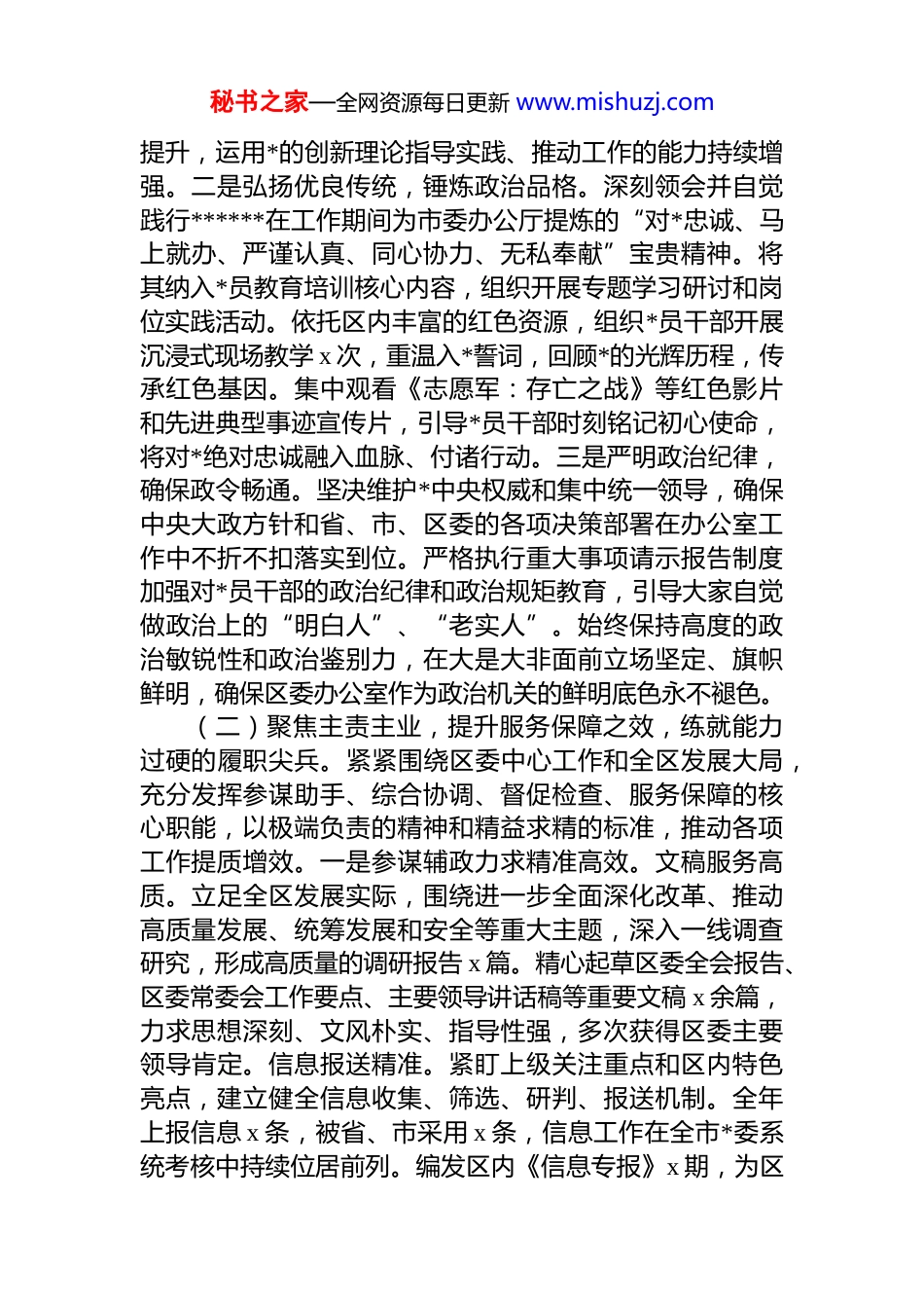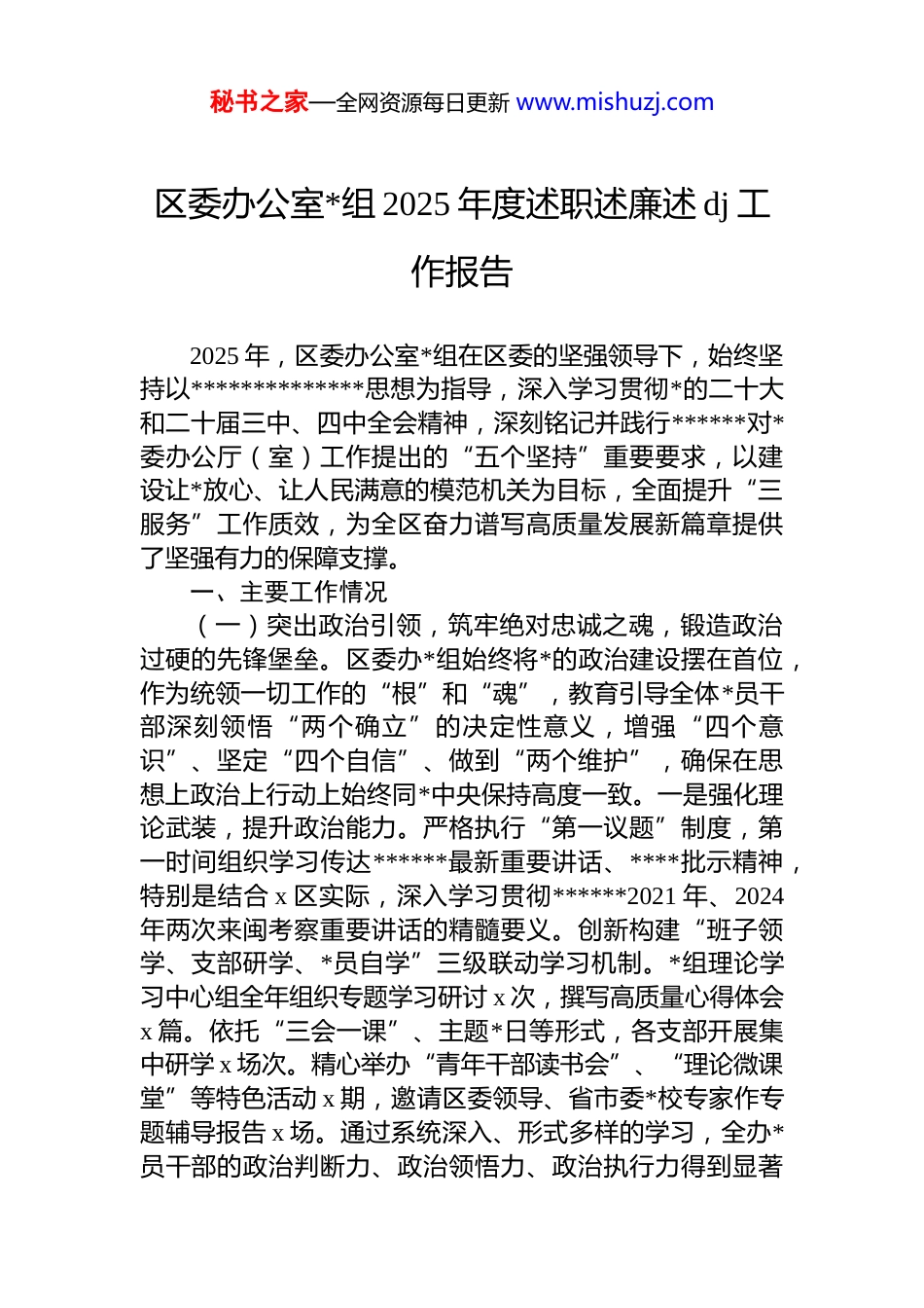 秘书之家—全网资源每日更新 www.mishuzj.com区委办公室*组 2025 年度述职述廉述 dj 工作报告2025 年,区委办公室*组在区委的坚强领导下,始终坚持以**************思想为指导,深入学习贯彻*的二十大和二十届三中、四中全会精神,深刻铭记并践行******对*委办公厅(室)工作提出的“五个坚持”重要要求,以建设让*放心、让人民满意的模范机关为目标,全面提升“三服务”工作质效,为全区奋力谱写高质量发展新篇章提供了坚强有力的保障支撑。一、主要工作情况(一)突出政治引领,筑牢绝对忠诚之魂,锻造政治过硬的先锋堡垒。区委办*组始终将*的政治建设摆在首位,作为统领一切工作的“根”和“魂”,教育引导全体*员干部深刻领悟“两个确立”的决定性意义,增强“四个意识”、坚定“四个自信”、做到“两个维护”,确保在思想上政治上行动上始终同*中央保持高度一致。一是强化理论武装,提升政治能力。严格执行“第一议题”制度,第一时间组织学习传达******最新重要讲话、****批示精神,特别是结合 x 区实际,深入学习贯彻******2021 年、2024年两次来闽考察重要讲话的精髓要义。创新构建“班子领学、支部研学、*员自学”三级联动学习机制。*组理论学习中心组全年组织专题学习研讨 x 次,撰写高质量心得体会x 篇。依托“三会一课”、主题*日等形式,各支部开展集中研学 x 场次。精心举办“青年干部读书会”、“理论微课堂”等特色活动 x 期,邀请区委领导、省市委*校专家作专题辅导报告 x 场。通过系统深入、形式多样的学习,全办*员干部的政治判断力、政治领悟力、政治执行力得到显著秘书之家—全网资源每日更新 www.mishuzj.com提升,运用*的创新理论指导实践、推动工作的能力持续增强。二是弘扬优良传统,锤炼政治品格。深刻领会并自觉践行******在工作期间为市委办公厅提炼的“对*忠诚、马上就办、严谨认真、同心协力、无私奉献”宝贵精神。将其纳入*员教育培训核心内容,组织开展专题学习研讨和岗位实践活动。依托区内丰富的红色资源,组织*员干部开展沉浸式现场教学 x 次,重温入*誓词,回顾*的光辉历程,传承红色基因。集中观看《志愿军:存亡之战》等红色影片和先进典型事迹宣传片,引导*员干部时刻铭记初心使命,将对*绝对忠诚融入血脉、付诸行动。三是严明政治纪律,确保政令畅通。坚决维护*中央权威和集中统一领导,确保中央大政方针和省、市、区委的各项决策部署在办公室工作中不折不扣落实到位。严格执行重大事项请示报告制度加强对*员干部的政治纪律和政治规矩教育,引导大家自觉做政治上的“明白人”、“老实人”。始终保持高度的政治敏锐性和政治鉴别力,在大是大非面前立场坚定、旗帜鲜明,确保区委办公室作为政治机关的鲜明底色永不褪色。(二)聚焦主责主业,提升服务保障之效,练就能力过硬的履职尖兵。紧紧围绕区委中心工作和全区发展大局,充分发挥参谋助手、综合协调、督促检查、服务保障的核心职能,以极端负责的精神和精益求精的标准,推动各项工作提质增效。一是参谋辅政力求精准高效。文稿服务高质。立足全区发展实际,围绕进一步全面深化改革、推动高质量发展、统筹发展和安全等重大主题,深入一线调查研究,形成高质量的调研报告 x 篇。精心起草区委全会报告、区委常委会工作要点、主要领导讲话稿等重要文稿 x 余篇,力求思想深刻、文风朴实、指导性强,多次获得区委主要领导肯定。信息报送精准。紧盯上级关注重点和区内特色亮点,建立健全信息收集、筛选、研判、报送机制。全年上报信息 x 条,被省、市采用 x 条,信息工作在全市*委系统考核中持续位居前列。编发区内《信息专报》x 期,为区秘书之家—全网资源每日更新 www.mishuzj.com委掌握情况、科学决策提供了重要参考。深化改革统筹有力。充分发挥深改办职能作用,加强改革任务的统筹协调督促落实。重点推动的集团化办医模式改革成效显著,相关经验在全省深改委会议上作典型交流;“工业上楼”创新试点取得突破性进展,成功入选国务院国资委改革深化提升行动优秀案例集及全省深化拓展“深学争优、敢为争先、实干争效”行动典型案例。全年协调推进改革事项 x...