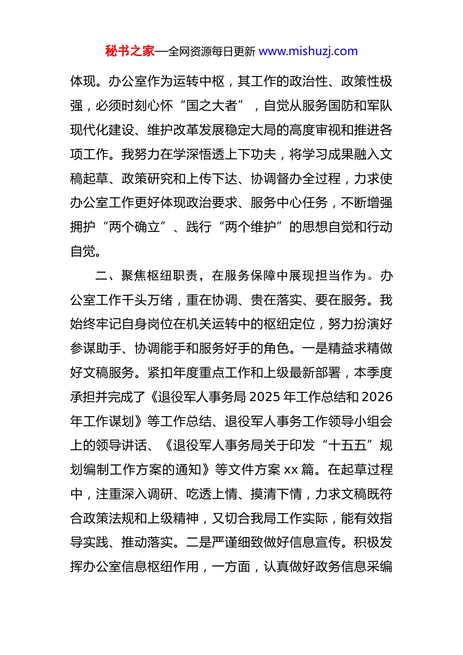 秘书之家—全网资源每日更新 www.mishuzj.com入党积极分子 2025 年第四季度思想汇报 时光荏苒,2025 年第四季度即将结束。在组织的悉心关怀与严格教育下,在单位领导和同事们的热心指导与帮助下,我始终以一名党员的标准鞭策自己,持续加强思想淬炼、政治历练和实践锻炼。本季度,我立足退役军人事务局办公室岗位实际,聚焦主责主业,努力将理论学习成果转化为服务保障、协调运转的实际效能,对党的宗旨初心和自身肩负的使命责任有了更深切的体悟。现将本季度思想与工作情况汇报如下:一、坚持思想引领,在理论学习中校准前行方向。我深刻认识到,政治上的坚定源于理论上的清醒。本季度,我始终将学习党的创新理论作为提升自我、推动工作的首要任务。系统学习了党的二十大及二十届四中全会精神,重点研读了习近平总书记关于退役军人工作的重要论述和系列指示批示,深刻领会党中央关于“巩固提高一体化国家战略体系和能力”的战略部署对退役军人事务工作提出的新要求。通过学习《习近平著作选读》等权威著作,研读《中共中央关于制定国民经济和社会发展第十五个五年规划的建议》等,我更加清晰地认识到,退役军人工作是强军事业的重要组成部分,是“国之大者”在基层的生动秘书之家—全网资源每日更新 www.mishuzj.com体现。办公室作为运转中枢,其工作的政治性、政策性极强,必须时刻心怀“国之大者”,自觉从服务国防和军队现代化建设、维护改革发展稳定大局的高度审视和推进各项工作。我努力在学深悟透上下功夫,将学习成果融入文稿起草、政策研究和上传下达、协调督办全过程,力求使办公室工作更好体现政治要求、服务中心任务,不断增强拥护“两个确立”、践行“两个维护”的思想自觉和行动自觉。二、聚焦枢纽职责,在服务保障中展现担当作为。办公室工作千头万绪,重在协调、贵在落实、要在服务。我始终牢记自身岗位在机关运转中的枢纽定位,努力扮演好参谋助手、协调能手和服务好手的角色。一是精益求精做好文稿服务。紧扣年度重点工作和上级最新部署,本季度承担并完成了《退役军人事务局 2025 年工作总结和 2026年工作谋划》等工作总结、退役军人事务工作领导小组会上的领导讲话、《退役军人事务局关于印发“十五五”规划编制工作方案的通知》等文件方案 xx 篇。在起草过程中,注重深入调研、吃透上情、摸清下情,力求文稿既符合政策法规和上级精神,又切合我局工作实际,能有效指导实践、推动落实。二是严谨细致做好信息宣传。积极发挥办公室信息枢纽作用,一方面,认真做好政务信息采编秘书之家—全网资源每日更新 www.mishuzj.com报送工作,及时反映我局在移交安置、就业创业、拥军优抚、权益维护等方面的举措与成效,本季度向省厅、两办上报信息 xx 期,其中 xx 篇被上级采用;另一方面,主动参与对外宣传工作,协同业务科室,挖掘退役军人先进典型和感人故事,策划专题宣传,在主流媒体平台发布稿件xx 篇,努力讲好退役军人故事,传播尊崇军人职业的时代强音。三是统筹协调做好运转保障。高效完成公文流转、会议组织、事务协调等日常工作,确保政令畅通、衔接有序。同时,认真履行办公室承担的法治建设、国家安全(保密)工作联络等专项职责。参与完善内部规章制度,开展普法宣传;增强保密意识,规范涉密文件管理。通过这些工作,我深刻体会到办公室工作无小事,必须做到严谨周密、规范高效,才能为全局工作顺利开展提供坚实支撑。三、锤炼过硬作风,在严格自律中擦亮政治本色。作为一名积极向党组织靠拢的青年干部,我深知加强党性修养、严守纪律规矩的重要性。本季度,我积极参加党纪学习教育,逐章逐条学习新修订的《中国共产党纪律处分条例》,并联系实际进行自我检视。通过学习,进一步明确了行为边界,增强了政治定力、纪律定力、道德定力、抵腐定力。在工作中,我始终绷紧廉洁自律这根弦,严格遵秘书之家—全网资源每日更新 www.mishuzj.com守中央八项规定精神及其实施细则,遵守单位各项规章制度。在处理文件、协调事务、使用资源时,坚持原则、秉公办事,自觉抵制不正之风。在生活中,注重培养健康的生活情趣,保持简朴作风,净化社交圈。...