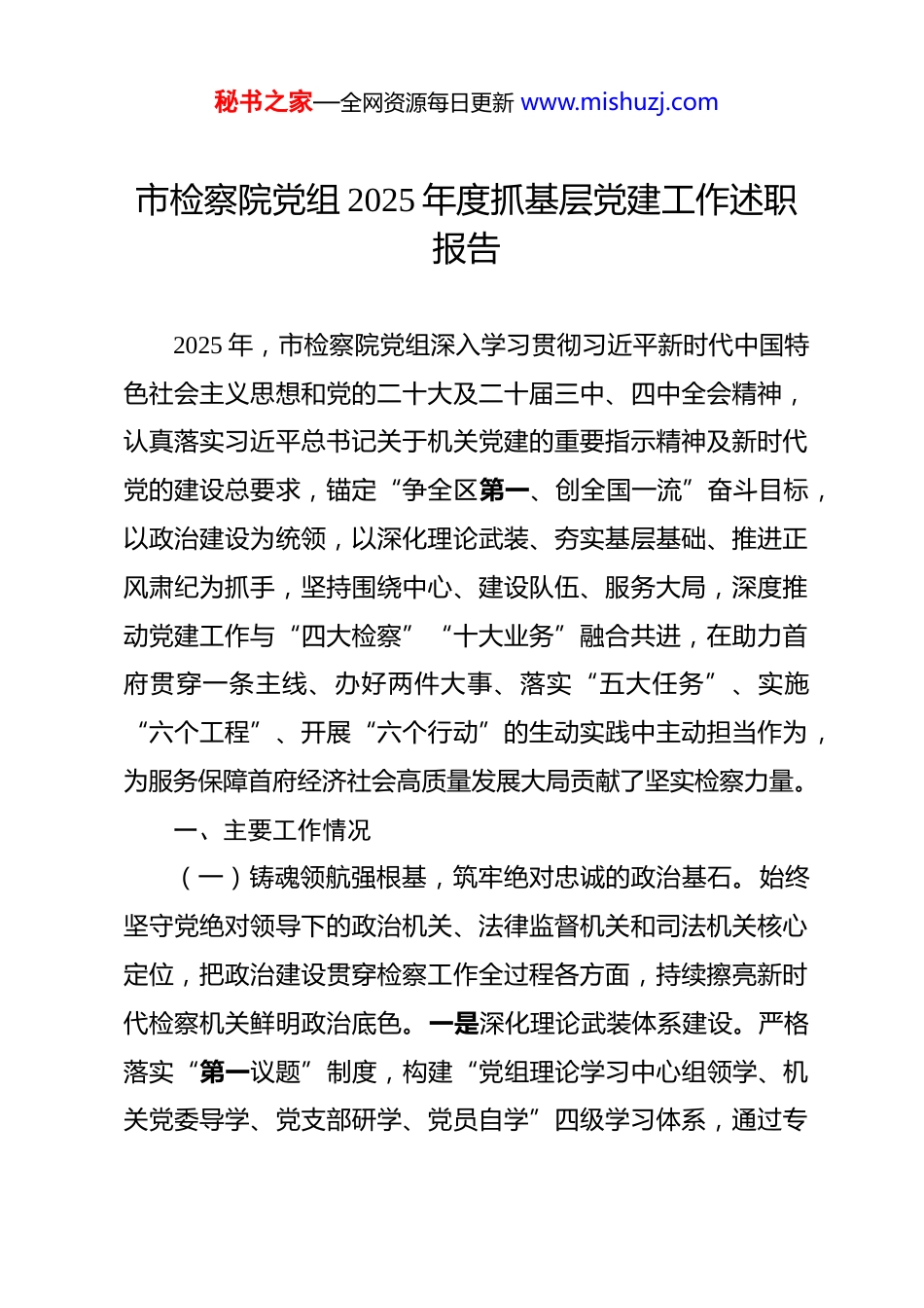 秘书之家—全网资源每日更新 www.mishuzj.com市检察院党组 2025 年度抓基层党建工作述职报告 2025 年,市检察院党组深入学习贯彻习近平新时代中国特色社会主义思想和党的二十大及二十届三中、四中全会精神,认真落实习近平总书记关于机关党建的重要指示精神及新时代党的建设总要求,锚定“争全区第一、创全国一流”奋斗目标,以政治建设为统领,以深化理论武装、夯实基层基础、推进正风肃纪为抓手,坚持围绕中心、建设队伍、服务大局,深度推动党建工作与“四大检察”“十大业务”融合共进,在助力首府贯穿一条主线、办好两件大事、落实“五大任务”、实施“六个工程”、开展“六个行动”的生动实践中主动担当作为,为服务保障首府经济社会高质量发展大局贡献了坚实检察力量。一、主要工作情况(一)铸魂领航强根基,筑牢绝对忠诚的政治基石。始终坚守党绝对领导下的政治机关、法律监督机关和司法机关核心定位,把政治建设贯穿检察工作全过程各方面,持续擦亮新时代检察机关鲜明政治底色。一是深化理论武装体系建设。严格落实“第一议题”制度,构建“党组理论学习中心组领学、机关党委导学、党支部研学、党员自学”四级学习体系,通过专秘书之家—全网资源每日更新 www.mishuzj.com题读书班、集中研讨、领导干部上讲台等形式,深学细悟习近平新时代中国特色社会主义思想、习近平法治思想,全年开展党组理论学习中心组学习 16 次、专题研讨 8 次,实现理论学习入脑入心。创新打造“五个课堂”学习矩阵,初心课堂通过红色教育基地现场教学厚植信仰根基,先锋课堂邀请英模典型分享事迹激发担当精神,廉政课堂依托警示教育基地筑牢思想防线,一线课堂组织干警下沉基层锤炼实战本领,匠心课堂通过业务研讨精进专业能力,累计开展各类学习活动 120 余场。二是创新学习载体形式。构建“书记领学、骨干导学、青年研学”三级联动机制,推行“领导干部带头讲、业务骨干专题讲、青年干警互动讲”模式,举办“青检小课堂”46 期,变“被动听学”为“主动研学”,充分调动全员学习积极性。搭建“线上+线下”融合学习平台,线下开展大讲堂、专题讲座、主题沙龙等活动 38 场,邀请党校专家、法学教授、业务标兵授课 26人次;线上依托检察网络学院开设专属学习专栏,上传学习资料 300 余份,干警累计学时达一是 2 万小时,形成“随时学、自主学、全员学”的良好氛围。三是强化政治忠诚教育。常态化开展政治机关意识教育、对党忠诚教育,组织党员干部赴红色教育基地开展“重温入党誓词、传承红色基因”主题活动 6次,开展“学思想、强党性、重实践、建新功”主题党日活动秘书之家—全网资源每日更新 www.mishuzj.com48 场,引导全体检察干警深刻领悟“两个确立”的决定性意义,增强“四个意识”、坚定“四个自信”、做到“两个维护”,不断提高政治判断力、政治领悟力、政治执行力。(二)强基固本筑堡垒,构建坚强有力的组织支撑。坚持大抓基层的鲜明导向,以标准化规范化建设为抓手,不断提升基层党组织政治功能和组织功能,推动基层党建全面进步、全面过硬。一是优化组织体系设置。打破“科室与支部简单对应”的传统模式,按照“业务相近、人员互补、便于管理、利于工作”原则,动态调整设置 12 个在职党员党支部、3 个离退休干部党支部,实现党组织设置与检察业务工作深度契合。健全“党组抓总、机关党委统筹、党支部落实”三级责任体系,制定《党建工作责任清单》,将党建责任细化为 8 大类 36 项具体任务,层层签订党建工作责任书,形成“一级抓一级、层层抓落实”的责任闭环,杜绝党建责任“悬空”现象。二是推进标准化规范化建设。以基层党组织标准化规范化建设为核心目标,制定《党支部标准化规范化建设实施方案》,从基本组织、基本队伍、基本活动、基本制度、基本保障五个方面明确建设标准。强化党务干部能力建设,举办党务工作者专题培训班 4期,开展党建业务实操演练 6 次,提升党务工作者政策理解、组织协调和履职尽责能力。严格落实“三会一课”、组织生活秘书之家—全网资源每日更新 www.mishuzj.com会、民主评议党员等制度,机关党委每月制定《...