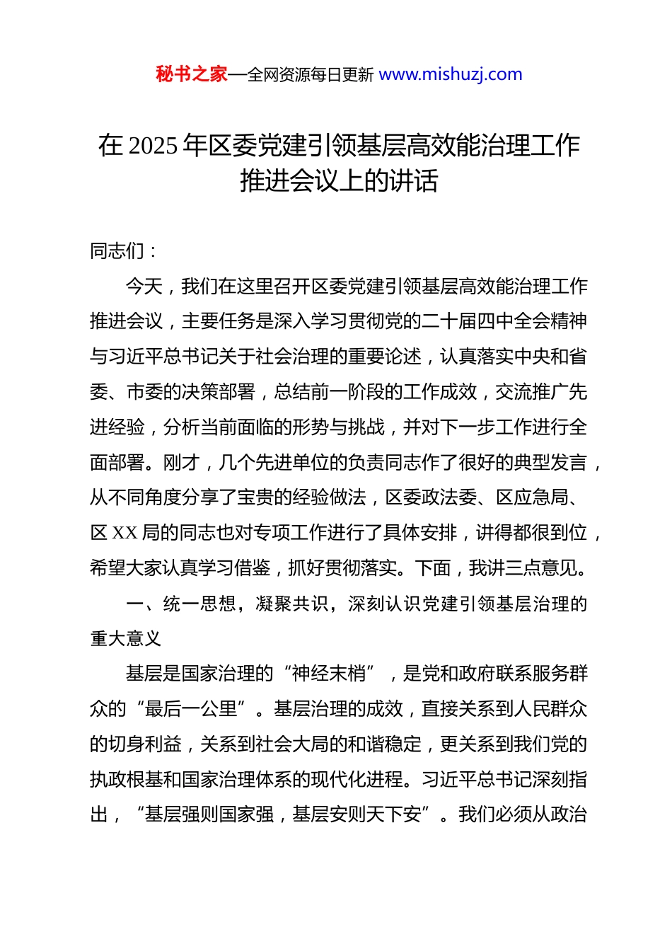 秘书之家—全网资源每日更新 www.mishuzj.com在 2025 年区委党建引领基层高效能治理工作推进会议上的讲话 同志们:今天,我们在这里召开区委党建引领基层高效能治理工作推进会议,主要任务是深入学习贯彻党的二十届四中全会精神与习近平总书记关于社会治理的重要论述,认真落实中央和省委、市委的决策部署,总结前一阶段的工作成效,交流推广先进经验,分析当前面临的形势与挑战,并对下一步工作进行全面部署。刚才,几个先进单位的负责同志作了很好的典型发言,从不同角度分享了宝贵的经验做法,区委政法委、区应急局、区 XX 局的同志也对专项工作进行了具体安排,讲得都很到位,希望大家认真学习借鉴,抓好贯彻落实。下面,我讲三点意见。一、统一思想,凝聚共识,深刻认识党建引领基层治理的重大意义基层是国家治理的“神经末梢”,是党和政府联系服务群众的“最后一公里”。基层治理的成效,直接关系到人民群众的切身利益,关系到社会大局的和谐稳定,更关系到我们党的执政根基和国家治理体系的现代化进程。习近平总书记深刻指出,“基层强则国家强,基层安则天下安”。我们必须从政治秘书之家—全网资源每日更新 www.mishuzj.com和全局的高度,深刻领会和把握新时代加强基层治理的极端重要性。近年来,在区委的坚强领导下,全区各级党组织坚持以党建为统领,积极探索基层治理的新路径、新模式,取得了一系列阶段性成果。我们的治理体系不断健全,以“五基四化”为总抓手,全面构建起“党委统筹、专班推进、部门联动”的协同工作格局,推动党的组织体系与治理体系深度融合。我们的治理网络日益织密,创新推行“四级网格+三类组织”模式,将过去纷繁复杂的“千条线”有效拧成服务群众的“一张网”,治理单元持续下沉,服务触角延伸至楼栋庭院,基本实现了全区网格化管理覆盖率接近 100%的良好局面。我们的治理效能显著提升,通过党员干部下沉网格、常态化联系群众,一大批群众反映强烈的“急难愁盼”问题在基层一线得到及时发现和有效解决,矛盾纠纷就地化解率稳步提高,群众的获得感、幸福感、安全感持续攀升,这为我区经济社会高质量发展营造了和谐稳定的社会环境。刚才发言的 XX 街道、XX 镇、XX 村以及 XX 行业协会党支部,就是我们众多基层单位奋力探索的生动缩影。XX 街道在搭建一体化治理平台方面先行先试,实现了指令“一键直达”、服务“一网通办”;XX 镇在深化网格化治理体系建设秘书之家—全网资源每日更新 www.mishuzj.com上精耕细作,让小网格释放出大能量;XX 村在激发群众自治活力上成效卓著,形成了共建共治共享的良好氛围;XX 行业协会党支部在新兴领域的党建工作中勇于创新,有力推动了行业健康发展。这些实践充分证明,坚持和加强党的全面领导,是做好基层治理工作的根本保证。只要我们始终把党的领导贯穿于基层治理的全过程、各方面,就一定能不断开创基层高效能治理的新局面。在肯定成绩的同时,我们也要清醒地看到,对标新时代的新要求和人民群众的新期待,我们的工作仍存在一些不容忽视的短板和弱项。比如,部分地区和单位对党建引领的理解还不够深刻,存在“就党建抓党建、就治理抓治理”的现象,融合度有待提高;治理体系的系统性、整体性、协同性仍需加强,“条块分割”、数据壁垒等问题在一定程度上依然存在;基层治理队伍的能力素质参差不齐,专业化水平亟待提升;运用法治思维、法治方式和信息化、智能化手段解决问题的能力还需进一步增强。对于这些问题,我们必须高度重视,以自我革命的精神,拿出切实可行的措施,在后续工作中认真加以解决。二、精准发力,协同联动,全面提升党建引领基层高效能治理的质效做好新形势下的基层治理工作,是一项系统工程,必须坚秘书之家—全网资源每日更新 www.mishuzj.com持问题导向、目标导向和效果导向相统一,聚焦重点领域和关键环节,精准施策,务求实效。全区上下要牢牢把握习近平总书记提出的“五个重要要求”,紧密结合我区实际,扎实推进各项工作任务,确保以高效能治理促进高质量发展、保障高水平安全。第一,必须强化政治引领,筑牢基层治理的“主心骨”。党的领导是基层治理的...