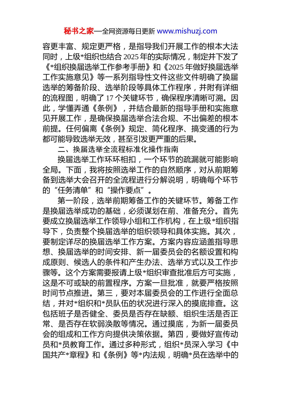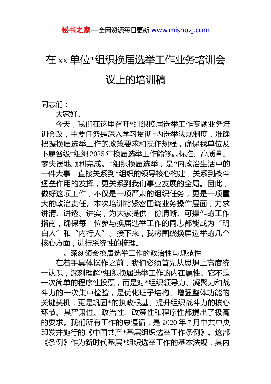 秘书之家—全网资源每日更新 www.mishuzj.com在 xx 单位*组织换届选举工作业务培训会议上的培训稿同志们:大家好。今天,我们在这里召开*组织换届选举工作专题业务培训会议,主要任务是深入学习贯彻*内选举法规制度,准确把握换届选举工作的政策要求和操作规程,确保我单位及下属各级*组织 2025 年换届选举工作能够高标准、高质量、零失误地顺利完成。*组织换届选举,是*内政治生活中的一件大事,直接关系到*组织的领导核心构建,关系到战斗堡垒作用的发挥,更关系到我们事业发展的全局。因此,做好这项工作,不仅是一项严肃的组织任务,更是一项重大的政治责任。本次培训将紧密围绕业务操作层面,力求讲清、讲透、讲实,为大家提供一份清晰、可操作的工作指南,确保每一位参与换届选举工作的同志都能成为“明白人”和“内行人”。接下来,我将围绕换届选举的几个核心方面,进行系统性的梳理。一、深刻领会换届选举工作的政治性与规范性在着手具体操作之前,我们必须首先从思想上高度统一认识,深刻理解*组织换届选举工作的内在属性。它不是一次简单的程序性投票,而是对*组织领导力、凝聚力和战斗力的一次集中检验,是优化班子结构、增强整体功能的关键契机,更是巩固*的执政根基、提升组织战斗力的核心环节。其严肃性、政治性、政策性和程序性都提出了极高的要求。我们所有工作的总遵循,是 2020 年 7 月中共中央印发并施行的《中国共产*基层组织选举工作条例》。这部《条例》作为新时代基层*组织选举工作的基本法规,其内秘书之家—全网资源每日更新 www.mishuzj.com容更丰富、规定更严格,是指导我们开展工作的根本大法同时,上级*组织也结合 2025 年的实际情况,制定并下发了《*组织换届选举工作参考手册》和《2025 年做好换届选举工作实施意见》等一系列指导性文件这些文件明确了换届选举的筹备阶段、选举阶段等具体工作程序,并附有详细的流程图,明确了 17 个关键环节,确保程序清晰可溯。因此,学懂弄通《条例》,并结合最新的指导手册和实施意见开展工作,是确保换届选举合法合规、不出偏差的根本前提。任何偏离《条例》规定、简化程序、搞变通的行为都可能导致选举无效,甚至引发更严重的后果。二、换届选举全流程标准化操作指南换届选举工作环环相扣,一个环节的疏漏就可能影响全局。下面,我将按照选举工作的自然顺序,对从前期筹备到选举大会召开的全流程进行分解说明,明确每个环节的“任务清单”和“操作要点”。第一阶段,选举前期筹备工作的关键环节。筹备工作是换届选举成功的基础,必须谋划在前、准备充分。首先要成立换届选举工作领导小组和工作机构,在上级*组织指导下,负责整个换届选举的组织领导和具体实施。其次,要制定详尽的换届选举工作方案。方案内容应涵盖指导思想、换届选举的时间安排、新一届委员会的名额设置和构成原则、候选人的条件和产生办法、选举方式以及工作步骤等。这个方案需要报请上级*组织审查批准后方可实施,这是不可或缺的前置程序。方案一旦批准,就要严格按照时间节点推进。第三,要对本届委员会的工作进行全面总结,并对*组织和*员队伍的状况进行深入的摸底排查。这包括班子是否健全、委员是否存在缺额、组织生活是否正常、是否存在软弱涣散等情况。通过摸底,为新一届委员会的组成和工作方向提供决策依据。第四,要做好宣传动员和*员教育工作。通过多种形式,组织*员深入学习《中国共产*章程》和《条例》等*内法规,明确*员在选举中的秘书之家—全网资源每日更新 www.mishuzj.com权利和义务,引导*员正确行使民主权利,为换届选举营造风清气正的良好氛围。最后,根据本单位的实际情况和工作需要,科学确定新一届委员会的委员名额、书记、副书记职数,并就委员的构成提出指导性意见,这个事项同样需要提前向上级*组织请示并获得批复。第二阶段,候选人酝酿提名与资格审查的严密程序。选准配强领导班子是换届选举的核心目标,而候选人的质量直接决定了班子的质量。这个过程必须充分发扬*内民主,严格按照程序进行。候选人的酝酿提名一般采取“自下而上、上下结合”的方式进行。通常由*支部组织全体*员进行推荐提...