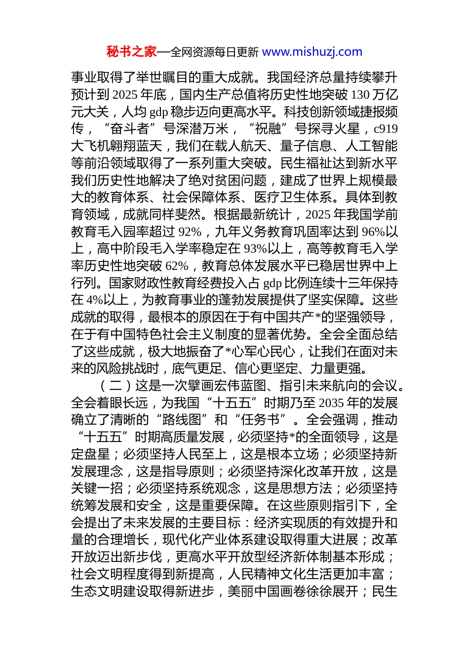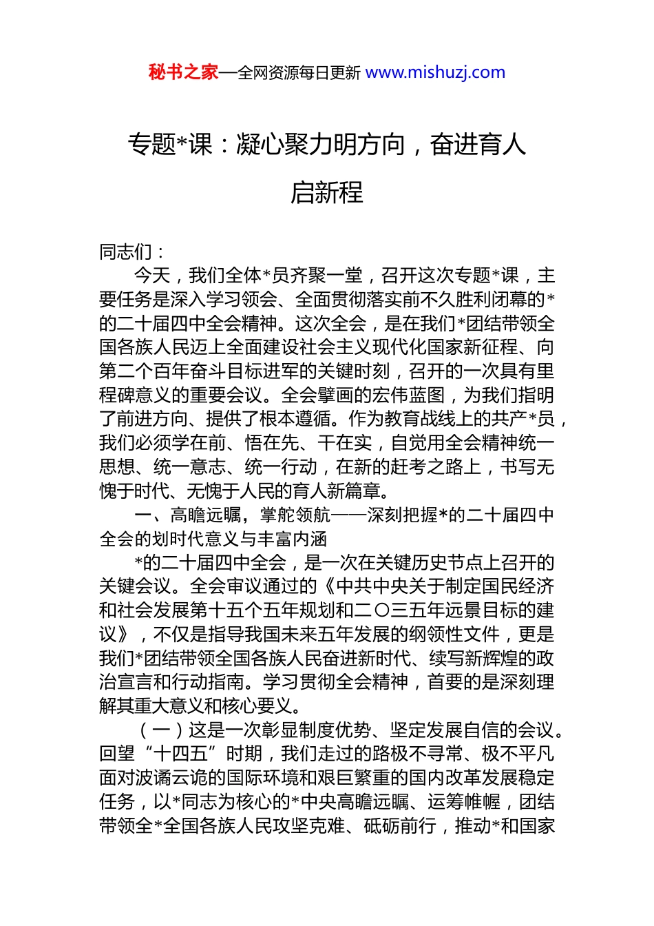 秘书之家—全网资源每日更新 www.mishuzj.com专题*课:凝心聚力明方向,奋进育人启新程同志们:今天,我们全体*员齐聚一堂,召开这次专题*课,主要任务是深入学习领会、全面贯彻落实前不久胜利闭幕的*的二十届四中全会精神。这次全会,是在我们*团结带领全国各族人民迈上全面建设社会主义现代化国家新征程、向第二个百年奋斗目标进军的关键时刻,召开的一次具有里程碑意义的重要会议。全会擘画的宏伟蓝图,为我们指明了前进方向、提供了根本遵循。作为教育战线上的共产*员,我们必须学在前、悟在先、干在实,自觉用全会精神统一思想、统一意志、统一行动,在新的赶考之路上,书写无愧于时代、无愧于人民的育人新篇章。一、高瞻远瞩,掌舵领航——深刻把握*的二十届四中全会的划时代意义与丰富内涵*的二十届四中全会,是一次在关键历史节点上召开的关键会议。全会审议通过的《中共中央关于制定国民经济和社会发展第十五个五年规划和二〇三五年远景目标的建议》,不仅是指导我国未来五年发展的纲领性文件,更是我们*团结带领全国各族人民奋进新时代、续写新辉煌的政治宣言和行动指南。学习贯彻全会精神,首要的是深刻理解其重大意义和核心要义。(一)这是一次彰显制度优势、坚定发展自信的会议。回望“十四五”时期,我们走过的路极不寻常、极不平凡面对波谲云诡的国际环境和艰巨繁重的国内改革发展稳定任务,以*同志为核心的*中央高瞻远瞩、运筹帷幄,团结带领全*全国各族人民攻坚克难、砥砺前行,推动*和国家秘书之家—全网资源每日更新 www.mishuzj.com事业取得了举世瞩目的重大成就。我国经济总量持续攀升预计到 2025 年底,国内生产总值将历史性地突破 130 万亿元大关,人均 gdp 稳步迈向更高水平。科技创新领域捷报频传,“奋斗者”号深潜万米,“祝融”号探寻火星,c919大飞机翱翔蓝天,我们在载人航天、量子信息、人工智能等前沿领域取得了一系列重大突破。民生福祉达到新水平我们历史性地解决了绝对贫困问题,建成了世界上规模最大的教育体系、社会保障体系、医疗卫生体系。具体到教育领域,成就同样斐然。根据最新统计,2025 年我国学前教育毛入园率超过 92%,九年义务教育巩固率达到 96%以上,高中阶段毛入学率稳定在 93%以上,高等教育毛入学率历史性地突破 62%,教育总体发展水平已稳居世界中上行列。国家财政性教育经费投入占 gdp 比例连续十三年保持在 4%以上,为教育事业的蓬勃发展提供了坚实保障。这些成就的取得,最根本的原因在于有中国共产*的坚强领导,在于有中国特色社会主义制度的显著优势。全会全面总结了这些成就,极大地振奋了*心军心民心,让我们在面对未来的风险挑战时,底气更足、信心更坚定、力量更强。(二)这是一次擘画宏伟蓝图、指引未来航向的会议。全会着眼长远,为我国“十五五”时期乃至 2035 年的发展确立了清晰的“路线图”和“任务书”。全会强调,推动“十五五”时期高质量发展,必须坚持*的全面领导,这是定盘星;必须坚持人民至上,这是根本立场;必须坚持新发展理念,这是指导原则;必须坚持深化改革开放,这是关键一招;必须坚持系统观念,这是思想方法;必须坚持统筹发展和安全,这是重要保障。在这些原则指引下,全会提出了未来发展的主要目标:经济实现质的有效提升和量的合理增长,现代化产业体系建设取得重大进展;改革开放迈出新步伐,更高水平开放型经济新体制基本形成;社会文明程度得到新提高,人民精神文化生活更加丰富;生态文明建设取得新进步,美丽中国画卷徐徐展开;民生秘书之家—全网资源每日更新 www.mishuzj.com福祉达到新水平,基本公共服务均等化水平明显提升;国家治理效能得到新提升,发展安全保障更加有力。这一系列目标相互支撑、有机统一,构成了中国式现代化的宏伟图景,为我们每个行业、每个单位、每个人的奋斗标注了时代方位。(三)这是一次聚焦强国建设、凸显教育根基的会议。全会报告中一个极其重要的战略部署,就是将教育强国、科技强国、人才强国建设进行一体统筹、一体推进。这充分彰显了*中央对教育事业前所未有的高度重视。报告明确指出,教育是国之大计、*之大计,是民族振...