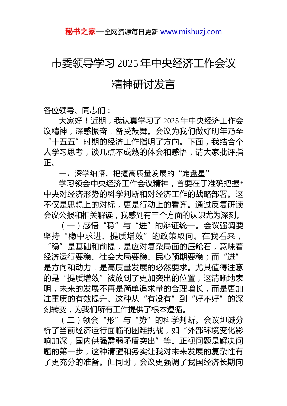 秘书之家—全网资源每日更新 www.mishuzj.com市委领导学习 2025 年中央经济工作会议精神研讨发言各位领导、同志们:大家好!近期,我认真学习了 2025 年中央经济工作会议精神,深感振奋,备受鼓舞。会议为我们做好明年乃至“十五五”时期的经济工作指明了方向。下面,我结合个人学习思考,谈几点不成熟的体会和感悟,请大家批评指正。一、深学细悟,把握高质量发展的“定盘星”学习领会中央经济工作会议精神,首要在于准确把握*中央对经济形势的科学判断和对经济工作的战略部署。这不仅是思想上的对标,更是行动上的看齐。通过反复研读会议公报和相关解读,我感到有三个方面的认识尤为深刻。(一)感悟“稳”与“进”的辩证统一。会议强调要坚持“稳中求进、提质增效”的政策取向。在我看来,“稳”是基础和前提,是应对复杂局面的压舱石,意味着经济运行要稳、社会大局要稳、民心预期要稳;而“进”是方向和动力,是高质量发展的必然要求。尤其值得注意的是“提质增效”被放到了更加突出的位置,这清晰地表明,未来的发展不再是简单追求量的合理增长,而是更加注重质的有效提升。这种从“有没有”到“好不好”的深刻转变,为我们所有工作提供了根本遵循。(二)领会“形”与“势”的科学判断。会议坦诚分析了当前经济运行面临的困难挑战,如“外部环境变化影响加深,国内供强需弱矛盾突出”等。正视问题是解决问题的第一步,这种清醒和务实让我对未来发展的复杂性有了更充分的准备。但同时,会议更强调了我国经济长期向秘书之家—全网资源每日更新 www.mishuzj.com好的基本趋势没有改变。特别是提出的“五个必须”新认识,首要一条就是“必须充分挖掘经济潜能”这传递出一种强大的信心和底气。这种信心源于我国超大规模市场、完整的产业体系和丰富的人力资源。看清“形”是暂时的读懂“势”是长远的,就能在风浪中保持定力。(三)坚信“危”与“机”的转化逻辑。当前,世界百年未有之大变局加速演进,挑战与机遇并存。会议提出“必须以苦练内功应对外部挑战”这深刻揭示了变局中开新局的核心方法论。外部的压力,恰恰是倒逼我们产业升级、技术突破、管理创新的最强催化剂。每一次危机,只要应对得当,都能催生新的发展机遇。这要求我们必须摒弃守成心态和路径依赖,以一种更加主动的姿态去拥抱变化、适应变化、引领变化,在攻坚克难中赢得发展的主动权。二、对标反思,找准服务中心大局的“切入点”学习的目的全在于运用。将会议精神与*市“加快打造更具全球影响力的经济中心城市”的目标和本单位的实际工作相结合,我进行了深刻的自我反思,尝试找到能够更好服务中心大局的切入点。(一)聚焦新质生产力,反思创新能力短板。会议将“以科技创新引领现代化产业体系建设”放在突出位置,大力推进新质生产力的发展。新质生产力涵盖了低空经济生物制造、量子科技、人工智能等一系列前沿领域。反思自身,我的知识结构和技能储备是否跟上了时代的步伐?在日常工作中,是否还停留在传统的工作模式和思维定式中?我认为,无论是个人还是单位,都需要有一种“本领恐慌”的紧迫感,主动去学习和拥抱这些新技术、新业态积极思考如何将“人工智能+”行动融入业务流程,通过技能提升和项目实践,为培育新动能贡献一份力量。(二)对表投资人与物,反思资源配置效率。会议提出“必须坚持投资于物和投资于人紧密结合”的重要原则秘书之家—全网资源每日更新 www.mishuzj.com这让我联想到我们单位的资源投入。在实际工作中,是否存在重硬件采购、轻软件开发,重设备引进、轻人员培训的现象?“物”的投资是基础,“人”的投资才是关键,是决定资源能否转化为现实生产力的核心要素。如果先进的设备没有高素质的人才去操作、去维护、去创造性地使用,那么这种投资的效益就会大打折扣。因此,建议在未来的项目规划和预算安排中,更加注重人力资本的投入,将人员培训、团队建设与设备更新、系统升级等“物的投资”同等规划、同步实施。(三)立足深化改革,反思工作作风堵点。会议强调要进一步全面深化改革,持续优化营商环境。其中,“必须做到既‘放得活’又‘管得好’”的原则,对我们改进...
