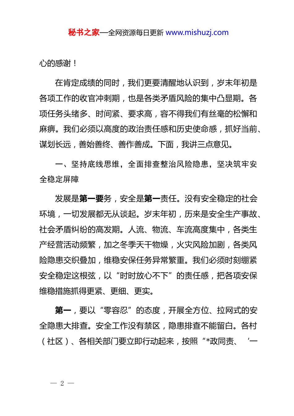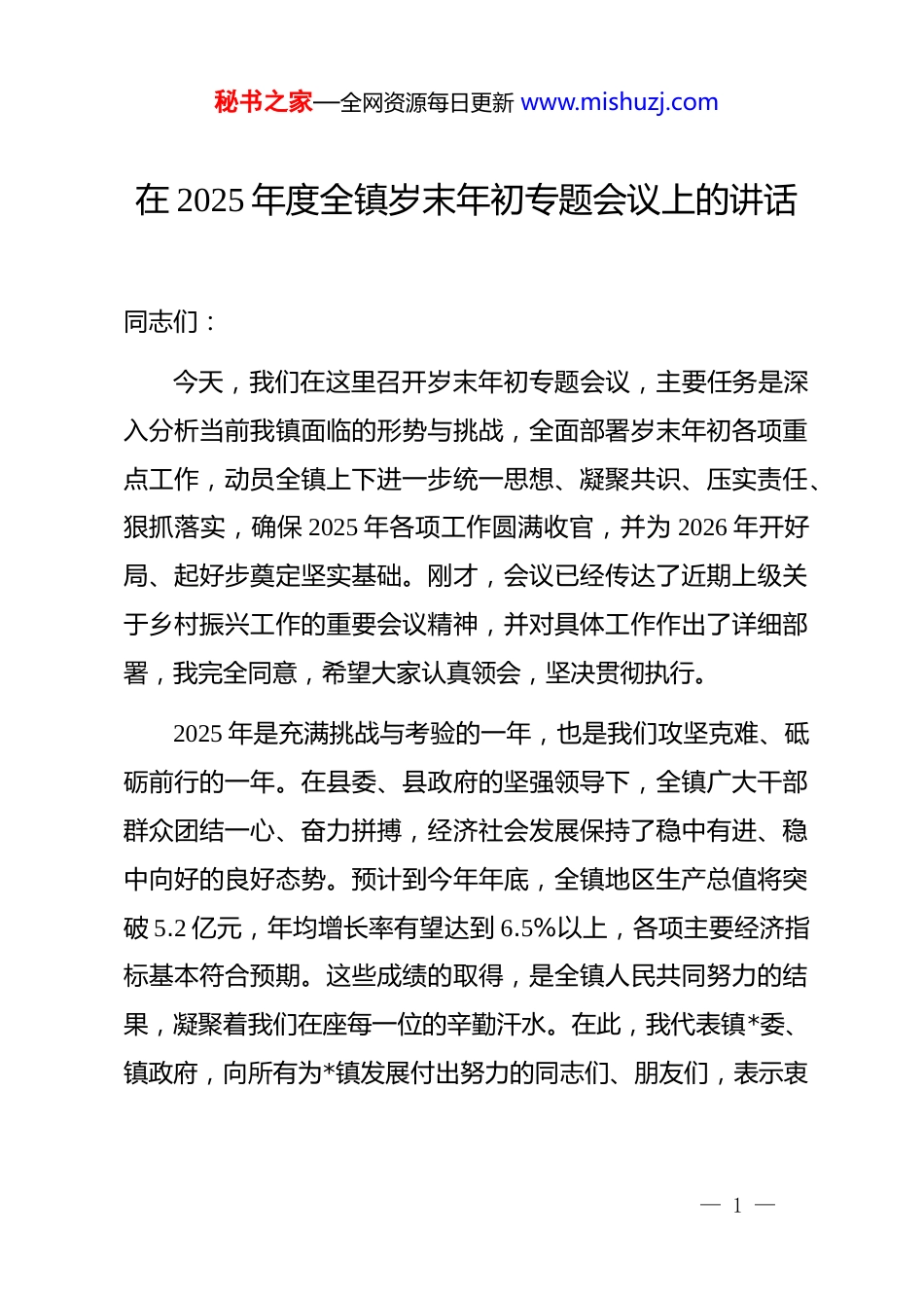 秘书之家—全网资源每日更新 www.mishuzj.com在 2025 年度全镇岁末年初专题会议上的讲话同志们:今天,我们在这里召开岁末年初专题会议,主要任务是深入分析当前我镇面临的形势与挑战,全面部署岁末年初各项重点工作,动员全镇上下进一步统一思想、凝聚共识、压实责任、狠抓落实,确保 2025 年各项工作圆满收官,并为 2026 年开好局、起好步奠定坚实基础。刚才,会议已经传达了近期上级关于乡村振兴工作的重要会议精神,并对具体工作作出了详细部署,我完全同意,希望大家认真领会,坚决贯彻执行。2025 年是充满挑战与考验的一年,也是我们攻坚克难、砥砺前行的一年。在县委、县政府的坚强领导下,全镇广大干部群众团结一心、奋力拼搏,经济社会发展保持了稳中有进、稳中向好的良好态势。预计到今年年底,全镇地区生产总值将突破 5.2 亿元,年均增长率有望达到 6.5%以上,各项主要经济指标基本符合预期。这些成绩的取得,是全镇人民共同努力的结果,凝聚着我们在座每一位的辛勤汗水。在此,我代表镇*委、镇政府,向所有为*镇发展付出努力的同志们、朋友们,表示衷— 1 —秘书之家—全网资源每日更新 www.mishuzj.com心的感谢!在肯定成绩的同时,我们更要清醒地认识到,岁末年初是各项工作的收官冲刺期,也是各类矛盾风险的集中凸显期。各项任务头绪多、时间紧、要求高,容不得我们有丝毫的松懈和麻痹。我们必须以高度的政治责任感和历史使命感,抓好当前、谋划长远,善始善终、善作善成。下面,我讲三点意见。一、坚持底线思维,全面排查整治风险隐患,坚决筑牢安全稳定屏障发展是第一要务,安全是第一责任。没有安全稳定的社会环境,一切发展都无从谈起。岁末年初,历来是安全生产事故、社会矛盾纠纷的高发期。人流、物流、车流高度集中,各类生产经营活动频繁,加之冬季天干物燥,火灾风险加剧,各类风险隐患交织叠加,维稳安保任务异常繁重。我们必须时刻绷紧安全稳定这根弦,以“时时放心不下”的责任感,把各项安保维稳措施抓得更紧、更细、更实。第一,要以“零容忍”的态度,开展全方位、拉网式的安全隐患大排查。安全工作没有禁区,隐患排查不能留白。各村(社区)、各相关部门要立即行动起来,按照“*政同责、‘一— 2 —秘书之家—全网资源每日更新 www.mishuzj.com岗双责’、齐抓共管、失职追责”的要求,主要负责同志要亲自带队,深入一线,对辖区内所有行业领域开展一次彻底的、无死角的“地毯式”排查。要重点聚焦安全生产、消防安全、道路交通、建筑施工、食品药品安全、燃气安全、危化品管理等关键领域。对于企业车间、在建工地、九小场所、学校医院、养老机构、大型商超等人员密集场所,要作为重中之重,反复检查,确保不漏一处、不放过一个疑点。排查不能走过场、搞形式,要真正沉下去,用“放大镜”去查找问题,用“显微镜”去分析根源。第二,要以“钉钉子”的精神,建立台账、闭环管理,确保问题整改动态清零。发现问题是能力,解决问题才是水平。对于排查出的所有风险隐患,必须建立详尽的台账,形成“问题清单、责任清单、整改清单”。每一项隐患都要明确整改责任主体、具体责任人、整改措施和完成时限,做到“一患一策”。对能够立即整改的,要立行立改、马上就办;对短期内难以根治的,要制定严密的防范监控措施,并倒排工期、挂图作战、限期销号。镇安委办要发挥好牵头抓总作用,加强统筹协调和督办检查,对整改情况进行跟踪问效,整改一个、销号一个,坚决杜绝“纸上整改”“虚假整改”。根据近期初步摸— 3 —秘书之家—全网资源每日更新 www.mishuzj.com排,全镇共发现各类隐患 158 处,目前已完成整改销号的比例超过 95%,但剩下的都是难啃的“硬骨头”,必须集中力量攻坚,确保在年底前全部清零。第三,要以“法治化”的思维,加强源头治理和综合稳控。安全稳定工作,功夫要下在平时。我们要持续强化法治宣传教育,特别是要提升基层干部运用法治思维和法治方式化解矛盾、处理问题的能力。要深入开展矛盾纠纷排查化解工作,密切关注征地拆迁、劳资纠纷、邻里关系等领域的苗头性、倾向性问题,做到早发现、早介入、早化解,...