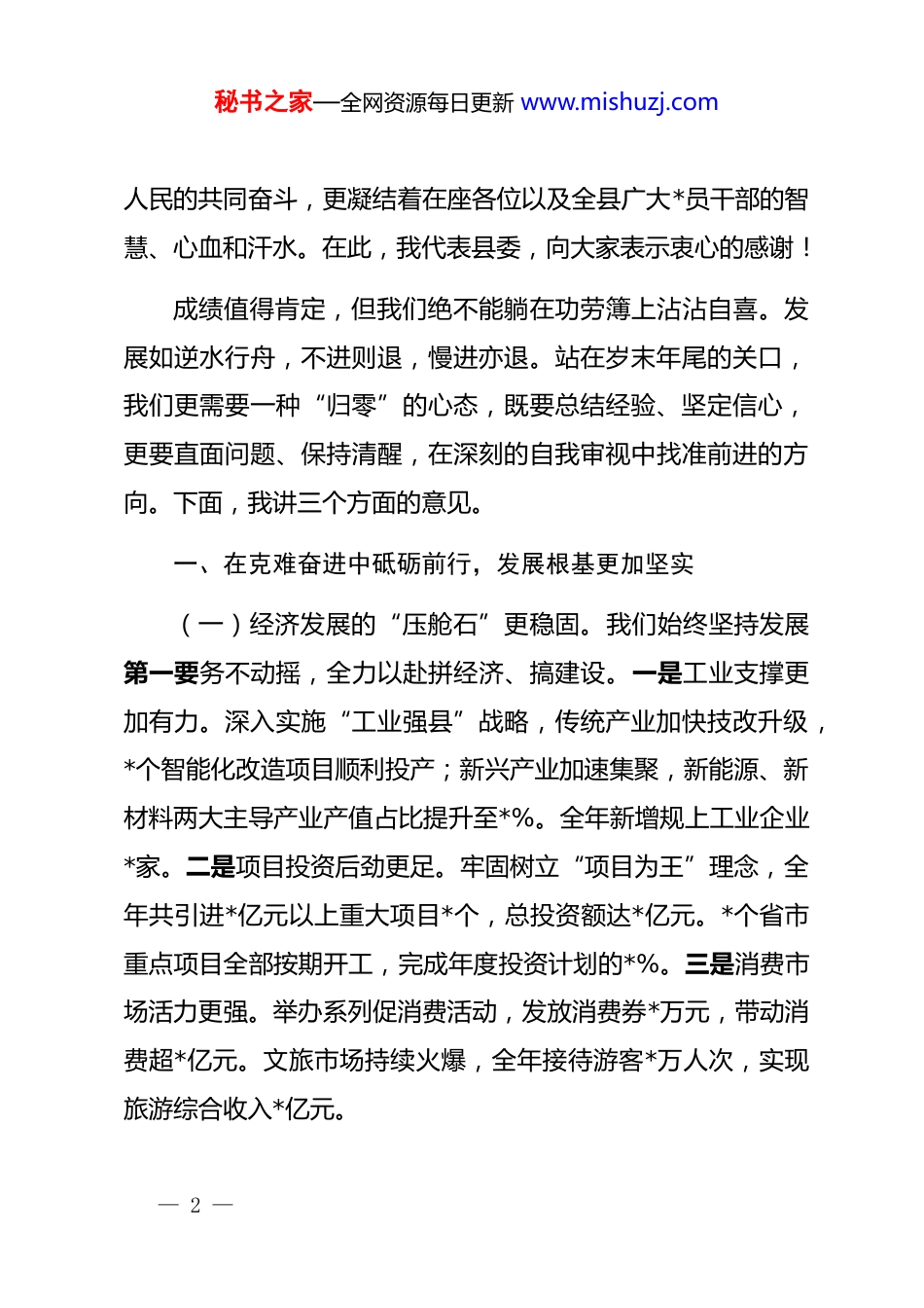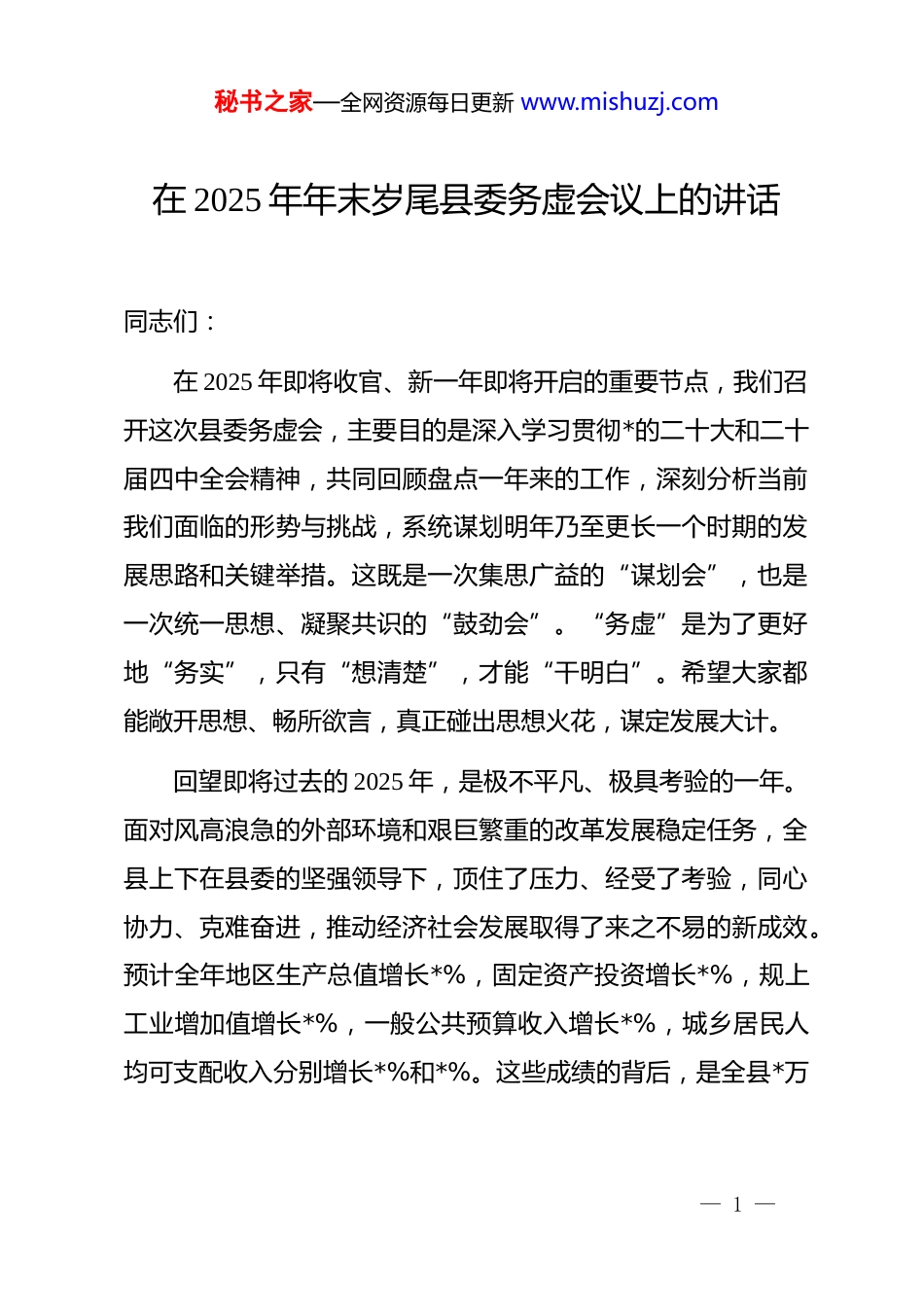 秘书之家—全网资源每日更新 www.mishuzj.com在 2025 年年末岁尾县委务虚会议上的讲话同志们:在 2025 年即将收官、新一年即将开启的重要节点,我们召开这次县委务虚会,主要目的是深入学习贯彻*的二十大和二十届四中全会精神,共同回顾盘点一年来的工作,深刻分析当前我们面临的形势与挑战,系统谋划明年乃至更长一个时期的发展思路和关键举措。这既是一次集思广益的“谋划会”,也是一次统一思想、凝聚共识的“鼓劲会”。“务虚”是为了更好地“务实”,只有“想清楚”,才能“干明白”。希望大家都能敞开思想、畅所欲言,真正碰出思想火花,谋定发展大计。回望即将过去的 2025 年,是极不平凡、极具考验的一年。面对风高浪急的外部环境和艰巨繁重的改革发展稳定任务,全县上下在县委的坚强领导下,顶住了压力、经受了考验,同心协力、克难奋进,推动经济社会发展取得了来之不易的新成效。预计全年地区生产总值增长*%,固定资产投资增长*%,规上工业增加值增长*%,一般公共预算收入增长*%,城乡居民人均可支配收入分别增长*%和*%。这些成绩的背后,是全县*万— 1 —秘书之家—全网资源每日更新 www.mishuzj.com人民的共同奋斗,更凝结着在座各位以及全县广大*员干部的智慧、心血和汗水。在此,我代表县委,向大家表示衷心的感谢!成绩值得肯定,但我们绝不能躺在功劳簿上沾沾自喜。发展如逆水行舟,不进则退,慢进亦退。站在岁末年尾的关口,我们更需要一种“归零”的心态,既要总结经验、坚定信心,更要直面问题、保持清醒,在深刻的自我审视中找准前进的方向。下面,我讲三个方面的意见。一、在克难奋进中砥砺前行,发展根基更加坚实(一)经济发展的“压舱石”更稳固。我们始终坚持发展第一要务不动摇,全力以赴拼经济、搞建设。一是工业支撑更加有力。深入实施“工业强县”战略,传统产业加快技改升级,*个智能化改造项目顺利投产;新兴产业加速集聚,新能源、新材料两大主导产业产值占比提升至*%。全年新增规上工业企业*家。二是项目投资后劲更足。牢固树立“项目为王”理念,全年共引进*亿元以上重大项目*个,总投资额达*亿元。*个省市重点项目全部按期开工,完成年度投资计划的*%。三是消费市场活力更强。举办系列促消费活动,发放消费券*万元,带动消费超*亿元。文旅市场持续火爆,全年接待游客*万人次,实现旅游综合收入*亿元。— 2 —秘书之家—全网资源每日更新 www.mishuzj.com(二)改革创新的“动力源”更强劲。我们坚持向改革要活力,向创新要动力。一是营商环境持续优化。深化“放管服”改革,全面推行“一网通办”“一枚印章管审批”,企业开办时间压缩至*个工作日以内。全年新增市场主体*户,增长*%。二是重点领域改革纵深推进。国企改革三年行动圆满收官,县属国有企业资产总额、利润总额分别增长*%和*%。农村“三块地”改革试点取得积极进展,盘活闲置宅基地*宗、集体经营性建设用地*亩。三是创新生态加速形成。与*所高校、*家科研院所建立产学研合作关系,建成省级以上创新平台*个,全社会研发投入强度达到*%,技术合同成交额增长*%。(三)城乡融合的“协调性”更加凸显。我们统筹推进以县城为重要载体的新型城镇化和乡村全面振兴。一是城市品质功能实现新提升。完成*个老旧小区改造,新增城市绿地*万平方米,打通“断头路”*条。智慧停车、智慧环卫等应用场景加快建设,城市治理“一网统管”平台投入运行。二是乡村振兴战略迈出新步伐。深入学习践行“千万工程”经验,成功创建省级美丽乡村示范村*个。特色农业蓬勃发展,建成高标准农田*万亩,粮食总产实现“*连丰”。“**山羊”“**苹果”等区域公用品牌价值突破*亿元。三是基础设施网络不断完善。**高— 3 —秘书之家—全网资源每日更新 www.mishuzj.com速公路建成通车,结束了我县不通高速的历史。城乡供水一体化、城乡公交一体化覆盖率分别达到*%和*%。(四)民生福祉的“获得感”更充实。我们始终坚持以人民为中心的发展思想,财政支出的*%以上用于民生领域。一是就业社保网底织密扎牢。城镇新增就业*人,零就业家庭动态清零。城乡居民基本养老保险、基本医疗保险参保率稳定在*%以...