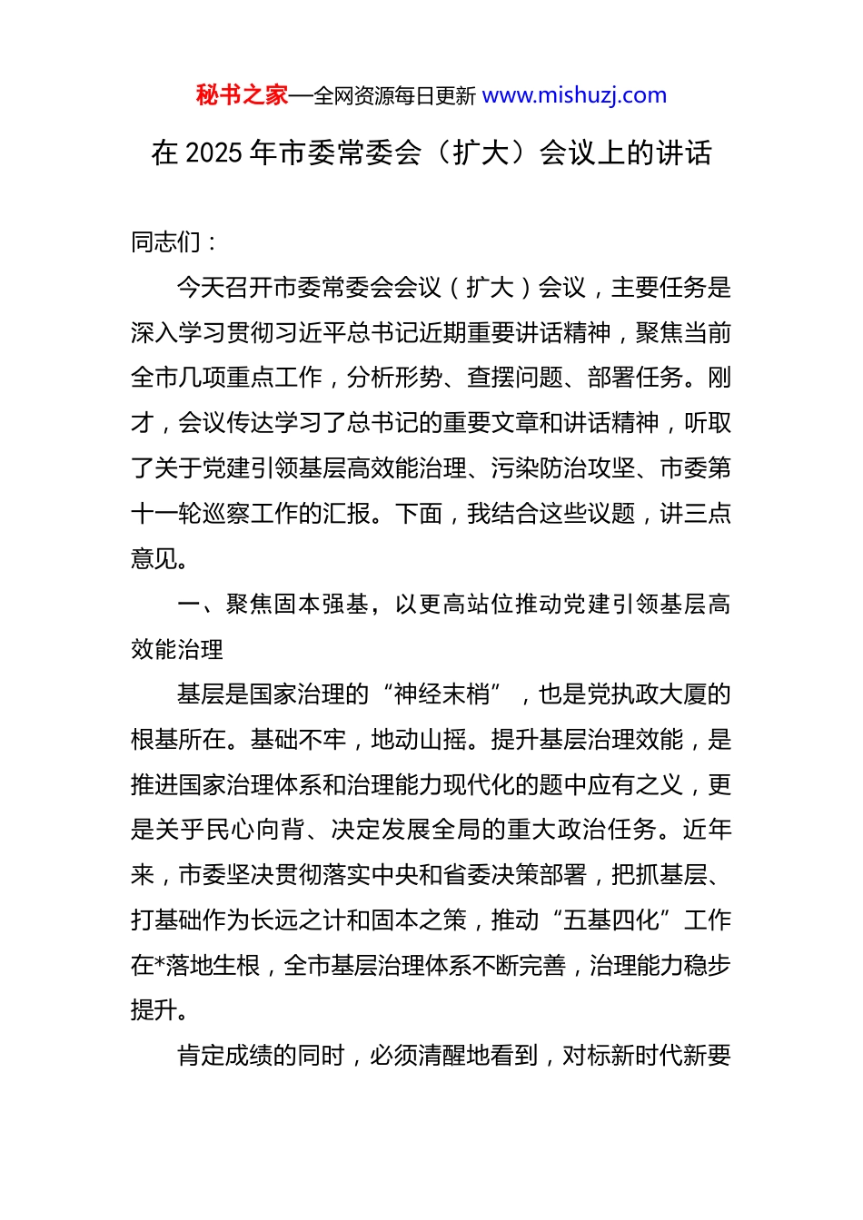 秘书之家—全网资源每日更新 www.mishuzj.com在 2025 年市委常委会(扩大)会议上的讲话 同志们:今天召开市委常委会会议(扩大)会议,主要任务是深入学习贯彻习近平总书记近期重要讲话精神,聚焦当前全市几项重点工作,分析形势、查摆问题、部署任务。刚才,会议传达学习了总书记的重要文章和讲话精神,听取了关于党建引领基层高效能治理、污染防治攻坚、市委第十一轮巡察工作的汇报。下面,我结合这些议题,讲三点意见。一、聚焦固本强基,以更高站位推动党建引领基层高效能治理基层是国家治理的“神经末梢”,也是党执政大厦的根基所在。基础不牢,地动山摇。提升基层治理效能,是推进国家治理体系和治理能力现代化的题中应有之义,更是关乎民心向背、决定发展全局的重大政治任务。近年来,市委坚决贯彻落实中央和省委决策部署,把抓基层、打基础作为长远之计和固本之策,推动“五基四化”工作在*落地生根,全市基层治理体系不断完善,治理能力稳步提升。肯定成绩的同时,必须清醒地看到,对标新时代新要秘书之家—全网资源每日更新 www.mishuzj.com求,对标人民群众的新期盼,我市基层治理工作仍存在一些不容忽视的短板和弱项。主要体现在:一是体系建设的系统性有待增强。有的地方党建引领的“主轴”作用发挥不充分,党组织政治功能和组织功能未能完全转化为治理效能,不同领域、不同层级党组织之间联动不够,资源整合、力量统筹的壁垒尚未完全打破。二是治理手段的精准度有待提升。数字化、智能化应用水平参差不齐,部分基层治理平台存在“指尖上的形式主义”,线上数据与线下实际“两张皮”现象依然存在,未能真正实现“一网统管”“一网通办”的实战效能。三是治理队伍的能力素质有待加强。部分基层干部应对复杂矛盾和新型风险的能力不足,服务群众的意识和方法跟不上时代发展,面对群众诉求存在“推、拖、绕”现象,专业化、职业化水平亟待提高。四是多元共治的格局尚未完全形成。社会组织、市场主体、新就业群体等新兴力量参与治理的渠道还不够通畅,群众参与治理的主动性和积极性有待进一步激发,共建共治共享的生动局面仍需着力营造。这些问题,既有思想认识不到位的因素,也有体制机制不健全的原因,必须下大力气加以解决。为此,必须在以下几个方面持续用力、久久为功。第一,强化政治引领,筑牢基层治理的“主心骨”。必须毫不动摇地坚持和加强党对基层治理的秘书之家—全网资源每日更新 www.mishuzj.com全面领导,将党的领导贯穿于基层治理的全过程、各方面。要持续推动“五基四化”细化实化具体化,对标省委下达的 21 项硬任务,逐项分解、拉出清单、明确抓手,确保每项任务都有具体路径和量化指标,形成可衡量、可检验的工作成效。要健全市、县、乡、村四级联动的党建引领基层治理指挥体系,强化乡镇(街道)党(工)委的龙头作用,赋予其对辖区内重大事项的统筹协调、指挥调度和监督考核权限。要将基层治理工作纳入各级党委书记抓基层党建述职评议考核的重要内容,压实“一把手”第一责任人责任,形成一级抓一级、层层抓落实的强大合力。第二,深化数字赋能,激活基层治理的“新引擎”。顺应数字化变革趋势,推动基层治理从“经验治理”向“智慧治理”转型。要加快建成全市一体化社会治理综合指挥平台,整合公安、城管、应急、信访等部门数据资源,打破信息孤岛,实现态势全面感知、风险智能预警、事件闭环处置。在*区探索的“党建聚合化、管理网格化、服务智能化”等创新做法,取得了治安案件同比下降 35%,群众安全感满意度达到 98%的良好效果,要认真总结并加以推广。要进一步优化网格化管理服务,科学划分、动态调整基础网格,建强“网格党支部+专职网格员+N”的网格团队,确保“小事不出网格,大事不出社区”。据统计,目秘书之家—全网资源每日更新 www.mishuzj.com前全市网格化管理覆盖率已达 100%,但必须在精细化、实效化上再下功夫,力争到 2026 年,通过平台流转处置的网格事件办结率达到 98%以上。第三,聚焦群众关切,疏通基层治理的“毛细血管”。基层治理的成效,最终要体现在群众的笑脸上。要深入践行以人民为中心的发展思想,...