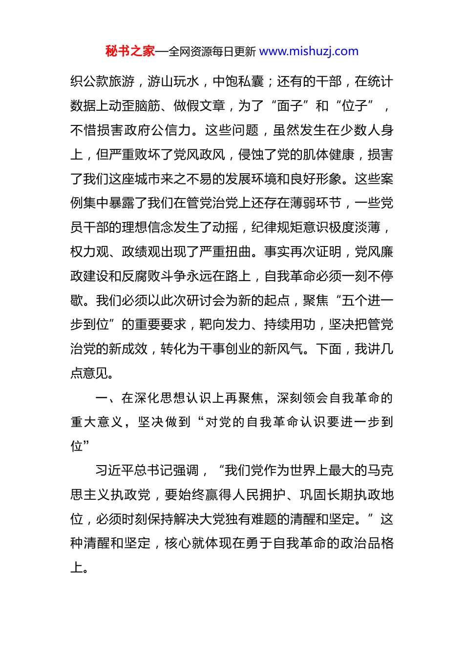 秘书之家—全网资源每日更新 www.mishuzj.com在 2025 年市委理论学习中心组集中研讨会上的讲话 同志们:今天,我们召开市委理论学习中心组集中研讨会,主要任务是深入学习领会习近平总书记关于党的建设的重要思想、关于党的自我革命的重要思想,结合近期发生的违规接待、统计造假等典型案例,进行一次深刻的党性分析和思想洗礼。目的就是要以案为镜、以案示警,在思想上再紧弦、在认识上再深化、在行动上再聚焦,以刀刃向内的勇气和刮骨疗毒的决心,推动全面从严治党向纵深发展,为我市高质量发展提供最坚实的政治保障。党的十八大以来,习近平总书记从事关党长期执政、国家长治久安的战略高度,提出了一系列关于党的自我革命的原创性、标志性新理念新思想新战略,为我们深入推进全面从严治党提供了根本遵循。然而,理论上的清醒不代表行动上的坚定。近期,我市查处的一些典型案例,性质严重,影响恶劣,令人警醒、发人深思。有的干部,拿着公家的钱,办自己的私事,将公务接待变成亲友聚会的“私人宴席”,KTV 唱歌、打牌娱乐的费用也想方设法用公款报销;有的干部,以党建活动、业务对接为幌子,组秘书之家—全网资源每日更新 www.mishuzj.com织公款旅游,游山玩水,中饱私囊;还有的干部,在统计数据上动歪脑筋、做假文章,为了“面子”和“位子”,不惜损害政府公信力。这些问题,虽然发生在少数人身上,但严重败坏了党风政风,侵蚀了党的肌体健康,损害了我们这座城市来之不易的发展环境和良好形象。这些案例集中暴露了我们在管党治党上还存在薄弱环节,一些党员干部的理想信念发生了动摇,纪律规矩意识极度淡薄,权力观、政绩观出现了严重扭曲。事实再次证明,党风廉政建设和反腐败斗争永远在路上,自我革命必须一刻不停歇。我们必须以此次研讨会为新的起点,聚焦“五个进一步到位”的重要要求,靶向发力、持续用功,坚决把管党治党的新成效,转化为干事创业的新风气。下面,我讲几点意见。一、在深化思想认识上再聚焦,深刻领会自我革命的重大意义,坚决做到“对党的自我革命认识要进一步到位”习近平总书记强调,“我们党作为世界上最大的马克思主义执政党,要始终赢得人民拥护、巩固长期执政地位,必须时刻保持解决大党独有难题的清醒和坚定。”这种清醒和坚定,核心就体现在勇于自我革命的政治品格上。秘书之家—全网资源每日更新 www.mishuzj.com首先,要破除“自找麻烦”的错误观念。有的同志认为,自我革命就是自我加压、自找麻烦,会束缚手脚,影响干事。这种认识是极其错误的。无数事实证明,一个政党最难的不是战胜对手,而是战胜自己。放任自流、讳疾忌医,只会积重难返、病入膏肓。只有敢于刀刃向内,主动进行政治体检、思想除尘,及时清除侵蚀党的健康肌体的病毒,我们党才能始终保持先进性和纯洁性,才能在应对各种风险挑战中立于不败之地。对于我们市而言,当前正处在转型发展的关键期、攻坚克难的窗口期,面临的矛盾和问题更加复杂,我们只有不断进行自我革命,才能淬炼出更强的战斗力,团结带领全市人民闯关夺隘、走向未来。其次,要纠正“影响发展”的模糊认识。有人担心,全面从严治党抓得太紧、太严,会影响经济发展,让干部不敢担当、不愿作为。这是一种典型的“伪命题”。风清气正的政治生态,恰恰是最好的营商环境,是推动高质量发展的最有力保障。试想,如果一个地方乌烟瘴气,权力寻租、吃拿卡要横行,谁还愿意来投资兴业?如果统计数据弄虚作假,决策部署就会偏离实际,发展就会走上歧途。我们必须清醒地认识到,从严管党治党与推动发展是完全统一、相辅相成的。我们查处违纪违法问题,惩治的秘书之家—全网资源每日更新 www.mishuzj.com只是极少数腐败分子,保护的是广大干事创业的干部;我们净化政治生态,就是要为所有市场主体营造一个公平、公正、透明的发展环境。要把自我革命的勇气和智慧,转化为破解发展难题、厚植发展优势的强大动能。再者,要克服“与己无关”的狭隘思维。部分同志觉得,自我革命是上级部门或者领导的事情,跟自己没有多大关系,这种想法是非常短视的。自我革命并非遥不可及的高大上概念,而是与每一位党员干部...