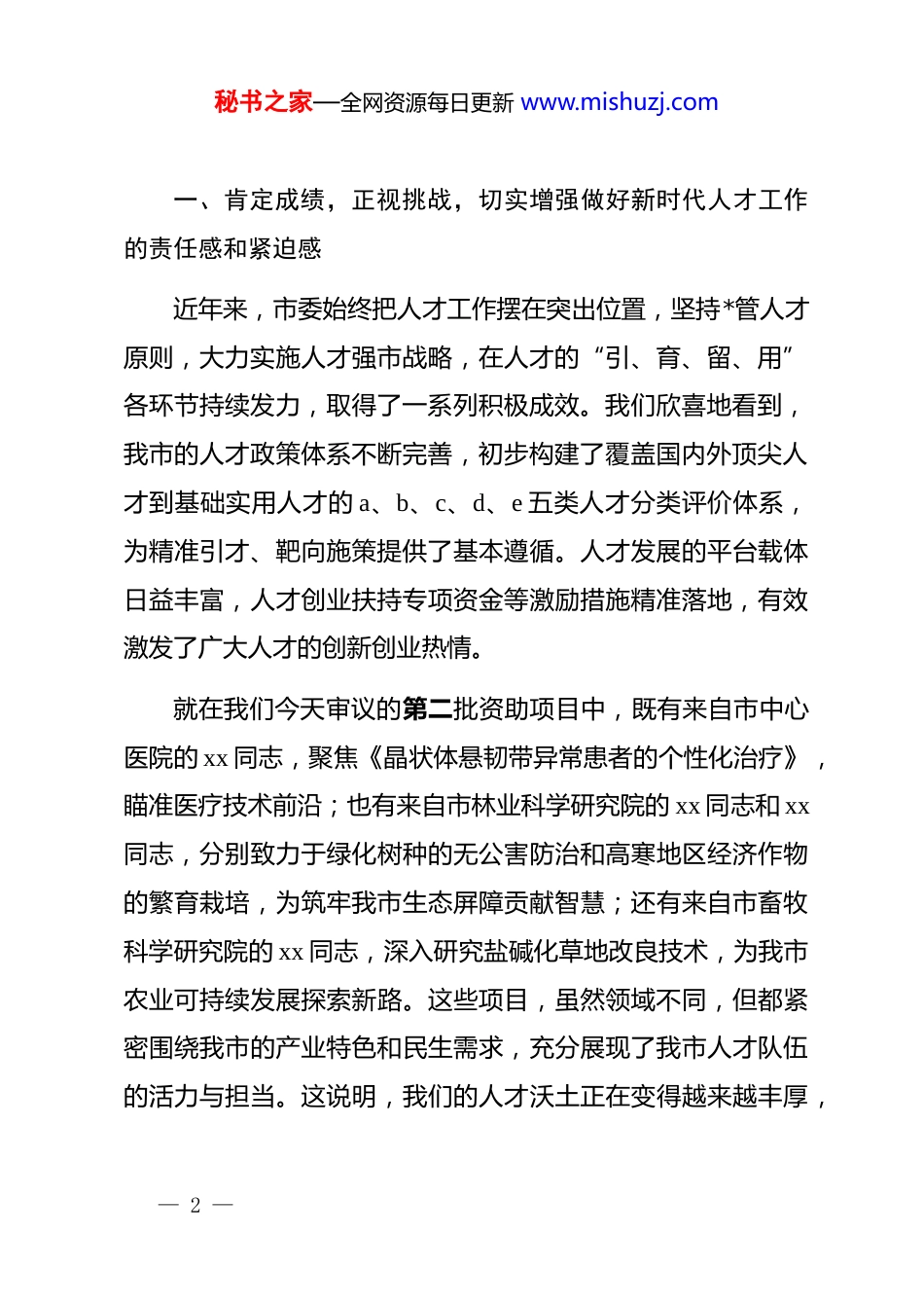 秘书之家—全网资源每日更新 www.mishuzj.com在 2025 年市委人才工作领导小组会议上的讲话同志们:今天,我们召开市委人才工作领导小组会议,主要任务是深入分析当前我市人才工作面临的新形势新任务,审议有关文件,研究部署下一阶段的重点工作。刚才,我们共同审议了今年的工作要点、教育科技人才产业一体化发展协作机制以及第二批人才创业扶持专项资金资助项目,这几项工作都很有针对性,也很有分量,标志着我市的人才工作正在向更深层次、更广领域、更高水平迈进。人才是第一资源,是城市发展的核心竞争力。当前,我们正处在纵深实施“一三三四”高质量发展战略、奋力实现全面振兴新突破的关键时期。越是任务艰巨、挑战严峻,我们就越要牢固树立“抓人才就是抓发展,谋人才就是谋未来”的理念,以识才的慧眼、爱才的诚意、用才的胆识、容才的雅量、聚才的良方,把各方面优秀人才集聚到 xx 的振兴发展事业中来。下面,我讲几点意见。— 1 —秘书之家—全网资源每日更新 www.mishuzj.com一、肯定成绩,正视挑战,切实增强做好新时代人才工作的责任感和紧迫感近年来,市委始终把人才工作摆在突出位置,坚持*管人才原则,大力实施人才强市战略,在人才的“引、育、留、用”各环节持续发力,取得了一系列积极成效。我们欣喜地看到,我市的人才政策体系不断完善,初步构建了覆盖国内外顶尖人才到基础实用人才的 a、b、c、d、e 五类人才分类评价体系,为精准引才、靶向施策提供了基本遵循。人才发展的平台载体日益丰富,人才创业扶持专项资金等激励措施精准落地,有效激发了广大人才的创新创业热情。就在我们今天审议的第二批资助项目中,既有来自市中心医院的 xx 同志,聚焦《晶状体悬韧带异常患者的个性化治疗》,瞄准医疗技术前沿;也有来自市林业科学研究院的 xx 同志和 xx同志,分别致力于绿化树种的无公害防治和高寒地区经济作物的繁育栽培,为筑牢我市生态屏障贡献智慧;还有来自市畜牧科学研究院的 xx 同志,深入研究盐碱化草地改良技术,为我市农业可持续发展探索新路。这些项目,虽然领域不同,但都紧密围绕我市的产业特色和民生需求,充分展现了我市人才队伍的活力与担当。这说明,我们的人才沃土正在变得越来越丰厚,— 2 —秘书之家—全网资源每日更新 www.mishuzj.com尊重人才、渴求人才的氛围正在变得越来越浓厚。在肯定成绩的同时,我们更要清醒地看到,对标“一三三四”高质量发展战略的宏伟蓝图,对照兄弟地市“百舸争流、千帆竞发”的引才态势,我市的人才工作仍然面临着不小的挑战。主要体现在:人才总量不足与结构性矛盾并存,特别是在新能源、高端装备制造、农产品精深加工等重点产业集群,领军人才和高技能人才缺口较大;人才发展的体制机制还不够活,破除“四唯”顽疾、为用人单位充分放权赋能的改革举措仍需深化,人才评价、激励、流动机制有待进一步优化;人才生态的“软环境”还有待提升,在提供全周期、精细化、个性化服务方面,我们还有很多工作要做。这些问题,是发展中的问题,也是我们必须下大力气解决的时代课题。全市各级各部门必须提高站位,深化认识,以坐不住的紧迫感、等不起的责任感、慢不得的危机感,把人才工作抓得更紧、更实、更有成效。二、聚焦中心,服务大局,以“一三三四”战略需求为导向汇聚天下英才人才工作的价值,最终要体现在服务经济社会发展上。“一三三四”高质量发展战略是我市当前和今后一个时期发展的总牵引、总抓手。我们所有的人才工作,都必须紧紧围绕这— 3 —秘书之家—全网资源每日更新 www.mishuzj.com个中心,精准对接战略需求,确保“好钢用在刀刃上”,让人才优势转化为产业优势、竞争优势和发展胜势。第一,要紧扣“一个头等大事”集聚农业科技人才。粮食安全是“国之大者”,抓好粮食增产是我市必须扛起的重大政治责任。保障粮食安全,根本在耕地,出路在科技,关键在人才。我们要围绕盐碱地改良治理、高标准农田建设、现代种业振兴、黑土地保护等重点任务,大力引进和培育一批懂农业、爱农村、爱农民的农业科技人才。要支持农业科研院所、农业龙头企业设立首席科学家、首席专家岗位,...