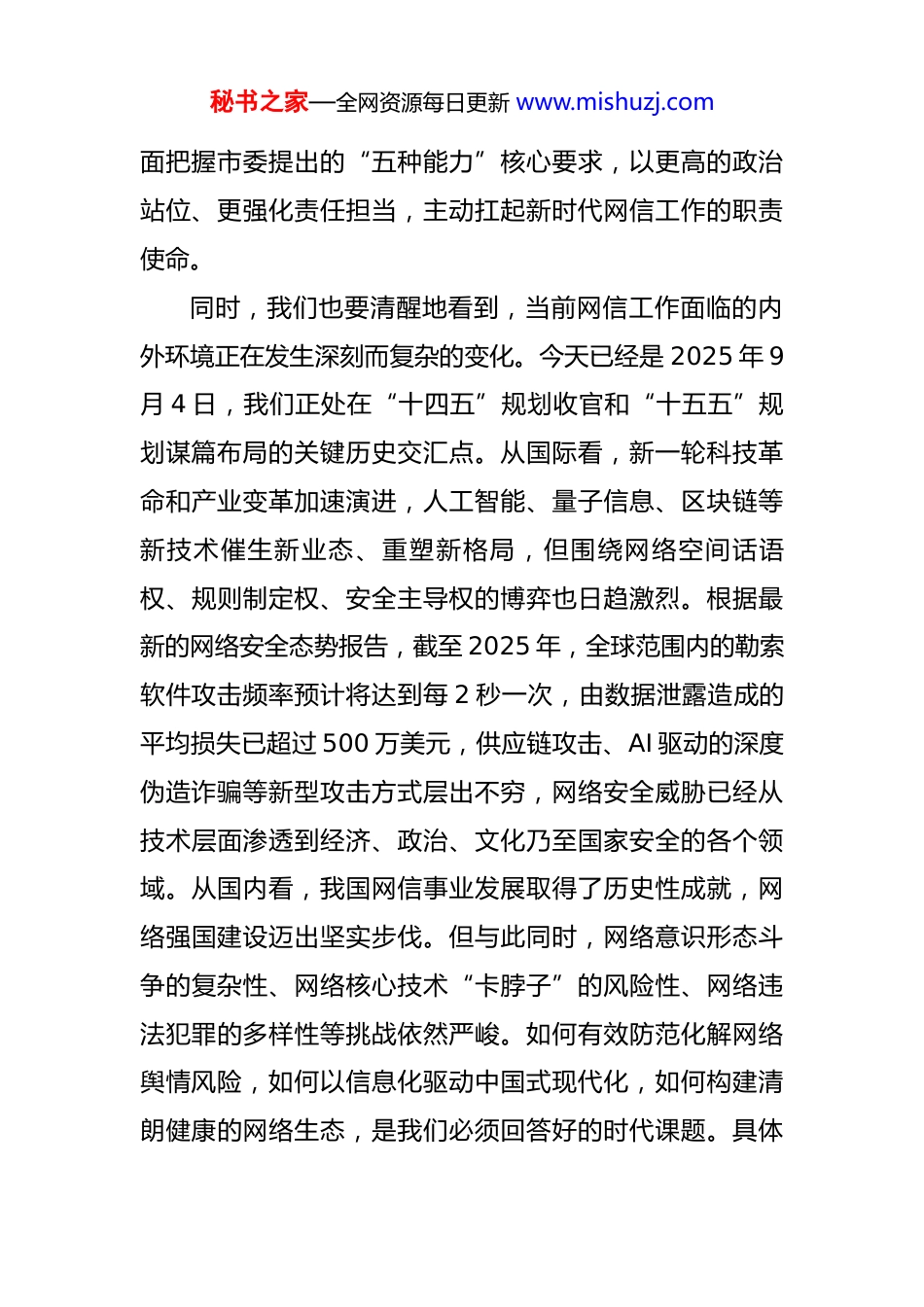 秘书之家—全网资源每日更新 www.mishuzj.com在 2025 年市委网信办网信工作座谈会上的讲话 同志们:今天,我们在这里召开全市网信工作座谈会,主要任务是深入学习传达市委主要领导同志到市委网信办调研座谈时的重要讲话精神,贯彻落实近期召开的推进“十五五”网信规划编制工作视频会议要求,总结前一阶段的工作,分析当前面临的形势,研究部署下一阶段的重点任务。刚才,几位县(市、区)的同志和我们办里的科室负责同志作了很好的发言,谈了认识、讲了问题、提了建议,听了很受启发。下面,我讲三点意见。一、深刻领会精神,在把握大局大势中坚定信心、扛起使命前不久,市委主要领导同志专门到我们市委网信办进行调研指导,与我们亲切座谈,对全市网信工作取得的成绩给予了充分肯定,对我们网信队伍的精神面貌给予了高度评价,并对下一步工作提出了明确要求和殷切期望。这充分体现了市委对网信工作的高度重视、对我们网信干部的亲切关怀。这既是巨大的鼓舞,更是有力的鞭策。全市网信战线的同志们要深刻领会、准确把握市委领导的肯定与期许,将其转化为感恩奋进、砥砺前行的强大动力,全秘书之家—全网资源每日更新 www.mishuzj.com面把握市委提出的“五种能力”核心要求,以更高的政治站位、更强化责任担当,主动扛起新时代网信工作的职责使命。同时,我们也要清醒地看到,当前网信工作面临的内外环境正在发生深刻而复杂的变化。今天已经是 2025 年 9月 4 日,我们正处在“十四五”规划收官和“十五五”规划谋篇布局的关键历史交汇点。从国际看,新一轮科技革命和产业变革加速演进,人工智能、量子信息、区块链等新技术催生新业态、重塑新格局,但围绕网络空间话语权、规则制定权、安全主导权的博弈也日趋激烈。根据最新的网络安全态势报告,截至 2025 年,全球范围内的勒索软件攻击频率预计将达到每 2 秒一次,由数据泄露造成的平均损失已超过 500 万美元,供应链攻击、AI 驱动的深度伪造诈骗等新型攻击方式层出不穷,网络安全威胁已经从技术层面渗透到经济、政治、文化乃至国家安全的各个领域。从国内看,我国网信事业发展取得了历史性成就,网络强国建设迈出坚实步伐。但与此同时,网络意识形态斗争的复杂性、网络核心技术“卡脖子”的风险性、网络违法犯罪的多样性等挑战依然严峻。如何有效防范化解网络舆情风险,如何以信息化驱动中国式现代化,如何构建清朗健康的网络生态,是我们必须回答好的时代课题。具体秘书之家—全网资源每日更新 www.mishuzj.com到我们*市,全市网信工作在市委的坚强领导下,稳中有进、亮点纷呈。但我们也要正视存在的短板和不足:部分县(市、区)对网信工作的战略性、基础性地位认识还不够到位;网络安全防护体系仍存在薄弱环节,关键信息基础设施安全保障能力有待进一步提升;网络综合治理的精细化、法治化水平还有提升空间;网信人才队伍建设与飞速发展的网信事业还不完全匹配。因此,全市网信系统的同志们必须胸怀“国之大者”,把思想和行动统一到中央、省委和市委的决策部署上来,既要从市委领导的肯定中汲取奋进力量,振奋信心、鼓足干劲;也要从严峻复杂的形势中看到挑战,增强忧患意识、底线思维,以“时时放心不下”的责任感和“事事落实到位”的执行力,奋力开创我市网信工作新局面。二、聚焦“一二三四五六”工作思路,在新征程上展现新作为做好当前和今后一个时期的网信工作,必须要有清晰的思路和明确的抓手。结合市委网信委年度工作要点和市委领导的指示要求,我们初步确立了“一二三四五六”的总体工作思路,以此作为统揽全市网信工作的总纲。“一”就是紧扣“一个核心”。这个核心就是坚持和加强党对网信工作的全面领导。这是网信工作的根本原则和秘书之家—全网资源每日更新 www.mishuzj.com最大政治优势。我们必须始终把政治建设摆在首位,不断提高政治判断力、政治领悟力、政治执行力,确保网信工作始终沿着正确的政治方向前进。要不折不扣地贯彻落实习近平总书记关于网络强国的重要思想,将其作为我们一切工作的思想旗帜和行动指南。“二”就是统筹“两大主题”。这两大主题就是发展和安全。安全是发展...