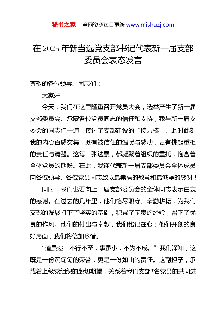 秘书之家—全网资源每日更新 www.mishuzj.com在 2025 年新当选党支部书记代表新一届支部委员会表态发言 尊敬的各位领导、同志们:大家好!今天,我们在这里隆重召开党员大会,选举产生了新一届支部委员会。承蒙各位党员同志的信任和支持,我与新一届支委会的同志们一道,接过了支部建设的“接力棒”。此时此刻,我的内心百感交集,既有被信任的温暖与感动,更有挑起重担的责任与清醒。这每一张选票,都凝聚着组织的重托,饱含着全体党员的期盼。在此,我谨代表新一届支部委员会全体成员,向各位领导、各位党员同志致以最崇高的敬意和最诚挚的感谢!同时,我们也要向上一届支部委员会的全体同志表示由衷的感谢。在过去的几年里,他们恪尽职守、辛勤耕耘,为我们支部的发展打下了坚实的基础,积累了宝贵的经验,留下了优良的作风。他们的付出与奉献,我们铭记在心;他们开创的良好局面,我们将倍加珍惜。“道虽迩,不行不至;事虽小,不为不成。”我们深知,这既是一份沉甸甸的荣誉,更是一份如山的责任。这副担子,承载着上级党组织的殷切期望,关系着我们支部*名党员的共同进秘书之家—全网资源每日更新 www.mishuzj.com步,更连接着我们单位高质量发展的宏伟蓝图。作为新任的支部书记,我将与支委会全体同志一道,团结带领全体党员,以归零的心态、冲刺的姿态、赶考的状态,恪尽职守、勤勉工作,决不辜负组织的重托与同志们的信赖。下面,我代表新一届支部委员会,向大家作如下郑重表态:一、高擎思想之旗,在绝对忠诚上当好“领头雁”,让政治本色更加鲜明党支部是党的肌体的“神经末梢”,政治属性是第一属性。我们将始终把政治建设摆在首位,教育引导全体党员深刻领悟“两个确立”的决定性意义,增强“四个意识”、坚定“四个自信”、做到“两个维护”,确保支部始终成为坚强有力的战斗堡垒。(一)把稳“思想之舵”,让理论武装“深”下去。理论上的清醒是政治上坚定的前提。我们将坚持把学习贯彻习近平新时代中国特色社会主义思想作为“第一议题”和首要政治任务。一是学习内容求“全”。系统学习党的二十大精神,深入领会党的二十届四中全会关于坚持和完善中国特色社会主义制度、推进国家治理体系和治理能力现代化的重大决策部署,及时跟进学习最新重要讲话和指示批示精神,确保党的创新理论第一时间传达到每位党员。二是学习形式求“活”。改变“一秘书之家—全网资源每日更新 www.mishuzj.com人读、大家听”的单一模式,综合运用专题研讨、主题党日、“学习强国”挑战赛、红色基地现场教学等多种形式,全年计划组织集中学习不少于*次,专题研讨不少于*次,让理论学习既有“党味”又有“趣味”,推动党的创新理论入脑入心、化为行动。三是学习成果求“实”。大力弘扬理论联系实际的学风,引导党员同志们带着问题学、联系工作学,把学习成果转化为谋划工作的思路、破解难题的举措、推动发展的能力,切实防止“学用两张皮”。(二)校准“行动指标”,让贯彻执行“硬”起来。党支部是贯彻落实党的路线方针政策的“最后一公里”。我们将坚决做到令行禁止、政令畅通,确保上级党委的各项决策部署在支部不折不扣落地生根。一是强化对标对表。自觉将支部工作置于服务中国式现代化、推动单位高质量发展的大局中来谋划,确保支部的工作目标与中心任务同频共振。二是强化责任传导。建立任务清单、责任清单、时限清单“三张清单”,将重点工作任务分解到人、量化到岗,形成“书记带头抓、支委合力抓、党员具体抓”的闭环落实机制,确保事事有人管、件件有着落。三是强化督查问效。对上级部署的重大任务、支部议定的重要事项,我们将定期开展“回头看”,及时发现和解决执行中的偏差和问题,确保各项工作善始善终、善作善成。秘书之家—全网资源每日更新 www.mishuzj.com二、勇担发展之责,在服务大局上当好“排头兵”,让先锋作用更加彰显围绕中心、服务大局是党建工作的生命线。我们将牢固树立“党建做实了就是生产力,做强了就是竞争力”的理念,找准党建工作与业务工作的结合点和发力点,引领全体党员在推动单位高质量发展的实践中建功立业。(一)推动党建业务“深度融合...